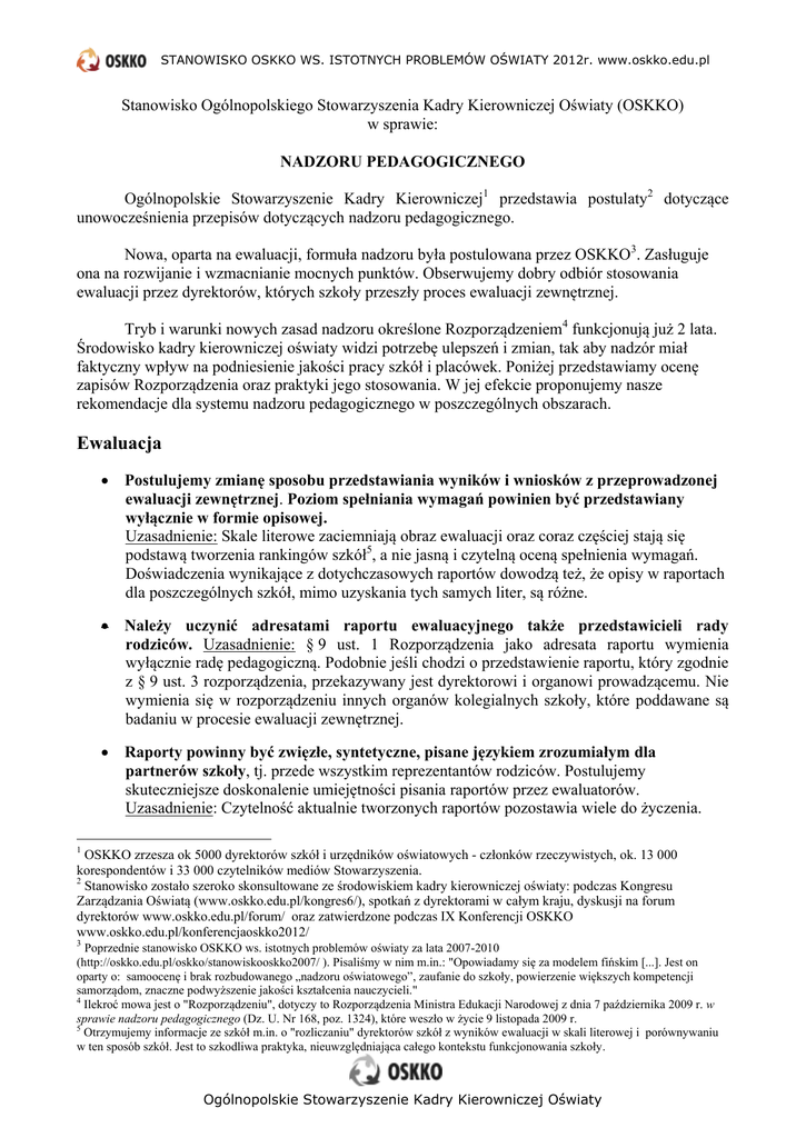 STANOWISKO OSKKO WS. ISTOTNYCH PROBLEMÓW OŚWIATY 2012r. www.oskko.edu.pl Stanowisko Ogólnopolskiego Stowarzyszenia Kadry Kierowniczej Oświaty (OSKKO) w sprawie: NADZORU PEDAGOGICZNEGO Ogólnopolskie Stowarzyszenie Kadry Kierowniczej1 przedstawia postulaty2 dotyczące unowocześnienia przepisów dotyczących nadzoru pedagogicznego. Nowa, oparta na ewaluacji, formuła nadzoru była postulowana przez OSKKO3. Zasługuje ona na rozwijanie i wzmacnianie mocnych punktów. Obserwujemy dobry odbiór stosowania ewaluacji przez dyrektorów, których szkoły przeszły proces ewaluacji zewnętrznej. Tryb i warunki nowych zasad nadzoru określone Rozporządzeniem4 funkcjonują już 2 lata. Środowisko kadry kierowniczej oświaty widzi potrzebę ulepszeń i zmian, tak aby nadzór miał faktyczny wpływ na podniesienie jakości pracy szkół i placówek. Poniżej przedstawiamy ocenę zapisów Rozporządzenia oraz praktyki jego stosowania. W jej efekcie proponujemy nasze rekomendacje dla systemu nadzoru pedagogicznego w poszczególnych obszarach. Ewaluacja Postulujemy zmianę sposobu przedstawiania wyników i wniosków z przeprowadzonej ewaluacji zewnętrznej. Poziom spełniania wymagań powinien być przedstawiany wyłącznie w formie opisowej. Uzasadnienie: Skale literowe zaciemniają obraz ewaluacji oraz coraz częściej stają się podstawą tworzenia rankingów szkół5, a nie jasną i czytelną oceną spełnienia wymagań. Doświadczenia wynikające z dotychczasowych raportów dowodzą też, że opisy w raportach dla poszczególnych szkół, mimo uzyskania tych samych liter, są różne. Należy uczynić adresatami raportu ewaluacyjnego także przedstawicieli rady rodziców. Uzasadnienie: § 9 ust. 1 Rozporządzenia jako adresata raportu wymienia wyłącznie radę pedagogiczną. Podobnie jeśli chodzi o przedstawienie raportu, który zgodnie z § 9 ust. 3 rozporządzenia, przekazywany jest dyrektorowi i organowi prowadzącemu. Nie wymienia się w rozporządzeniu innych organów kolegialnych szkoły, które poddawane są badaniu w procesie ewaluacji zewnętrznej. Raporty powinny być zwięzłe, syntetyczne, pisane językiem zrozumiałym dla partnerów szkoły, tj. przede wszystkim reprezentantów rodziców. Postulujemy skuteczniejsze doskonalenie umiejętności pisania raportów przez ewaluatorów. Uzasadnienie: Czytelność aktualnie tworzonych raportów pozostawia wiele do życzenia. OSKKO zrzesza ok 5000 dyrektorów szkół i urzędników oświatowych - członków rzeczywistych, ok. 13 000 korespondentów i 33 000 czytelników mediów Stowarzyszenia. 2 Stanowisko zostało szeroko skonsultowane ze środowiskiem kadry kierowniczej oświaty: podczas Kongresu Zarządzania Oświatą (www.oskko.edu.pl/kongres6/), spotkań z dyrektorami w całym kraju, dyskusji na forum dyrektorów www.oskko.edu.pl/forum/ oraz zatwierdzone podczas IX Konferencji OSKKO www.oskko.edu.pl/konferencjaoskko2012/ 1 3 Poprzednie stanowisko OSKKO ws. istotnych problemów oświaty za lata 2007-2010 (http://oskko.edu.pl/oskko/stanowiskooskko2007/ ). Pisaliśmy w nim m.in.: "Opowiadamy się za modelem fińskim [...]. Jest on oparty o: samoocenę i brak rozbudowanego „nadzoru oświatowego”, zaufanie do szkoły, powierzenie większych kompetencji samorządom, znaczne podwyższenie jakości kształcenia nauczycieli." 4 Ilekroć mowa jest o "Rozporządzeniu", dotyczy to Rozporządzenia Ministra Edukacji Narodowej z dnia 7 października 2009 r. w sprawie nadzoru pedagogicznego (Dz. U. Nr 168, poz. 1324), które weszło w życie 9 listopada 2009 r. 5 Otrzymujemy informacje ze szkół m.in. o "rozliczaniu" dyrektorów szkół z wyników ewaluacji w skali literowej i porównywaniu w ten sposób szkół. Jest to szkodliwa praktyka, nieuwzględniająca całego kontekstu funkcjonowania szkoły. Ogólnopolskie Stowarzyszenie Kadry Kierowniczej Oświaty STANOWISKO OSKKO WS. ISTOTNYCH PROBLEMÓW OŚWIATY 2012r. www.oskko.edu.pl Przykładowa skrócona wersja raportu z LO zawiera 54 strony, z licznymi powtórzeniami w tekście, o niskim poziomie syntezy. Postulujemy odstąpienie od przeprowadzania ewaluacji problemowych6. Należy przenieść nacisk na ewaluację całościową oraz efektywnie wesprzeć szkoły w dokonywaniu ewaluacji wewnętrznej7, jako najistotniejszej dla ulepszenia pracy szkoły. Uzasadnienie: często, na podstawie cząstkowej ewaluacji, mówi się o jakości całości pracy szkoły. Jednocześnie zdarza się, iż ewaluacja problemowa trwa tyle samo co ewaluacja całościowa. Priorytetem należy uczynić ewaluację wewnętrzną, najistotniejszą dla jakości pracy szkoły. Uzasadnienie: Autoewaluacja, refleksja dokonywana w szkole najskuteczniej motywuje nauczycieli do lepszej pracy. Należy jednocześnie jakość przeprowadzania ewaluacji wewnętrznej uczynić jednym z najważniejszych kryteriów ewaluacji zewnętrznej. Proponujemy otwarcie naboru na funkcje ewaluatorów i opracowanie kryteriów tego naboru z wykazem wymaganych kompetencji i zakresu zadań. Należy stworzyć silne wsparcie w zakresie doskonalenia ewaluatorów pod kątem ww. opracowanego zakresu kompetencji. Uzasadnienie: Kluczowe dla jakości ewaluacji są kompetencje ewaluatorów. Poważnym błędem jest ograniczenie naboru na ewaluatorów do li tylko wizytatorów. Nie stanowi to kryterium jakościowego. Zalecamy ograniczanie zadań ewaluatorów8 oraz poziomu obciążenia ich pracą ze względu na niekorzystny dla jakości ewaluacji wpływ dzisiejszych praktyk. Uzasadnienie: Nadmierne obciążenie ewaluatorów pracą i zadaniami jest niekorzystne dla jakości ewaluacji. W praktyce niektórych Kuratoriów Oświaty dostrzegamy, że ewaluatorom powierza się inne zadania, w tym kontrolne, co uważamy za niewłaściwe. Oczekujemy poprawy jakości narzędzi ewaluacyjnych. Uzasadnienie: Zbyt wiele czasu zajmuje ewaluatorom umieszczanie danych w formularzach na platformie ewaluacyjnej, przez co nakład pracy wizytatora jest niewspółmierny do efektów. Nale