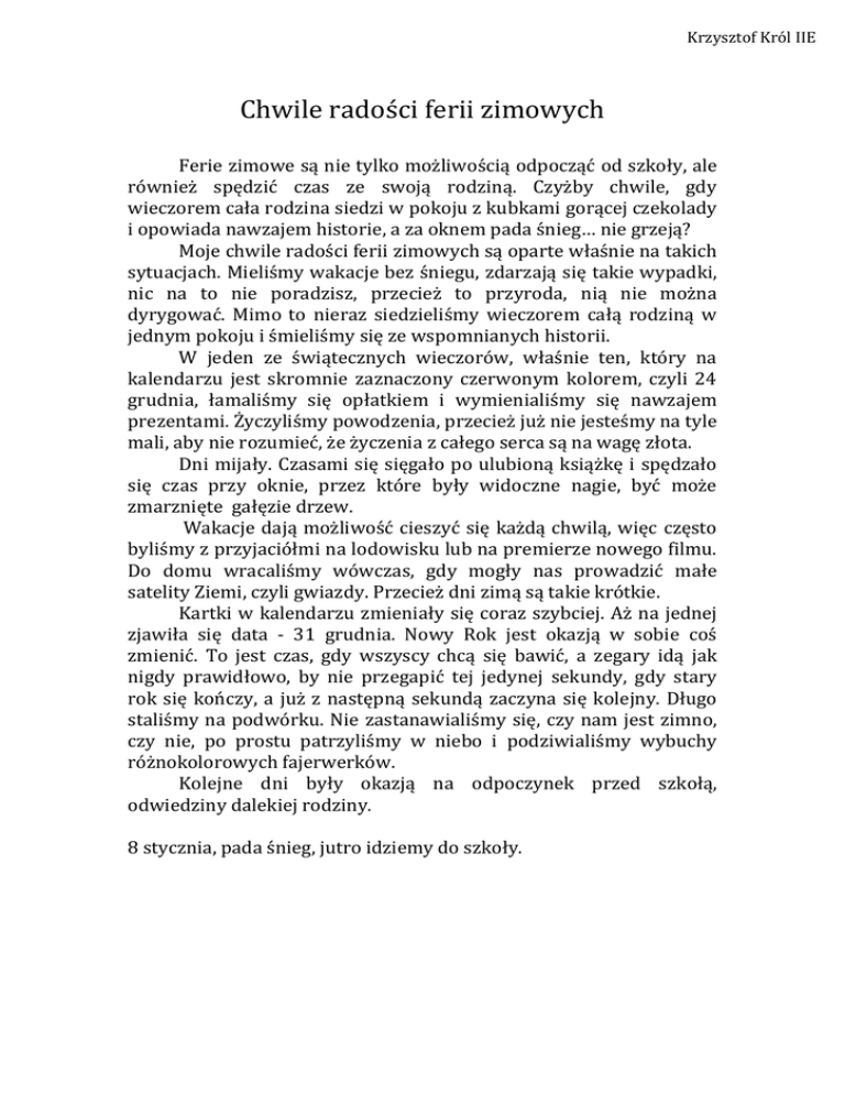 Krzysztof Król IIE Chwile radości ferii zimowych Ferie zimowe są nie tylko możliwością odpocząć od szkoły, ale również spędzić czas ze swoją rodziną. Czyżby chwile, gdy wieczorem cała rodzina siedzi w pokoju z kubkami gorącej czekolady i opowiada nawzajem historie, a za oknem pada śnieg… nie grzeją? Moje chwile radości ferii zimowych są oparte właśnie na takich sytuacjach. Mieliśmy wakacje bez śniegu, zdarzają się takie wypadki, nic na to nie poradzisz, przecież to przyroda, nią nie można dyrygować. Mimo to nieraz siedzieliśmy wieczorem całą rodziną w jednym pokoju i śmieliśmy się ze wspomnianych historii. W jeden ze świątecznych wieczorów, właśnie ten, który na kalendarzu jest skromnie zaznaczony czerwonym kolorem, czyli 24 grudnia, łamaliśmy się opłatkiem i wymienialiśmy się nawzajem prezentami. Życzyliśmy powodzenia, przecież już nie jesteśmy na tyle mali, aby nie rozumieć, że życzenia z całego serca są na wagę złota. Dni mijały. Czasami się sięgało po ulubioną książkę i spędzało się czas przy oknie, przez które były widoczne nagie, być może zmarznięte gałęzie drzew. Wakacje dają możliwość cieszyć się każdą chwilą, więc często byliśmy z przyjaciółmi na lodowisku lub na premierze nowego filmu. Do domu wracaliśmy wówczas, gdy mogły nas prowadzić małe satelity Ziemi, czyli gwiazdy. Przecież dni zimą są takie krótkie. Kartki w kalendarzu zmieniały się coraz szybciej. Aż na jednej zjawiła się data - 31 grudnia. Nowy Rok jest okazją w sobie coś zmienić. To jest czas, gdy wszyscy chcą się bawić, a zegary idą jak nigdy prawidłowo, by nie przegapić tej jedynej sekundy, gdy stary rok się kończy, a już z następną sekundą zaczyna się kolejny. Długo staliśmy na podwórku. Nie zastanawialiśmy się, czy nam jest zimno, czy nie, po prostu patrzyliśmy w niebo i podziwialiśmy wybuchy różnokolorowych fajerwerków. Kolejne dni były okazją na odpoczynek przed szkołą, odwiedziny dalekiej rodziny. 8 stycznia, pada śnieg, jutro idziemy do szkoły.