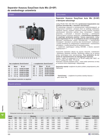 Separator tłuszczu EasyClean Auto Mix (D+SP) do swobodnego ustawienia Opis produktu Produkt Separator tłuszczu EasyClean Auto Mix (D+SP) z tworzywa sztucznego H [m] 16 14 12 10 8 6 4 2 według PN-EN 1825 i DIN 4040-100 z opróżnianiem bezpośrednim oraz systemem Schredder-Mix, z okienkiem wziernikowym. Do swobodnego ustawienia w pomieszczeniach nieprzemarzających, ze zintegrowanym osadnikiem i pochyłym dnem do szybkiego opróżniania, nachylenie pokrywy umożliwia optymalną kontrolę wizualną wszystkich zabudowanych elementów podczas pracy, konserwacji i inspekcji generalnej, z pokrywami z tworzywa sztucznego z zamknięciem szybkomocującym szczelnym zapachowo, z mechanizmem zasysającym do wspólnego opróżniania osadnika i komory separowania, z przyłączem bagnetowym R 2 1/2” do podłączenia do wozu asenizacyjnego. Sterowany automatycznie system Schredder-Mix, z mechanizmem mieszającym i płuczącym za pomocą dysz strumieniowych i stożkowych, z pompą zewnętrzną ze zintegrowanym rozdrabniaczem i mechanizmem odcinającym, z szafką sterowniczą do sterowania pompą, z urządzeniem napełniającym według DIN1988, z dwoma zaworami magnetycznymi 1". 3,0 kW 5 10 15 20 25 30 35 40 45 50 55 Q [m3/h] bez urządzenia SonicControl NS Masa NS 2 NS 3 NS 4 NS 7 NS 10 150 kg 155 kg 168 kg 216 kg 262 kg z urządzeniem SonicControl* NS NS 2 NS 3 NS 4 NS 7 NS 10 Nr art. 93 002.01/DSP 93 003.01/DSP 93 004.01/DSP 93 007.01/DSP 93 010.01/DSP Masa 150 kg 155 kg 168 kg 216 kg 262 kg Nr art. 93 002.02/DSP 93 003.02/DSP 93 004.02/DSP 93 007.02/DSP 93 010.02/DSP Czyszczenie separatora odbywa się poprzez mieszanie, rozdrabnianie i spłukiwanie zawartości zbiornika. Opróżnianie odbywa się za pomocą pompy opróżniającej wozu asenizacyjnego. Przy opróżnianiu nie dochodzi do rozprzestrzeniania się nieprzyjemnych zapachów. Dopływ i odpływ do podłączenia do rur PE-HD według DIN 19537, rur PVC HT według DIN 19560, PP lub AS. Wykonanie: kierunek przepływu prawy – może zostać zamieniony na lewy po zamianie króćca dopływowego i odpływowego Opcjonalny osprzęt: urządzenie do poboru próbek, przepompownia, pilot, TeleControl * SonicControl – urządzenie do pomiaru warstwy tłuszczu – patrz strona 188 Inne wielkości nominalne na zapytanie. Rysunek wymiarowy DA = Średnica zewnętrzna b1 = Wymiary po ustawieniu l DN 100 h3 Separatory h1 h2 DN 100 DA 75 420 b a b1 4 Wskazówki techniczne patrz strona 184 Wielk. nom. DN DA a NS 21) NS 3 NS 4 NS 7 NS 10 100 100 100 150 150 110 110 110 160 160 1500 1500 1880 1910 2590 180 Wymiary l x b 1735 1735 2115 2145 2820 680 680 680 940 940 b1 h1 h2 h3 860 860 860 1130 1130 985 985 985 1185 1185 1055 1055 1055 1255 1255 1435 1435 1435 1655 1655 Pojemność Separator Osadnik 200 l 300 l 400 l 700 l 1000 l 400 l 300 l 400 l 650 l 900 l Całkowita Tłuszcz odseparow. pojemność 600 l 100 l 600 l 120 l 800 l 160 l 1350 l 280 l 1900 l 400 l
