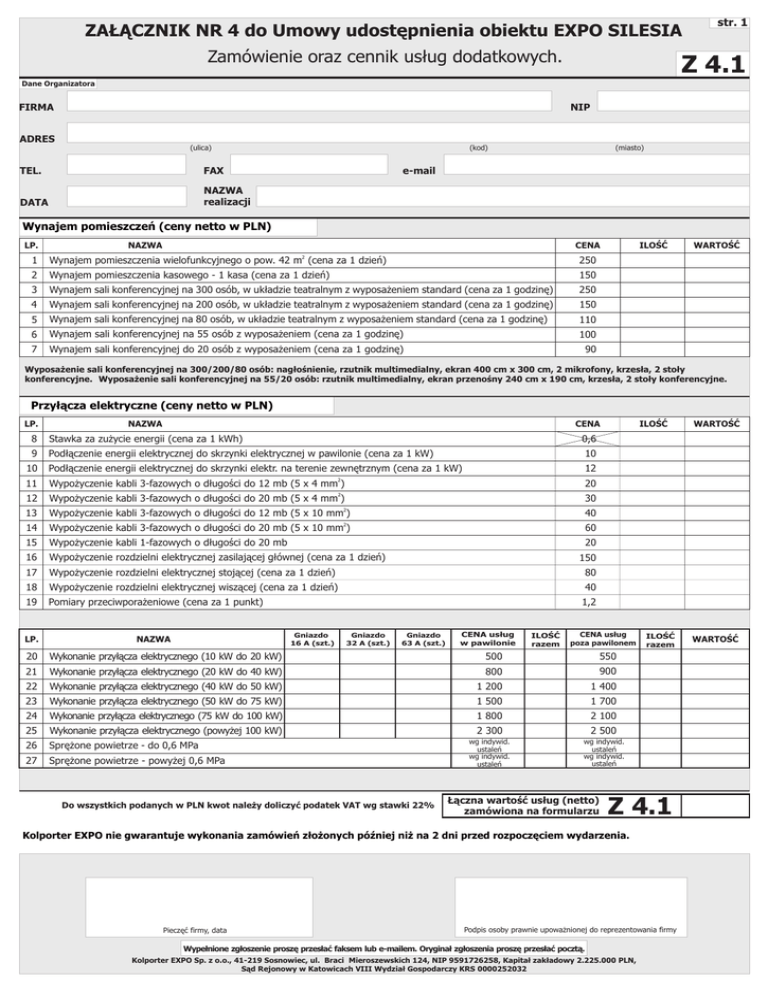 ZAŁĄCZNIK NR 4 do Umowy udostępnienia obiektu EXPO SILESIA Zamówienie oraz cennik usług dodatkowych. str. 1 Z 4.1 Dane Organizatora FIRMA NIP ADRES (ulica) TEL. FAX DATA NAZWA realizacji (kod) (miasto) e-mail Wynajem pomieszczeń (ceny netto w PLN) LP. NAZWA ILOŚĆ CENA 1 Wynajem pomieszczenia wielofunkcyjnego o pow. 42 m2 (cena za 1 dzień) 250 2 Wynajem pomieszczenia kasowego - 1 kasa (cena za 1 dzień) 150 250 3 Wynajem sali konferencyjnej na 300 osób, w układzie teatralnym z wyposażeniem standard (cena za 1 godzinę) 4 Wynajem sali konferencyjnej na 200 osób, w układzie teatralnym z wyposażeniem standard (cena za 1 godzinę) 150 5 Wynajem sali konferencyjnej na 80 osób, w układzie teatralnym z wyposażeniem standard (cena za 1 godzinę) 110 6 Wynajem sali konferencyjnej na 55 osób z wyposażeniem (cena za 1 godzinę) 100 7 Wynajem sali konferencyjnej do 20 osób z wyposażeniem (cena za 1 godzinę) 90 WARTOŚĆ Wyposażenie sali konferencyjnej na 300/200/80 osób: nagłośnienie, rzutnik multimedialny, ekran 400 cm x 300 cm, 2 mikrofony, krzesła, 2 stoły konferencyjne. Wyposażenie sali konferencyjnej na 55/20 osób: rzutnik multimedialny, ekran przenośny 240 cm x 190 cm, krzesła, 2 stoły konferencyjne. Przyłącza elektryczne (ceny netto w PLN) LP. 8 9 10 NAZWA CENA Stawka za zużycie energii (cena za 1 kWh) 0,6 Podłączenie energii elektrycznej do skrzynki elektrycznej w pawilonie (cena za 1 kW) 10 Podłączenie energii elektrycznej do skrzynki elektr. na terenie zewnętrznym (cena za 1 kW) 12 2 11 Wypożyczenie kabli 3-fazowych o długości do 12 mb (5 x 4 mm ) 20 12 Wypożyczenie kabli 3-fazowych o długości do 20 mb (5 x 4 mm2) 30 13 Wypożyczenie kabli 3-fazowych o długości do 12 mb (5 x 10 mm2) 40 14 Wypożyczenie kabli 3-fazowych o długości do 20 mb (5 x 10 mm2) 60 15 Wypożyczenie kabli 1-fazowych o długości do 20 mb 16 Wypożyczenie rozdzielni elektrycznej zasilającej głównej (cena za 1 dzień) 17 Wypożyczenie rozdzielni elektrycznej stojącej (cena za 1 dzień) ILOŚĆ 20 150 80 18 Wypożyczenie rozdzielni elektrycznej wiszącej (cena za 1 dzień) 40 19 Pomiary przeciwporażeniowe (cena za 1 punkt) 1,2 LP. NAZWA Gniazdo 16 A (szt.) Gniazdo 32 A (szt.) Gniazdo 63 A (szt.) CENA usług w pawilonie ILOŚĆ razem CENA usług poza pawilonem 20 Wykonanie przyłącza elektrycznego (10 kW do 20 kW) 500 550 21 Wykonanie przyłącza elektrycznego (20 kW do 40 kW) 800 900 22 Wykonanie przyłącza elektrycznego (40 kW do 50 kW) 1 200 1 400 23 Wykonanie przyłącza elektrycznego (50 kW do 75 kW) 1 500 1 700 2 100 24 Wykonanie przyłącza elektrycznego (75 kW do 100 kW) 1 800 25 Wykonanie przyłącza elektrycznego (powyżej 100 kW) 2 300 2 500 26 Sprężone powietrze - do 0,6 MPa 27 Sprężone powietrze - powyżej 0,6 MPa wg indywid. ustaleń wg indywid. ustaleń wg indywid. ustaleń wg indywid. ustaleń Do wszystkich podanych w PLN kwot należy doliczyć podatek VAT wg stawki 22% Łączna wartość usług (netto) zamówiona na formularzu ILOŚĆ razem Z 4.1 Kolporter EXPO nie gwarantuje wykonania zamówień złożonych później niż na 2 dni przed rozpoczęciem wydarzenia. Pieczęć firmy, data WARTOŚĆ Podpis osoby prawnie upoważnionej do reprezentowania firmy Wypełnione zgłoszenie proszę przesłać faksem lub e-mailem. Oryginał zgłoszenia proszę przesłać pocztą. Kolporter EXPO Sp. z o.o., 41-219 Sosnowiec, ul. Braci Mieroszewskich 124, NIP 9591726258, Kapitał zakładowy 2.225.000 PLN, Sąd Rejonowy w Katowicach VIII Wydział Gospodarczy KRS 0000252032 WARTOŚĆ ZAŁĄCZNIK NR 4 do Umowy udostępnienia obiektu EXPO SILESIA Zamówienie oraz cennik usług dodatkowych. str. 2 Z 4.2 Dane Organizatora FIRMA NIP ADRES (ulica) TEL. FAX DATA NAZWA realizacji (kod) (miasto) e-mail Inne media i usługi (ceny netto w PLN) LP. NAZWA ILOŚĆ CENA Dostęp bezprzewodowy do Internetu - 1 przyłącze 180 29 Doprowadzenie wody z odpływem w pawilonie (cena za 1 punkt) 250 30 Doprowadzenie wody z odpływem na terenie zewnętrznym (cena za 1 punkt) 300 31 Stawka za zużycie gazu (cena za 1 m3) 2,50 32 Stawka za zużycie wody (cena za 1 m3) 28 9,34 2 33 Sprzątanie powierzchni stoisk w trakcie imprezy (cena za 1 m /dzień) 34 Wywóz śmieci (cena za 1 kontener o obj. 30 m3) 2,0 1 200 35 Wywóz śmieci (cena za 1 kontener o obj. 1100 L.) 36 Wynajem powierzchni magazynowej (cena za 1 m2/dzień) 37 Przedłużenie godzin funkcjonowania pawilonu w okresie montażu i demontażu (cena za 1 godzinę) 100 10 600 38 Ochrona w godz. 6.00 - 22.00 (cena za 1 osobo/godzinę) 22 39 Ochrona w godz. 22.00 - 6.00 (cena za 1 osobo/godzinę) 25 40 Uruchomienie punktu medycznego (cena za 1 godz.) 41 Obowiązkowy dyżur strażaka w trakcie imprezy (cena za dzień - 8 godz.) 400 42 Hostessa (cena za 1 dzień) 220 43 Wypożyczenie aparatury multimedialnej (rzutnik + ekran) (cena za dzień - 8 godz.) 300 44 Wypożyczenie flagi narodowej na czas trwania imprezy(cena za 1 sztukę, w tym 40 PLN kaucji) 45 Zawieszenie i przymocowanie do konstrukcji stałej pawilonu elementów Wystawcy - cena za 1 punkt 700 46 Udostępnienie radiowęzła z wyposażeniem wraz z opłatą ZAiKS - cena za 1 dzień 230 Do wszystkich podanych w PLN kwot należy doliczyć podatek VAT wg stawki 22% 300 60 Łączna wartość usług (netto) zamówiona na formularzu Z 4.2 Kolporter EXPO nie gwarantuje wykonania zamówień złożonych później niż na 2 dni przed rozpoczęciem wydarzenia. Pieczęć firmy, data Podpis osoby prawnie upoważnionej do reprezentowania firmy Wypełnione zgłoszenie proszę przesłać faksem lub e-mailem. Oryginał zgłoszenia proszę przesłać pocztą. Kolporter EXPO Sp. z o.o., 41-219 Sosnowiec, ul. Braci Mieroszewskich 124, NIP 9591726258, Kapitał zakładowy 2.225.000 PLN, Sąd Rejonowy w Katowicach VIII Wydział Gospodarczy KRS 0000252032 WARTOŚĆ