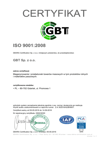 CERTYFIKAT ISO 9001:2008 DEKRA Certification Sp. z o.o. niniejszym potwierdza, że przedsiębiorstwo GBT Sp. z o.o. zakres certyfikacji: Magazynowanie i przeładunek towarów masowych w tym produktów rolnych i materiałów paszowych. certyfikowana siedziba: PL – 80-702 Gdańsk, ul. Promowa 1 wdrożyło system zarządzania jakością zgodnie z ww. normą i skutecznie go realizuje. Wynik auditu udokumentowano w raporcie numer: Z-A 302516/A2/B/9001. Certyfikat ważny od 05-05-2016 do 14-09-2018 Nr rejestracyjny certyfikatu: 000516030 DEKRA Certification Sp. z o.o. Wrocław; 05-05-2016 QMS DEKRA Certification Sp. z o.o. • Plac Solny 20 • 50 -063 W rocław • www.dekra-certification.com.pl strona 1 z 1