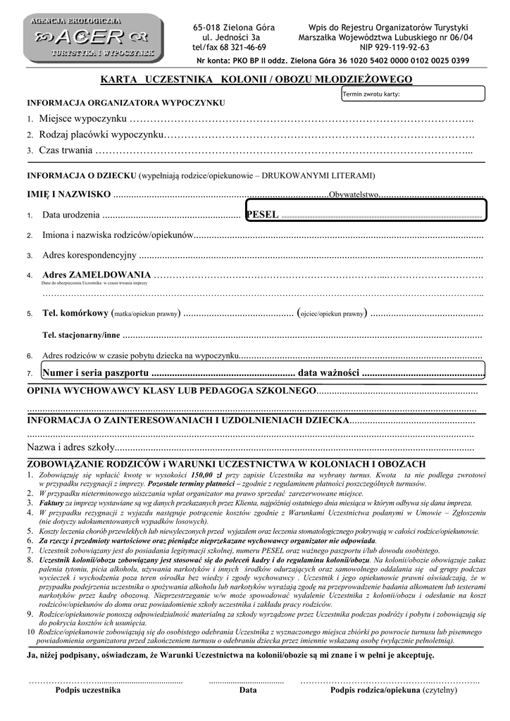 Agencja Ekologiczna „ACER” Turystyka i Wypoczynek 65-018 Zielona Góra ul. Jedności 3a tel/fax 68 321-46-69 Wpis do Rejestru Organizatorów Turystyki Marszałka Województwa Lubuskiego nr 06/04 NIP 929-119-92-63 Nr konta: PKO BP II oddz. Zielona Góra 36 1020 5402 0000 0102 0025 0399 KARTA UCZESTNIKA KOLONII / OBOZU MŁODZIEŻOWEGO Termin zwrotu karty: INFORMACJA ORGANIZATORA WYPOCZYNKU 1. Miejsce wypoczynku ……………………………………………………………………………………….. 2. Rodzaj placówki wypoczynku………………………………………………………………………………. 3. Czas trwania ………………………………………………………………………………………………... INFORMACJA O DZIECKU (wypełniają rodzice/opiekunowie – DRUKOWANYMI LITERAMI) IMIĘ I NAZWISKO ....................................................................................Obywatelstwo......................................... 1. Data urodzenia ...................................................... PESEL .............................................................................. 2. Imiona i nazwiska rodziców/opiekunów................................................................................................................. 3. Adres korespondencyjny ...................................................................................................................................... 4. Adres ZAMELDOWANIA ………………………………………………………………...…………………………. Dane do ubezpieczenia Uczestnika w czasie trwania imprezy ……………………………………………………………………………………………………………………………………….. 5. Tel. komórkowy (matka/opiekun prawny) ........................................... Tel. stacjonarny/inne (ojciec/opiekun prawny) ............................................ ............................................................................................................................................ 6. Adres rodziców w czasie pobytu dziecka na wypoczynku............................................................................................... 7. Numer i seria paszportu ........................................................ data ważności ................................................ OPINIA WYCHOWAWCY KLASY LUB PEDAGOGA SZKOLNEGO............................................................... ............................................................................................................................................................................... INFORMACJA O ZAINTERESOWANIACH I UZDOLNIENIACH DZIECKA................................................. .............................................................................................................................................................................. Nazwa i adres szkoły............................................................................................................................................ ZOBOWIĄZANIE RODZICÓW i WARUNKI UCZESTNICTWA W KOLONIACH I OBOZACH 1. Zobowiązuję się wpłacić kwotę w wysokości 150,00 zł przy zapisie Uczestnika na wybrany turnus. Kwota ta nie podlega zwrotowi w przypadku rezygnacji z imprezy. Pozostałe terminy płatności – zgodnie z regulaminem płatności poszczególnych turnusów. 2. W przypadku nieterminowego uiszczania wpłat organizator ma prawo sprzedać zarezerwowane miejsce. 3. Faktury za imprezę wystawiane są wg danych przekazanych przez Klienta, najpóźniej ostatniego dnia miesiąca w którym odbywa się dana impreza. 4. W przypadku rezygnacji z wyjazdu następuje potrącenie kosztów zgodnie z Warunkami Uczestnictwa podanymi w Umowie – Zgłoszeniu (nie dotyczy udokumentowanych wypadków losowych). Koszty leczenia chorób przewlekłych lub niewyleczonych przed wyjazdem oraz leczenia stomatologicznego pokrywają w całości rodzice/opiekunowie. Za rzeczy i przedmioty wartościowe oraz pieniądze nieprzekazane wychowawcy organizator nie odpowiada. Uczestnik zobowiązany jest do posiadania legitymacji szkolnej, numeru PESEL oraz ważnego paszportu i/lub dowodu osobistego. Uczestnik kolonii/obozu zobowiązany jest stosować się do poleceń kadry i do regulaminu kolonii/obozu. Na kolonii/obozie obowiązuje zakaz palenia tytoniu, picia alkoholu, używania narkotyków i innych środków odurzających oraz samowolnego oddalania się od grupy podczas wycieczek i wychodzenia poza teren ośrodka bez wiedzy i zgody wychowawcy . Uczestnik i jego opiekunowie prawni oświadczają, że w przypadku podejrzenia uczestnika o spożywania alkoholu lub narkotyków wyrażają zgodę na przeprowadzenie badania alkomatem lub testerami narkotyków przez kadrę obozową. Nieprzestrzeganie w/w może spowodować wydalenie Uczestnika z kolonii/obozu i odesłanie na koszt rodziców/opiekunów do domu oraz powiadomienie szkoły uczestnika i zakładu pracy rodziców. 9. Rodzice/opiekunowie ponoszą odpowiedzialność materialną za szkody wyrządzone przez Uczestnika podczas podróży i pobytu i zobowiązują się do pokrycia kosztów ich usunięcia. 10 Rodzice/opiekunowie zobowiązują się do osobistego odebrania Uczestnika z wyznaczonego miejsca zbiórki po powrocie turnusu lub pisemnego powiadomienia organizatora przed zakończeniem turnusu o odebraniu dziecka przez imiennie wskazaną osobę (wyłącznie pełnoletnią). 5. 6. 7. 8. Ja, niżej podpisany, oświadczam, że Warunki Uczestnictwa na kolonii/obozie są mi znane i w pełni je akceptuję. ……………………........................................ Podpis uczestnika ................................... Data ………………………………………..…………….. Podpis rodzica/opiekuna (czytelny) INFORMACJA O STANIE ZDROWIA DZIECKA (wypełniają rodzice) Pieczęć pośrednic
