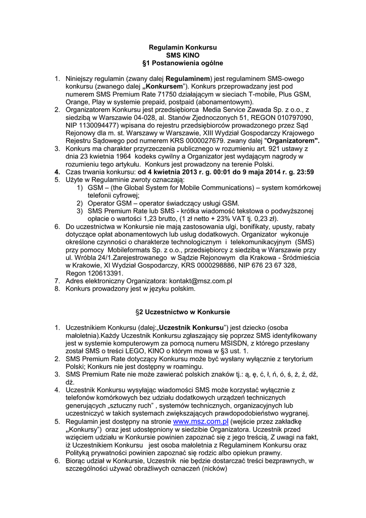 Regulamin Konkursu SMS KINO §1 Postanowienia ogólne 1. Niniejszy regulamin (zwany dalej Regulaminem) jest regulaminem SMS-owego konkursu (zwanego dalej „Konkursem”). Konkurs przeprowadzany jest pod numerem SMS Premium Rate 71750 działającym w sieciach T-mobile, Plus GSM, Orange, Play w systemie prepaid, postpaid (abonamentowym). 2. Organizatorem Konkursu jest przedsiębiorca Media Service Zawada Sp. z o.o., z siedzibą w Warszawie 04-028, al. Stanów Zjednoczonych 51, REGON 010797090, NIP 1130094477) wpisana do rejestru przedsiębiorców prowadzonego przez Sąd Rejonowy dla m. st. Warszawy w Warszawie, XIII Wydział Gospodarczy Krajowego Rejestru Sądowego pod numerem KRS 0000027679. zwany dalej "Organizatorem". 3. Konkurs ma charakter przyrzeczenia publicznego w rozumieniu art. 921 ustawy z dnia 23 kwietnia 1964 kodeks cywilny a Organizator jest wydającym nagrody w rozumieniu tego artykułu. Konkurs jest prowadzony na terenie Polski. 4. Czas trwania konkursu: od 4 kwietnia 2013 r. g. 00:01 do 9 maja 2014 r. g. 23:59 5. Użyte w Regulaminie zwroty oznaczają: 1) GSM – (the Global System for Mobile Communications) – system komórkowej telefonii cyfrowej; 2) Operator GSM – operator świadczący usługi GSM. 3) SMS Premium Rate lub SMS - krótka wiadomość tekstowa o podwyższonej opłacie o wartości 1,23 brutto, (1 zł netto + 23% VAT tj. 0,23 zł). 6. Do uczestnictwa w Konkursie nie mają zastosowania ulgi, bonifikaty, upusty, rabaty dotyczące opłat abonamentowych lub usług dodatkowych. Organizator wykonuje określone czynności o charakterze technologicznym i telekomunikacyjnym (SMS) przy pomocy Mobileformats Sp. z o.o., przedsiębiorcy z siedzibą w Warszawie przy ul. Wróbla 24/1.Zarejestrowanego w Sądzie Rejonowym dla Krakowa - Śródmieścia w Krakowie, XI Wydział Gospodarczy, KRS 0000298886, NIP 676 23 67 328, Regon 120613391. 7. Adres elektroniczny Organizatora: [email protected] 8. Konkurs prowadzony jest w języku polskim. §2 Uczestnictwo w Konkursie 1. Uczestnikiem Konkursu (dalej:„Uczestnik Konkursu”) jest dziecko (osoba małoletnia).Każdy Uczestnik Konkursu zgłaszający się poprzez SMS identyfikowany jest w systemie komputerowym za pomocą numeru MSISDN, z którego przesłany został SMS o treści LEGO, KINO o którym mowa w §3 ust. 1. 2. SMS Premium Rate dotyczący Konkursu może być wysłany wyłącznie z terytorium Polski; Konkurs nie jest dostępny w roamingu. 3. SMS Premium Rate nie może zawierać polskich znaków tj.: ą, ę, ć, ł, ń, ó, ś, ż, ź, dź, dż. 4. Uczestnik Konkursu wysyłając wiadomości SMS może korzystać wyłącznie z telefonów komórkowych bez udziału dodatkowych urządzeń technicznych generujących „sztuczny ruch” , systemów technicznych, organizacyjnych lub uczestniczyć w takich systemach zwiększających prawdopodobieństwo wygranej. 5. Regulamin jest dostępny na stronie www.msz.com.pl (wejście przez zakładkę „Konkursy”) oraz jest udostępniony w siedzibie Organizatora. Uczestnik przed wzięciem udziału w Konkursie powinien zapoznać się z jego treścią, Z uwagi na fakt, iż Uczestnikiem Konkursu jest osoba małoletnia z Regulaminem Konkursu oraz Polityką prywatności powinien zapoznać się rodzic albo opiekun prawny. 6. Biorąc udział w Konkursie, Uczestnik nie będzie dostarczać treści bezprawnych, w szczególności używać obraźliwych oznaczeń (nicków) §3 Przystąpienie do Konkursu 1. Aby wziąć udział w Konkursie należy: a) wysłać w okresie trwania Konkursu SMS na numer Premium Rate 71750 z odpowiedzią na zadanie konkursowe: Wymyśl hasło zawierające słowa: kino, klocki LEGO, poranek filmowy. 2. Przykładowa treść wiadomości SMS, powinna wyglądać następująco: „LEGO.ODPOWIEDŹ”. Uznaje się również małe litery w treści wiadomości. 3. Całkowity koszt jednego SMS, wysłanego na numer Premium Rate 71750, to 1,23 brutto, (1 zł netto + 23% VAT tj. 0,23 zł) za 160 znaków, we wszystkich sieciach Operatorów GSM. Uczestnik nie ponosi żadnych innych kosztów. 4. Uczestnik aby brać udział w Konkursie powinien posiadać telefon komórkowy, z którego można wysłać SMS w sieciach T-mobile, Plus GSM, Orange, Play w systemie prepaid, postpaid (abonamentowym). §4 Zasady Konkursu 1. Każdy Uczestnik może wysłać w Konkursie dowolną liczbę SMS-ów aby zwiększyć swoje szanse w Konkursie. Jeden Uczestnik może uzyskać tylko jedną nagrodę w danej edycji Konkursu. 2. Konkurs polega na wysłaniu odpowiedzi na zadanie konkursowe podane w Regulaminie i nośnikach reklamowych. 3. Jeden numer telefonu MSISDN może być wykorzystany do udziału w Konkursie tylko przez jednego Uczestnika. 4. Po wysłaniu przez Uczestnika wiadomości SMS o treści zgodnej z treścią zawartą w § 3 ust. 1, Uczestnik otrzyma od potwierdzenie udziału w Konkursie w formie zwrotnej wiadomości SMS o treści: „Dziękujemy za udział w Konkursie. Organizator skontaktuje się z Tobą w przypadku wygrania nagrody w terminie 14 dni od zakończenia Konkursu”. §5 Nagrody 1. Nagrodami są a) 5 podwójnych biletów do wybranego kina sieci Helios ufundowane przez firmę Helios Sp. z o.o. o wartości jednostkowej 40 zł brutto; Kod: KINO b) 4 zestawy klocków LEGO City 60044 ufundowane przez firmę LEGO Polska Sp. z o.o. o wartości jednostkowej 130 zł brutto; Kod: LEGO 2. Łączna wartość nagród wynosi 720 zł brutto. §6 Zasady przyznawania nagród 1.Spośród nadesłanych przez Uczestników zadań konkursowych zostanie wybranych 9 osób, które przesłały najciekawsze odpowiedzi. Zostaną one Laureatami Konkursu. Liczba Laureatów jest równa liczbie nagród. 2. Każdy Uczestnik może zdobyć tylko jedną nagrodę w Konkursie. 3. Postanowienia ust. 2 powyżej mają zastosowanie również do tego Uczestnika, który uczestnicząc w Konkursie korzystał z więcej niż 1 numeru telefon MSISDN. 4. Spośród Uczestników Konkursu, którzy dokonali Zgłoszenia do Konkursu. Nagroda przyz