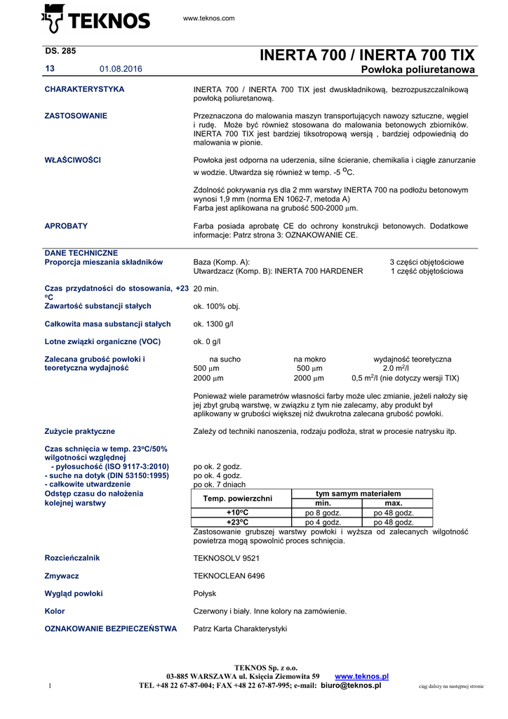 www.teknos.com DS. 285 13 INERTA 700 / INERTA 700 TIX 01.08.2016 Powłoka poliuretanowa CHARAKTERYSTYKA INERTA 700 / INERTA 700 TIX jest dwuskładnikową, bezrozpuszczalnikową powłoką poliuretanową. ZASTOSOWANIE Przeznaczona do malowania maszyn transportujących nawozy sztuczne, węgiel i rudę. Może być również stosowana do malowania betonowych zbiorników. INERTA 700 TIX jest bardziej tiksotropową wersją , bardziej odpowiednią do malowania w pionie. WŁAŚCIWOŚCI Powłoka jest odporna na uderzenia, silne ścieranie, chemikalia i ciągłe zanurzanie w wodzie. Utwardza się również w temp. -5 oC. Zdolność pokrywania rys dla 2 mm warstwy INERTA 700 na podłożu betonowym wynosi 1,9 mm (norma EN 1062-7, metoda A) Farba jest aplikowana na grubość 500-2000 µm. Farba posiada aprobatę CE do ochrony konstrukcji betonowych. Dodatkowe informacje: Patrz strona 3: OZNAKOWANIE CE. APROBATY DANE TECHNICZNE Proporcja mieszania składników Baza (Komp. A): Utwardzacz (Komp. B): INERTA 700 HARDENER 3 części objętościowe 1 część objętościowa Czas przydatności do stosowania, +23 20 min. oC Zawartość substancji stałych ok. 100% obj. Całkowita masa substancji stałych ok. 1300 g/l Lotne związki organiczne (VOC) ok. 0 g/l Zalecana grubość powłoki i teoretyczna wydajność na sucho 500 µm 2000 µm na mokro 500 µm 2000 µm wydajność teoretyczna 2.0 m2/l 2 0,5 m /l (nie dotyczy wersji TIX) Ponieważ wiele parametrów własności farby może ulec zmianie, jeżeli nałoży się jej zbyt grubą warstwę, w związku z tym nie zalecamy, aby produkt był aplikowany w grubości większej niż dwukrotna zalecana grubość powłoki. Zużycie praktyczne Zależy od techniki nanoszenia, rodzaju podłoża, strat w procesie natrysku itp. Czas schnięcia w temp. 23oC/50% wilgotności względnej - pyłosuchość (ISO 9117-3:2010) - suche na dotyk (DIN 53150:1995) - całkowite utwardzenie Odstęp czasu do nałożenia kolejnej warstwy po ok. 2 godz. po ok. 4 godz. po ok. 7 dniach Rozcieńczalnik TEKNOSOLV 9521 Zmywacz TEKNOCLEAN 6496 Wygląd powłoki Połysk Kolor Czerwony i biały. Inne kolory na zamówienie. OZNAKOWANIE BEZPIECZEŃSTWA Patrz Karta Charakterystyki 1 tym samym materiałem min. max. +10oC po 8 godz. po 48 godz. +23oC po 4 godz. po 48 godz. Zastosowanie grubszej warstwy powłoki i wyższa od zalecanych wilgotność powietrza mogą spowolnić proces schnięcia. Temp. powierzchni TEKNOS Sp. z o.o. www.teknos.pl 03-885 WARSZAWA ul. Księcia Ziemowita 59 TEL +48 22 67-87-004; FAX +48 22 67-87-995; e-mail: [email protected] ciąg dalszy na następnej stronie INERTA 700 / INEERTA 700 TIX SPOSÓB STOSOWANIA Przygotowanie podłoża DS 285-13 strona 2 Usunąć z podłoża wszelkie zanieczyszczenia, które mogą niekorzystnie wpływać na proces przygotowania podłoża i malowania. Usunąć również rozpuszczalne w wodzie sole stosując odpowiednie metody. Powierzchnię należy oczyścić zależnie od rodzaju podłoża, jak niżej: Stal: Zgorzelinę i rdzę usunąć przy pomocy obróbki strumieniowo ściernej do uzyskania stopnia czystości Sa 21/2 (ISO 8501-1). Profil chropowatości powierzchni po śrutowaniu musi być przynajmniej szorstki – „rough”(komparator G), patrz norma ISO 8503-2. Powierzchnie malowane nadające się do przemalowania: Wszelkie zanieczyszczenia, które mogą niekorzystnie wpływać na nakładanie farby (np. tłuszcze i sole), usunąć. Powierzchnia musi być czysta i sucha. Stare, pomalowane powierzchnie, które przekroczyły maksymalny odstęp czasu do nałożenia kolejnej warstwy należy zszorstkować. Uszkodzone fragmenty pomalowanej powierzchni należy przygotować do ponownego malowania zgodnie z wymaganiami stawianymi przez rodzaj podłoża i sposób renowacji. Beton: Beton musi mieć, co najmniej 4 tygodnie, być dobrze utwardzony i wytrzymały. Wilgotność betonu nie może przekraczać 97% wilgotności względnej lub 4% wagowo. Mleczko cementowe należy usunąć poprzez śrutowanie, szlifowanie lub piaskowanie. Usunąć luźno związane kruszywo i zapylone warstwy tak aby pozostał zwarty beton. Pozostałości usunąć za pomocą szczotki lub odkurzacza. Powierzchnia powinna być czysta aby nie obniżyć stopnia adhezji. Czas i miejsce przygotowywania powinny być dobrane tak, ażeby powierzchnia przed malowaniem nie była brudna i wilgotna. Warunki podczas aplikacji Powierzchnia do malowania musi być sucha. Temperatura otaczającego powietrza, malowanej powierzchni i farby powinna być wyższa niż +10oC, a wilgotność względna powietrza poniżej 80% zarówno podczas nanoszenia jak i w czasie schnięcia wyrobu. Aplikacja Powierzchnie pionowe: Zaleca się stosowanie bardziej tiksotropowej wersji INERTA 700 TIX. Maksymalna, rekomendowana grubość powłoki wynosi 500 µm. Nakładać za pomocą urządzenia do natrysku materiałów dwuskładnikowych, na gorąco, np. Graco Hydra-Cat, wyposażonego w ogrzewanie (dysza obrotowa o średnicy 0.018 - 0.026”) albo za pomocą pędzla lub wałka malarskiego. Przed użyciem uwzględnić czas przydatności do stosowania. Uwaga: Ilość i temperatura mieszaniny mają wpływ na czas przydatności do stosowania. Utwardzenie się farby w aparacie malarskim może być przyczyną jego uszkodzenia. Przed użyciem składniki muszą być ogrzane do temperatury +20 - +25oC tak, aby były dostatecznie rzadkie i cały czas dopływały do pomp dozujących. Stosunek dozowania składników przez pompy musi wynosić 3:1. Ogrzewanie składników powinno być takie, aby temperatura farby w pistolecie wynosiła +40 - +50oC. Nie podgrzewać utwardzacza. Temperatura mieszaniny w wężu powinna wynosić +30 - +40oC. Czas przydatności mieszaniny do stosowania w tych warunkach wynosi 5 min. Jeśli jest to konieczne to należy również ogrzewać węże. Grubość warstwy kontroluje się grzebieniem malarskim. Utrzymanie prawidłowej proporcji mieszania farby kontroluje się sprawdzając pobór składników przez agregat i c