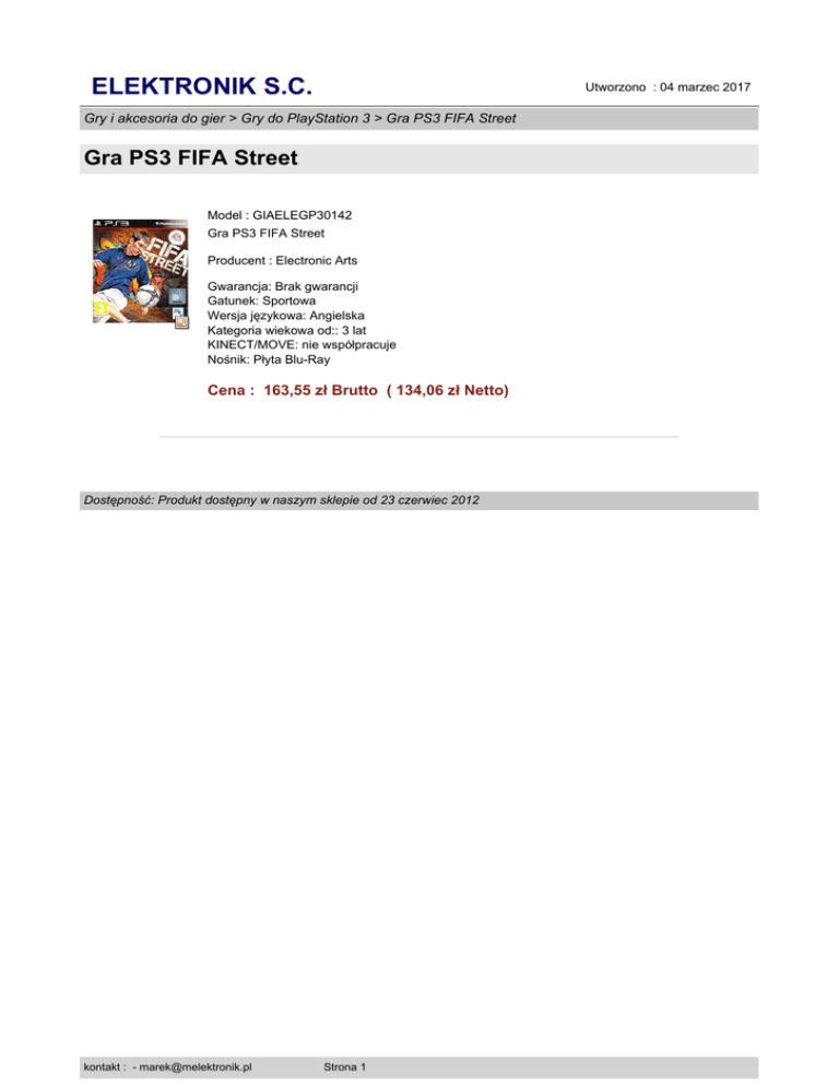 ELEKTRONIK S.C. Utworzono : 04 marzec 2017 Gry i akcesoria do gier > Gry do PlayStation 3 > Gra PS3 FIFA Street Gra PS3 FIFA Street Model : GIAELEGP30142 Gra PS3 FIFA Street Producent : Electronic Arts Gwarancja: Brak gwarancji Gatunek: Sportowa Wersja językowa: Angielska Kategoria wiekowa od:: 3 lat KINECT/MOVE: nie współpracuje Nośnik: Płyta Blu-Ray Cena : 163,55 zł Brutto ( 134,06 zł Netto) Dostępność: Produkt dostępny w naszym sklepie od 23 czerwiec 2012 kontakt : - [email protected] Strona 1