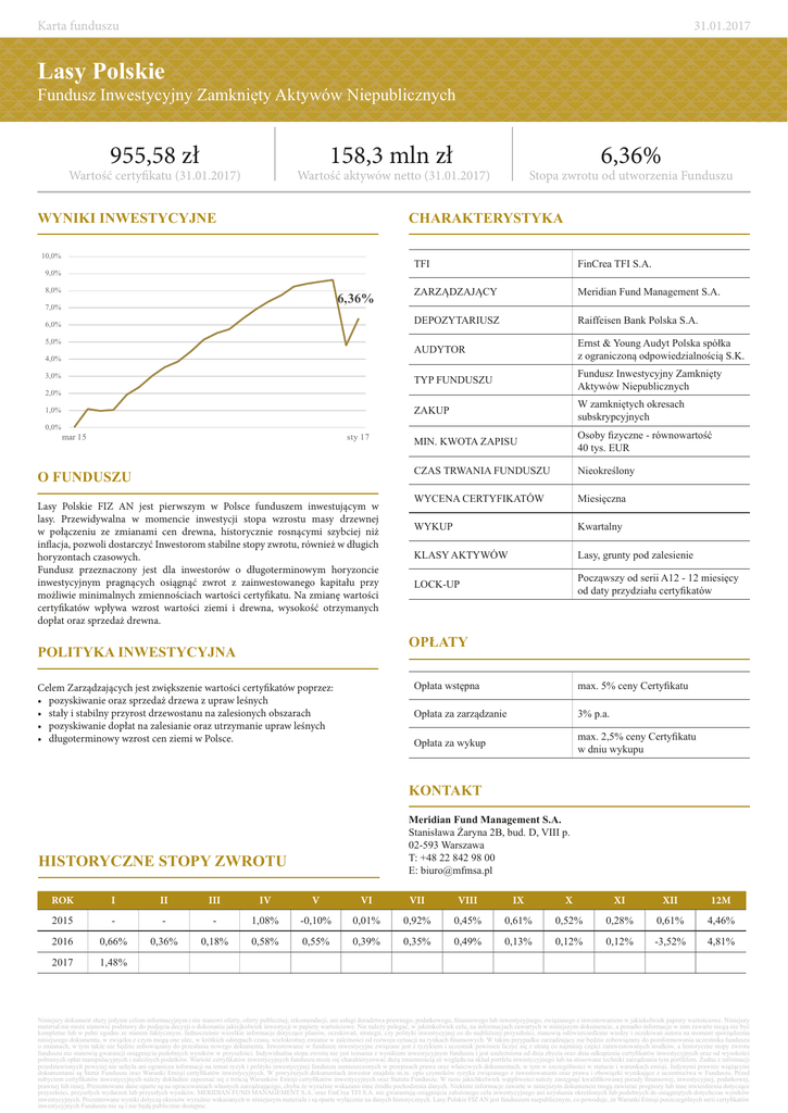 Karta funduszu 31.01.2017 Lasy Polskie Fundusz Inwestycyjny Zamknięty Aktywów Niepublicznych 955,58 zł 158,3 mln zł Wartość certyfikatu (31.01.2017) 6,36% Wartość aktywów netto (31.01.2017) WYNIKI INWESTYCYJNE Stopa zwrotu od utworzenia Funduszu CHARAKTERYSTYKA 10,0% 9,0% 8,0% 6,36% 7,0% 6,0% 5,0% 4,0% 3,0% TFI FinCrea TFI S.A. ZARZĄDZAJĄCY Meridian Fund Management S.A. DEPOZYTARIUSZ Raiffeisen Bank Polska S.A. AUDYTOR Ernst & Young Audyt Polska spółka z ograniczoną odpowiedzialnością S.K. TYP FUNDUSZU Fundusz Inwestycyjny Zamknięty Aktywów Niepublicznych ZAKUP W zamkniętych okresach subskrypcyjnych MIN. KWOTA ZAPISU Osoby fizyczne - równowartość 40 tys. EUR CZAS TRWANIA FUNDUSZU Nieokreślony WYCENA CERTYFIKATÓW Miesięczna WYKUP Kwartalny KLASY AKTYWÓW Lasy, grunty pod zalesienie LOCK-UP Począwszy od serii A12 - 12 miesięcy od daty przydziału certyfikatów 2,0% 1,0% 0,0% mar 15 sty 17 O FUNDUSZU Lasy Polskie FIZ AN jest pierwszym w Polsce funduszem inwestującym w lasy. Przewidywalna w momencie inwestycji stopa wzrostu masy drzewnej w połączeniu ze zmianami cen drewna, historycznie rosnącymi szybciej niż inflacja, pozwoli dostarczyć Inwestorom stabilne stopy zwrotu, również w długich horyzontach czasowych. Fundusz przeznaczony jest dla inwestorów o długoterminowym horyzoncie inwestycyjnym pragnących osiągnąć zwrot z zainwestowanego kapitału przy możliwie minimalnych zmiennościach wartości certyfikatu. Na zmianę wartości certyfikatów wpływa wzrost wartości ziemi i drewna, wysokość otrzymanych dopłat oraz sprzedaż drewna. OPŁATY POLITYKA INWESTYCYJNA Celem Zarządzających jest zwiększenie wartości certyfikatów poprzez: • pozyskiwanie oraz sprzedaż drzewa z upraw leśnych • stały i stabilny przyrost drzewostanu na zalesionych obszarach • pozyskiwanie dopłat na zalesianie oraz utrzymanie upraw leśnych • długoterminowy wzrost cen ziemi w Polsce. Opłata wstępna max. 5% ceny Certyfikatu Opłata za zarządzanie 3% p.a. Opłata za wykup max. 2,5% ceny Certyfikatu w dniu wykupu KONTAKT Meridian Fund Management S.A. Stanisława Żaryna 2B, bud. D, VIII p. 02-593 Warszawa T: +48 22 842 98 00 E: [email protected] HISTORYCZNE STOPY ZWROTU ROK I II III IV V VI VII VIII IX X XI XII 12M 2015 - - - 1,08% -0,10% 0,01% 0,92% 0,45% 0,61% 0,52% 0,28% 0,61% 4,46% 2016 0,66% 0,36% 0,18% 0,58% 0,55% 0,39% 0,35% 0,49% 0,13% 0,12% 0,12% -3,52% 4,81% 2017 1,48% Niniejszy dokument służy jedynie celom informacyjnym i nie stanowi oferty, oferty publicznej, rekomendacji, ani usługi doradztwa prawnego, podatkowego, finansowego lub inwestycyjnego, związanego z inwestowaniem w jakiekolwiek papiery wartościowe. Niniejszy materiał nie może stanowić podstawy do podjęcia decyzji o dokonaniu jakiejkolwiek inwestycji w papiery wartościowe. Nie należy polegać, w jakimkolwiek celu, na informacjach zawartych w niniejszym dokumencie, a ponadto informacje w nim zawarte mogą nie być kompletne lub w pełni zgodne ze stanem faktycznym. Jednocześnie wszelkie informacje dotyczące planów, oczekiwań, strategii, czy polityki inwestycyjnej co do najbliższej przyszłości, stanowią odzwierciedlenie wiedzy i oczekiwań autora na moment sporządzenia niniejszego dokumentu, w związku z czym mogą one ulec, w krótkich odstępach czasu, wielokrotnej zmianie w zależności od rozwoju sytuacji na rynkach finansowych. W takim przypadku zarządzający nie będzie zobowiązany do poinformowania uczestnika funduszu o zmianach, w tym także nie będzie zobowiązany do przesłania nowego dokumentu. Inwestowanie w fundusze inwestycyjne związane jest z ryzykiem i uczestnik powinien liczyć się z utratą co najmniej części zainwestowanych środków, a historyczne stopy zwrotu funduszu nie stanowią gwarancji osiągnięcia podobnych wyników w przyszłości. Indywidualna stopa zwrotu nie jest tożsama z wynikiem inwestycyjnym funduszu i jest uzależniona od dnia zbycia oraz dnia odkupienia certyfikatów inwestycyjnych oraz od wysokości pobranych opłat manipulacyjnych i należnych podatków. Wartość certyfikatów inwestycyjnych funduszu może się charakteryzować dużą zmiennością ze względu na skład portfela inwestycyjnego lub na stosowane techniki zarządzania tym portfelem. Żadna z informacji przedstawionych powyżej nie uchyla ani ogranicza informacji na temat ryzyk i polityki inwestycyjnej funduszu zamieszczonych w przepisach prawa oraz właściwych dokumentach, w tym w szczególności w statucie i warunkach emisji. Jedynymi prawnie wiążącymi dokumentami są Statut Funduszu oraz Warunki Emisji certyfikatów inwestycyjnych. W powyższych dokumentach inwestor znajdzie m.in. opis czynników ryzyka związanego z inwestowaniem oraz prawa i obowiązki wynikające z uczestnictwa w Funduszu. Przed nabyciem certyfikatów inwestycyjnych należy dokładnie zapoznać się z treścią Warunków Emisji certyfikatów inwestycyjnych oraz Statutu Funduszu. W razie jakichkolwiek wątpliwości należy zasięgnąć kwalifikowanej porady finansowej, inwestycyjnej, podatkowej, prawnej lub innej. Prezentowane dane oparte są na opracowaniach własnych zarządzającego, chyba że wyraźnie wskazano inne źródło pochodzenia danych. Niektóre informacje zawarte w niniejszym dokumencie mogą zawierać prognozy lub inne stwierdzenia dotyczące przyszłości, przyszłych wydarzeń lub przyszłych wyników. MERIDIAN FUND MANAGEMENT S.A. oraz FinCrea TFI S.A. nie gwarantują osiągnięcia założonego celu inwestycyjnego ani uzyskania określonych lub podobnych do osiągniętych dotychczas wyników inwestycyjnych. Prezentowane wyniki dotyczą okresów wyraźnie wskazanych w niniejszym materiale i są oparte wyłącznie na danych historycznych. Lasy Polskie FIZ AN jest funduszem niepublicznym, co powoduje, że Warunki Emisji poszczególnych serii certyfikatów inwestycyjnych Funduszu nie są i nie będą publicznie dostępne.