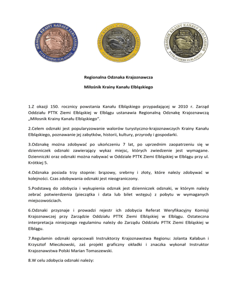 Regionalna Odznaka Krajoznawcza Miłośnik Krainy Kanału Elbląskiego 1.Z okazji 150. rocznicy powstania Kanału Elbląskiego przypadającej w 2010 r. Zarząd Oddziału PTTK Ziemi Elbląskiej w Elblągu ustanawia Regionalną Odznakę Krajoznawczą „Miłosnik Krainy Kanału Elbląskiego“. 2.Celem odznaki jest popularyzowanie walorów turystyczno-krajoznawczych Krainy Kanału Elbląskiego, poznawanie jej zabytków, historii, kultury, przyrody i gospodarki. 3.Odznakę można zdobywać po ukończeniu 7 lat, po uprzednim zaopatrzeniu się w dzienniczek odznaki zawierający wykaz miejsc, których zwiedzenie jest wymagane. Dzienniczki oraz odznaki można nabywać w Oddziale PTTK Ziemi Elbląskiej w Elblągu przy ul. Krótkiej 5. 4.Odznaka posiada trzy stopnie: brązowy, srebrny i złoty, które należy zdobywać w kolejności. Czas zdobywania odznaki jest nieograniczony. 5.Podstawą do zdobycia i wykupienia odznak jest dzienniczek odznaki, w którym należy zebrać potwierdzenia (pieczątka i data lub bilet wstępu) z pobytu w wymaganych miejscowościach. 6.Odznaki przyznaje i prowadzi rejestr ich zdobycia Referat Weryfikacyjny Komisji Krajoznawczej przy Zarządzie Oddziału PTTK Ziemi Elbląskiej w Elblągu. Ostateczna interpretacja niniejszego regulaminu należy do Zarządu Oddziału PTTK Ziemi Elbląskiej w Elblągu. 7.Regulamin odznaki opracowali Instruktorzy Krajoznawstwa Regionu: Jolanta Kałabun i Krzysztof Mieczkowski, zaś projekt graficzny okładki i znaczka wykonał Instruktor Krajoznawstwa Polski Marian Tomaszewski. 8.W celu zdobycia odznaki należy: a.odbyć rejs statkiem po Kanale Elbląskim na trasie Elbląg - Ostróda lub Elbląg - Pochylnia Buczyniec podczas zdobywania dowolnego stopnia odznaki (bez odbytego rejsu nie zostanie przyznany najwyższy stopień odznaki) b.zwiedzić: na stopień brązowy: •Elbląg - Stare Miasto (katedra p.w. Św. Mikołaja, kościół NMP - Galeria EL, Brama Targowa, Ścieżka Kościelna, Szpital Św. Ducha, Muzeum Historyczno-Archeologiczne) •Wikrowo - cmentarz mennonicki •Raczki Elbląskie - najniższy punkt w Polsce •Jezioro - most zwodzony, kościół, cmentarz i dom modlitwy mennonitów •Święty Gaj - Sanktuarium św. Wojciecha •Jelonki - wieś (kościół, chaty podcieniowe, pomnik ofiar I wojny św.) •Buczyniec - pochylnia, Izba Historii Kanału, pomnik G.J. Steenke •Zielonka Pasłęcka - Sanktuarium Chrystusa Miłosiernego •Pasłęk - Stare Miasto (mury obronne z bramami: Kamienna i Młyńska, ratusz, kościół p.w. Św. Bartłomieja, zamek), cmentarz żydowski, kościół p.w. Św. Jerzego •Kwitajny - wieś (kościół, pałac, park, pomnik ofiar I wojny św.) •Marianka - kościół •Przezmark - kościół na stopień srebrny: •Zalewo - miasto (kościół p.w. Św. Jana, fragment murów miejskich z basztą - izba regionalna, cmentarz żydowski), jez. Ewingi •Bądki - dwór •Dobrzyki - kościół, Kanał Dobrzycki •Jerzwałd - ogród dydaktyczny i muzeum przyrodnicze w siedzibie Dyrekcji Parku Krajobrazowego Pojezierza Iławskiego i Wzgórz Dylewskich, grób Z. Nienackiego, jez. Jeziorak •Przezmark - ruiny zamku •Wyspa Bukowiec •Boreczno - kościół •Jaśkowo - kościół, pałac •Karnity - zamek, Kanał Iławski, grobla na jez. Karnickim •Miłomłyn - kościół p.w. Św. Bartłomieja, śluza Miłomłyn, jaz Miłomłyn •Sople - dwór należący dawniej do G.J. Steenke •Szymonowo - kościół, dwór na stopień złoty: •Ostróda - miasto (zamek krzyżacki, jez. Drwęckie i molo, kościół p.w. Św. Domi- nika Savio, fragmenty murów obronnych, Pomnik Jedności Europejskiej, Kościół ewangelickometodystyczny, Kościół p.w. Niepokalanego Poczęcia NMP, cmentarz na Górce Polskiej z nagrobkiem G. Gizewiusza, wieża Bismarcka) •Rudzienice - kościół, Izba Pruska •Ławice - Izba Pamięci E. Behringa •Iława - miasto (kościół p.w. Przemienienia Pańskiego, barokowe rzeźby z Ka- mieńca, ratusz, kamienice z przełomu XIX i XX w., młyn wodny na rzece Iławce, jez. Jeziorak) •Siemiany - jez. Jeziorak, cmentarz ewangelicki, ścieżka przyrodnicza nad jez. Jasne •Karaś - rezerwat przyrody „Jezioro Karaś“ •Szymbark - ruiny zamku •Susz - miasto (kościół z XIV w., średniowieczne grodzisko, fragmenty murów obronnych) •Kamieniec - kościół, ruiny pałacu •Bałoszyce - kościół, pałac z parkiem •Łęgowo - Sanktuarium MB Fatimskiej •Kisielice - kościół, wieża ciśnień, farma wiatraków. (Regulamin uchwalony Uchwałą nr 21/XXI/2010 z dnia 21.06.2010 r. przez Zarząd Oddziału PTTK Ziemi Elbląskiej w Elblągu.)