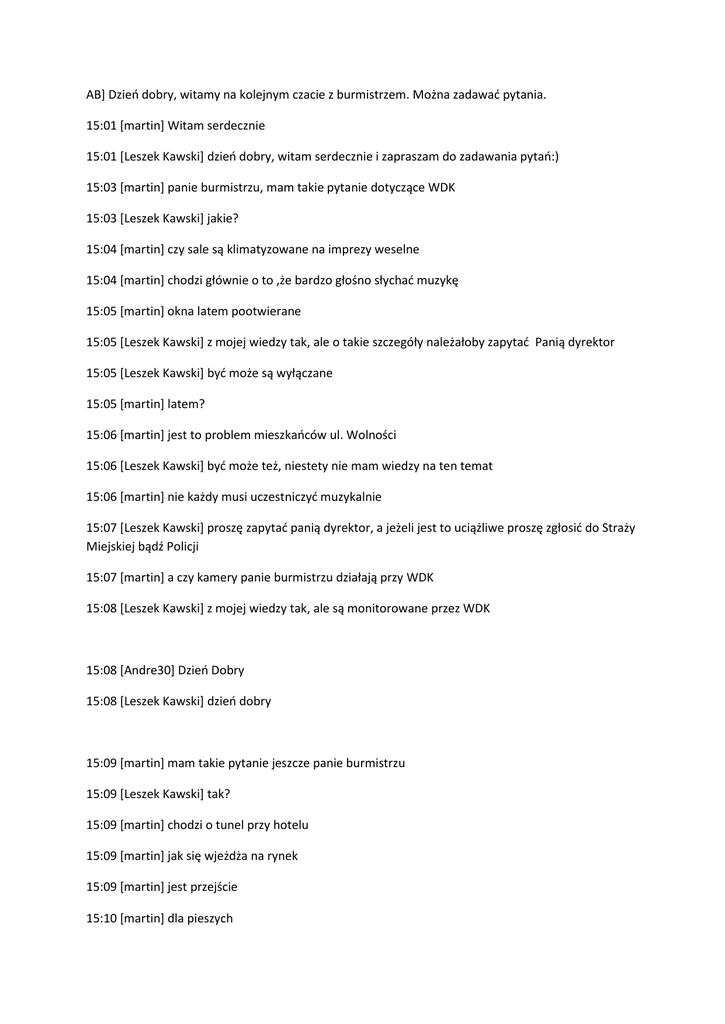 AB] Dzień dobry, witamy na kolejnym czacie z burmistrzem. Można zadawać pytania. 15:01 [martin] Witam serdecznie 15:01 [Leszek Kawski] dzień dobry, witam serdecznie i zapraszam do zadawania pytań:) 15:03 [martin] panie burmistrzu, mam takie pytanie dotyczące WDK 15:03 [Leszek Kawski] jakie? 15:04 [martin] czy sale są klimatyzowane na imprezy weselne 15:04 [martin] chodzi głównie o to ,że bardzo głośno słychać muzykę 15:05 [martin] okna latem pootwierane 15:05 [Leszek Kawski] z mojej wiedzy tak, ale o takie szczegóły należałoby zapytać Panią dyrektor 15:05 [Leszek Kawski] być może są wyłączane 15:05 [martin] latem? 15:06 [martin] jest to problem mieszkańców ul. Wolności 15:06 [Leszek Kawski] być może też, niestety nie mam wiedzy na ten temat 15:06 [martin] nie każdy musi uczestniczyć muzykalnie 15:07 [Leszek Kawski] proszę zapytać panią dyrektor, a jeżeli jest to uciążliwe proszę zgłosić do Straży Miejskiej bądź Policji 15:07 [martin] a czy kamery panie burmistrzu działają przy WDK 15:08 [Leszek Kawski] z mojej wiedzy tak, ale są monitorowane przez WDK 15:08 [Andre30] Dzień Dobry 15:08 [Leszek Kawski] dzień dobry 15:09 [martin] mam takie pytanie jeszcze panie burmistrzu 15:09 [Leszek Kawski] tak? 15:09 [martin] chodzi o tunel przy hotelu 15:09 [martin] jak się wjeżdża na rynek 15:09 [martin] jest przejście 15:10 [martin] dla pieszych 15:10 [martin] z chełmińskiej na rynek 15:10 [Leszek Kawski] tak 15:10 [martin] jest te przejście bardzo niebezpieczne 15:11 [martin] chodzi o znak uwaga pieszy jest 15:11 [martin] ja, jako kierujący pojazdem 15:11 [martin] miałem taki incydent 15:11 [martin] kiedy wózek z dzieckiem wyjeżdża mi na jezdnię 15:12 [martin] oczywiście rodzic później 15:12 [martin] kierowcy ciężko to przewidzieć co się stanie 15:13 [Leszek Kawski] no cóż są rodzice którzy nie maja kompletnie wyobraźni 15:13 [martin] zwalnia się to normalna rzecz 15:13 [Leszek Kawski] z wózkiem można bezpiecznie przejść tunelem 15:14 [Leszek Kawski] dzięki za sygnał, zastanowię się jak rozwiązać problem pieszych przy wjeździe na rynek 15:13 [Andre30] Pierwsze pytanie Panie Burmistrzu nasuwa się samo - jeżdżąc swoim autem remont ulicy 1-go Maja od PKS do zjazdu na Myśliwiec zakrawa na pomstę do nieba. Jak można dopuścić do chaosu i dezorganizacji ruchu na tak ważnym trakcie i kto nadzoruje ten remont ? 15:13 [Andre30] bo wydaje mi się że jakiś stażysta 15:13 [Andre30] nie wspomnę o fakcie bajzlu nieładu i straty dwóch opon !!!! 15:15 [Leszek Kawski] no niestety, tam gdzie trwają prace w tak szeroko zakrojonym zakresie zdarzają się problemy 15:16 [Leszek Kawski] niestety, jestem świadkiem często tego, że kierowcy i to nasi z miasta nie stosują się do zasad ruchu, a szczególnie ograniczenia prędkości 15:16 [Leszek Kawski] te najtrudniejsze momenty nie są ciągle 15:16 [Andre30] ja rozumiem problemy w ruchu drogowym w momencie tak dużych prac, ale to jest bajzel - albo się wprowadza ruch wahadłowy, albo panuje się nad tym nieładem 15:16 [Leszek Kawski] i mam nadzieje, że do końca października będziemy mieli zakończony remont 15:17 [Leszek Kawski] jestem przekonany też, że pozostawienie możliwości przejazdu 1Maja jest lepsze od wyłączenia jej z ruchu 15:18 [Leszek Kawski] ma Pan częściowo rację, zwracamy na to uwagę wykonawcy i nadzorcy robót 15:18 [Andre30] hmmm trochę więcej porządku i interwencji kierownika tych robót by był wskazany 15:18 [Leszek Kawski] zgadzam się i o to zabiegam 15:19 [Leszek Kawski] ale rozumiem też wykonawcę, który chce jak najszybciej wykonać zadanie i jak najmniej dokonywać wyłączeń w ruchu 15:19 [Andre30] Przyjmuję Pana wyjaśnienia :-) 15:19 [Leszek Kawski] proszę jeszcze o chwile cierpliwości 15:20 [Leszek Kawski] a jeżeli chodzi o szkody można zwracać się do ubezpieczyciela 15:20 [Leszek Kawski] firma jest ubezpieczona od takich zdarzeń 15:19 [martin] panie burmistrzu czy do 1 listopada targ na Matejki będzie już funkcjonował 15:20 [Leszek Kawski] chciałbym bardzo, aby targ funkcjonował do 1 listopada 5:21 [Leszek Kawski] mimo że firma zawaliła wiele terminów cząstkowych jest szansa, że się uda 15:20 [Andrzej] Panie Burmistrzu 15:20 [Andrzej] Dzień dobry 15:21 [Andrzej] Moje pytanie dotyczy o czystość chodników na osiedlach domków jednorodzinnych. Przejeżdżając samochodem dostawczym z towarem miałem problem z przejazdem- gałęzie świerku wchodzą w drogę, a z drugiej strony auta stoją i jak mam przejechać? 15:21 [Andrzej] a chodnik to chyba z pół roku nie sprzątnięty 15:21 [Andrzej] trawa rośnie 15:21 [Andrzej] gdzie jest straż miejska? 15:22 [Leszek Kawski] proszę podać konkretne ulice? 15:22 [Andrzej] Świerkowa 15:22 [Andrzej] osiedle Kętrzyńskiego 15:22 [Andrzej] na ulicy Świerkowej należy chyba podciąć te gałęzie 15:20 [Andre30] Kolejne pytanie wiąże się z tym, iż jako zapalony rowerzysta martwi - więcej jestem wielce zaniepokojony o stan ścieżki pieszo rowerowej na ul. Ks. Kiedrowskiego 15:21 [Andre30] ścieżka się zapada jest nierówna 15:21 [Andre30] jeszcze rok temu było ok 15:22 [Andre30] niestety A.D 2013 dzieje się z nią coś niepokojącego 15:23 [Leszek Kawski] zaraz zlecę weryfikacje stanu ścieżki, ale osobiście tamtędy przechodziłem w ubiegłym tygodniu i nic nie zauważyłem 15:23 [Andrzej] jadąc z towarem mam problem z przejazdem, bo po drugiej stronie stoją auta 15:23 [Andrzej] a gałęzie wchodzą prawie w os jezdni 15:24 [Andrzej] a chodnik to zarośnięty trawą jest 15:24 [Leszek Kawski] sprawdzę wszystko, o czym Pan sygnalizuje 15:24 [Andrzej] dziękuje 15:28 [Andre30] Hmmm 15:28 [Leszek Kawski] o co chodzi? 15:29 [Andre30] o pytanie, które zadałem Panu 15:29 [Andre30] odnośnie ścieżki i chodnika na ul. ks Kiedrowskiego 15:29 [Leszek Kawski] proszę o jedno słowo, bo zadano jednocześnie wiele pytań 15:29 [Andre30] ścieżka
