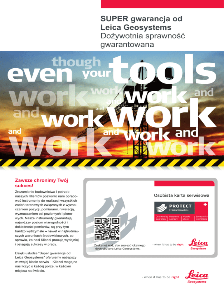 SUPER gwarancja od Leica Geosystems Dożywotnia sprawność gwarantowana Zawsze chronimy Twój sukces! Zrozumienie budownictwa i potrzeb naszych Klientów pozwoliło nam opracować instrumenty do realizacji wszystkich zadań terenowych związanych z wyznaczaniem pozycji, pomiarami, niwelacją, wyznaczaniem osi poziomych i pionowych. Nasze instrumenty gwarantują najwyższy poziom wiarygodności i dokładności pomiarów, są przy tym bardzo wytrzymałe – nawet w najtrudniejszych warunkach środowiskowych, co sprawia, że nasi Klienci pracują wydajniej i osiągają sukcesy w pracy. Dzięki usłudze "Super gwarancja od Leica Geosystems" oferujemy najlepszy w swojej klasie serwis – Klienci mogą na nas liczyć o każdej porze, w każdym miejscu na świecie. Osobista karta serwisowa Dożywotnia Bezpłatne gwarancja naprawy Zeskanuj kod, aby znaleźć lokalnego dystrybutora Leica Geosystems. Wysoka jakość Szwajcarska technologia Super gwarancja od Leica Geosystems Najlepsze produkty dostarczane są z najlepszą gwarancją i serwisem PROTECT by Leica Geosystems Dożywotnia gwarancja Bezpłatne naprawy Wysoka jakość Szwajcarska technologia Dożywotnia gwarancja producenta Certyfikowana wysoka jakość Gwarancja przez cały okres użytkowania produktu, zgodnie z warunkami Międzynarodowej Gwarancji Leica Geosystems. Obejmuje darmowe naprawy, lub wymianę produktu posiadającego defekt, który wynika z wad materiałowych, lub błędów w procesie produkcji. Leica Geosystems prowadzi laboratorium kalibracyjne (nr SCS079) oraz laboratorium testowe (nr STS549). Oba są akredytowane przez SAS - Szwajcarski Urząd Akredytacyjny. Certyfikaty kalibracyjne i testowe wydawane przez Leica Geosystems są uznawane na świecie, dotyczą pomiaru kąta i odległości, częstotliwość i klasyfikacji lasera. Te certyfikaty gwarantują największą dokładność i wiarygodność naszych produktów. Wszystkie laboratoria są regularnie kontrolowane przez niezależną instytucję wydającą certyfikaty ISO 17025. Bezpłatne naprawy Gwarantujemy najlepszy serwis – jeśli Twój produkt zostanie uszkodzony w wyniku normalnego użytkowania opisanego w instrukcji obsługi – zostanie bezpłatne naprawiony. Nasze usługi obejmują: Koszta robocizny oraz naprawę, lub wymianę wadliwych części Rektyfikację i kalibrację Testy funkcjonalne i testy bezpieczeństwa pracy z urządzeniem Konserwację, czyszczenie produktu i pojemnika transportowego Szwajcarska technologia Szwajcarska technologia buduje zaufanie. Nasza działalność na świecie skupia się m. in. w centrach produkcyjnych, gdzie na pierwszym miejscu stawiamy na szwajcarską precyzję, dbałość o każdy szczegół w procesie produkcji i najnowocześniejszą technologię. Testy na wszystkich etapach projektowania i produkcji sprawiają, że nasze produkty spełniają najwyższe standardy w zakresie dokładności pomiaru i jakości wykonania. Po wizycie w serwisie Twój instrument będzie wyglądać i działać jak nowy! Pracujemy dla Ciebie. Dzięki globalnej sieci składającej się z 260 centrów serwisowych w 87 krajach, Leica Geosystems wspiera Cię w każdym miejscu na świecie. Dowiedz się więcej: http://www.leica-geosystems.pl/ supergwarancja http://www.leica-geosystems.pl/supergwarancja Leica Geosystems sp. z o.o. ul. Jutrzenki 118, 02-230 Warszawa Tel.: +48 22 260 50 00 Fax: +48 22 260 50 10 www.leica-geosystems.pl Ilustracje, opisy i dane techniczne nie są wiążące i mogą ulec zmianie. Wszystkie prawa zastrzeżone. Drukowano w Polsce – Copyright Leica Geosystems AG, Heerbrugg, Szwajcaria, 2012. II.13 – galledia