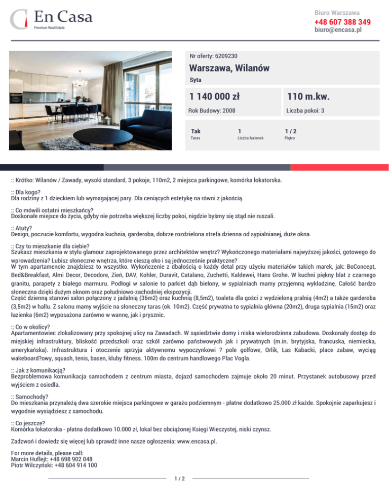 Biuro Warszawa +48 607 388 349 [email protected] Nr oferty: 6209230 Warszawa, Wilanów Syta 1 140 000 zł 110 m.kw. Rok Budowy: 2008 Liczba pokoi: 3 Tak 1 1/2 Taras Liczba łazienek Piętro :: Krótko: Wilanów / Zawady, wysoki standard, 3 pokoje, 110m2, 2 miejsca parkingowe, komórka lokatorska. :: Dla kogo? Dla rodziny z 1 dzieckiem lub wymagającej pary. Dla ceniących estetykę na równi z jakością. :: Co mówili ostatni mieszkańcy? Doskonałe miejsce do życia, gdyby nie potrzeba większej liczby pokoi, nigdzie byśmy się stąd nie ruszali. :: Atuty? Design, poczucie komfortu, wygodna kuchnia, garderoba, dobrze rozdzielona strefa dzienna od sypialnianej, duże okna. :: Czy to mieszkanie dla ciebie? Szukasz mieszkania w stylu glamour zaprojektowanego przez architektów wnętrz? Wykończonego materiałami najwyższej jakości, gotowego do wprowadzenia? Lubisz słoneczne wnętrza, które cieszą oko i są jednocześnie praktyczne? W tym apartamencie znajdziesz to wszystko. Wykończenie z dbałością o każdy detal przy użyciu materiałów takich marek, jak: BoConcept, Bed&Breakfast, Almi Decor, Decodore, Zień, DAV, Kohler, Duravit, Catalano, Zuchetti, Kaldewei, Hans Grohe. W kuchni piękny blat z czarnego granitu, parapety z białego marmuru. Podłogi w salonie to parkiet dąb bielony, w sypialniach mamy przyjemną wykładzinę. Całość bardzo słoneczna dzięki dużym oknom oraz południowo-zachodniej ekspozycji. Część dzienną stanowi salon połączony z jadalnią (36m2) oraz kuchnią (8,5m2), toaleta dla gości z wydzieloną pralnią (4m2) a także garderoba (3,5m2) w hallu. Z salonu mamy wyjście na słoneczny taras (ok. 10m2). Część prywatna to sypialnia główna (20m2), druga sypialnia (15m2) oraz łazienka (6m2) wyposażona zarówno w wannę, jak i prysznic. :: Co w okolicy? Apartamentowiec zlokalizowany przy spokojnej ulicy na Zawadach. W sąsiedztwie domy i niska wielorodzinna zabudowa. Doskonały dostęp do miejskiej infrastruktury, bliskość przedszkoli oraz szkół zarówno państwowych jak i prywatnych (m.in. brytyjska, francuska, niemiecka, amerykańska). Infrastruktura i otoczenie sprzyja aktywnemu wypoczynkowi ? pole golfowe, Orlik, Las Kabacki, place zabaw, wyciąg wakeboard?owy, squash, tenis, basen, kluby fitness. 100m do centrum handlowego Plac Vogla. :: Jak z komunikacją? Bezproblemowa komunikacja samochodem z centrum miasta, dojazd samochodem zajmuje około 20 minut. Przystanek autobusowy przed wyjściem z osiedla. :: Samochody? Do mieszkania przynależą dwa szerokie miejsca parkingowe w garażu podziemnym - płatne dodatkowo 25.000 zł każde. Spokojnie zaparkujesz i wygodnie wysiądziesz z samochodu. :: Co jeszcze? Komórka lokatorska - płatna dodatkowo 10.000 zł, lokal bez obciążonej Księgi Wieczystej, niski czynsz. Zadzwoń i dowiedz się więcej lub sprawdź inne nasze ogłoszenia: www.encasa.pl. For more details, please call: Marcin Huflejt: +48 698 902 048 Piotr Wilczyński: +48 604 914 100 1/2 Biuro Warszawa +48 607 388 349 [email protected] Kontakt z agentem Marcin Huflejt Powyższa oferta nie stanowi oferty handlowej w rozumieniu art. 66 § 1 kodeksu cywilnego oraz innych właściwych przepisów prawnych. En Casa jest wyłącznym właścicielem zamieszczonych zdjęć i opisów. Kopiowanie ich w całości lub fragmentach jest zabronione zgodnie z ustawą z dnia 4 lutego 1994 r. o prawie autorskim i prawach pokrewnych. +48 698 902 048 [email protected] 2/2 Powered by TCPDF (www.tcpdf.org)