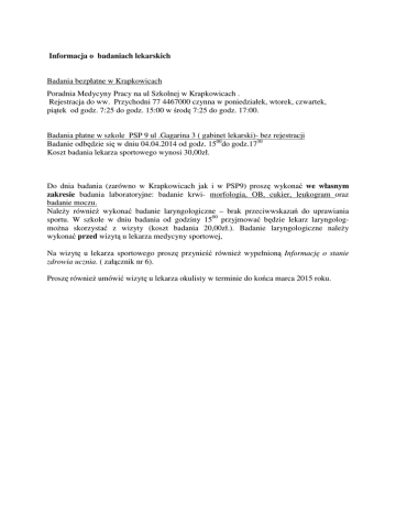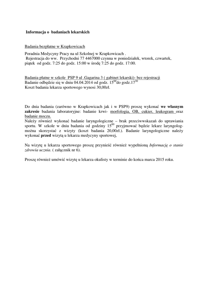 Informacja o badaniach lekarskich Badania bezpłatne w Krapkowicach Poradnia Medycyny Pracy na ul Szkolnej w Krapkowicach . Rejestracja do ww. Przychodni 77 4467000 czynna w poniedziałek, wtorek, czwartek, piątek od godz. 7:25 do godz. 15:00 w środę 7:25 do godz. 17:00. Badania płatne w szkole PSP 9 ul .Gagarina 3 ( gabinet lekarski)- bez rejestracji Badanie odbędzie się w dniu 04.04.2014 od godz. 1500do godz.1730 Koszt badania lekarza sportowego wynosi 30,00zł. Do dnia badania (zarówno w Krapkowicach jak i w PSP9) proszę wykonać we własnym zakresie badania laboratoryjne: badanie krwi- morfologia, OB, cukier, leukogram oraz badanie moczu. Należy również wykonać badanie laryngologiczne – brak przeciwwskazań do uprawiania sportu. W szkole w dniu badania od godziny 1500 przyjmować będzie lekarz laryngologmożna skorzystać z wizyty (koszt badania 20,00zł.). Badanie laryngologiczne należy wykonać przed wizytą u lekarza medycyny sportowej, Na wizytę u lekarza sportowego proszę przynieść również wypełnioną Informację o stanie zdrowia ucznia. ( załącznik nr 6). Proszę również umówić wizytę u lekarza okulisty w terminie do końca marca 2015 roku.