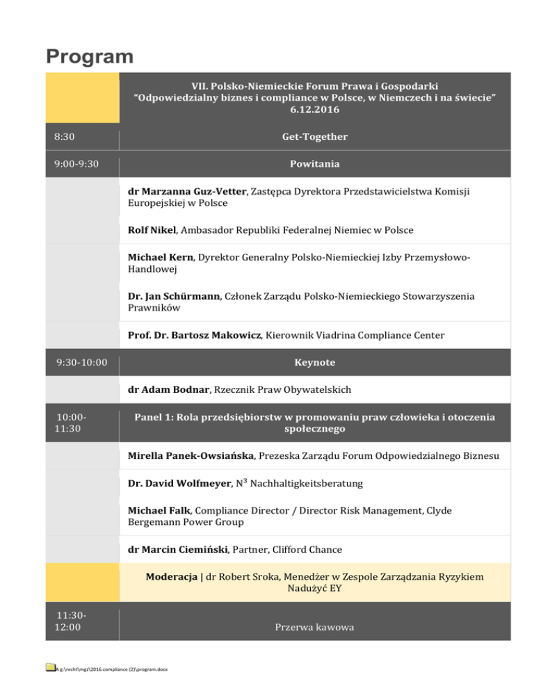 Program VII. Polsko-Niemieckie Forum Prawa i Gospodarki “Odpowiedzialny biznes i compliance w Polsce, w Niemczech i na świecie” 6.12.2016 8:30 Get-Together 9:00-9:30 Powitania dr Marzanna Guz-Vetter, Zastępca Dyrektora Przedstawicielstwa Komisji Europejskiej w Polsce Rolf Nikel, Ambasador Republiki Federalnej Niemiec w Polsce Michael Kern, Dyrektor Generalny Polsko-Niemieckiej Izby PrzemysłowoHandlowej Dr. Jan Schürmann, Członek Zarządu Polsko-Niemieckiego Stowarzyszenia Prawników Prof. Dr. Bartosz Makowicz, Kierownik Viadrina Compliance Center 9:30-10:00 Keynote dr Adam Bodnar, Rzecznik Praw Obywatelskich 10:0011:30 Panel 1: Rola przedsiębiorstw w promowaniu praw człowieka i otoczenia społecznego Mirella Panek-Owsiańska, Prezeska Zarządu Forum Odpowiedzialnego Biznesu Dr. David Wolfmeyer, N³ Nachhaltigkeitsberatung Michael Falk, Compliance Director / Director Risk Management, Clyde Bergemann Power Group dr Marcin Ciemiński, Partner, Clifford Chance Moderacja | dr Robert Sroka, Menedżer w Zespole Zarządzania Ryzykiem Nadużyć EY 11:3012:00 A g:\recht\mgz\2016.compliance (2)\program.docx Przerwa kawowa 12:0013:30 Panel 2: Supply Chain Compliance i zrównoważony rozwój Sławomir Chmielewski, MBA, Dyrektor Biura Zarządzania Zgodnością Orange Polska S.A. Zbigniew Jara, Partner, JARA DRAPAŁA & PARTNERS Noor Naqschbandi, Odpowiedzialny za projekt z Deutsche Gesellschaft für Internationale Zusammenarbeit oraz Dyrektor w Allianz for Integrity Prof. Dr. Claus Köhler, Meister Rechtsanwälte Moderacja | Marcin Szczepański, Regional Compliance Officer, Siemens 13:3014:30 Lunch 14:3016:00 Panel 3: Compliance w prawie pracy i nowe europejskie prawo ochrony danych dr Anna Partyka-Opiela, Domański, Zakrzewski, Palinka Dr. Christian Hamann, Deutsches Institut für Compliance (DICO e.V.) Prof. Dr. Ulrich Tödtmann, Uniwersytet Mannheim Dr. Jan Schürmann, Członek Zarządu Polsko-Niemieckiego Stowarzyszenia Prawników Moderacja | Dr. Dominik Wagner, LL.M., Rechtsanwalt und Partner, Tigges Rechtsanwälte Düsseldorf 16:00 Slowo na zakonczenie: Prof. Dr. Bartosz Makowicz, Viadrina Compliance Center