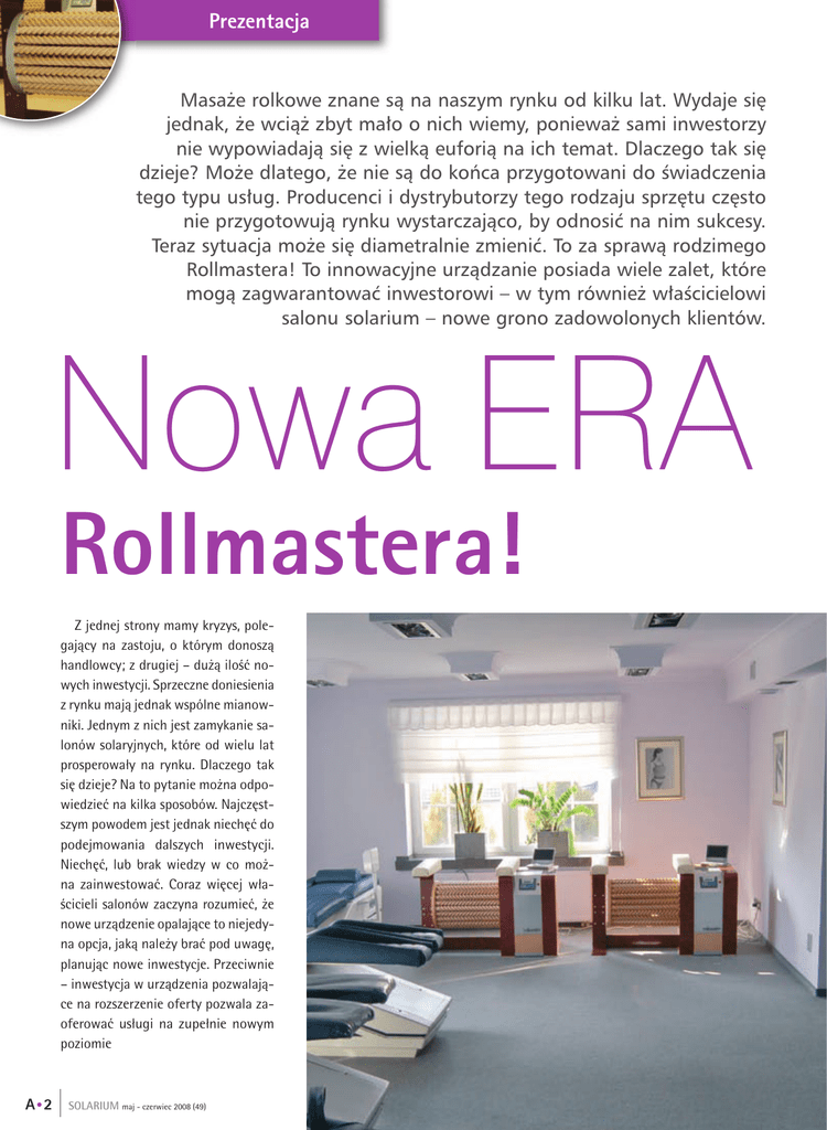 Prezentacja Masaże rolkowe znane są na naszym rynku od kilku lat. Wydaje się jednak, że wciąż zbyt mało o nich wiemy, ponieważ sami inwestorzy nie wypowiadają się z wielką euforią na ich temat. Dlaczego tak się dzieje? Może dlatego, że nie są do końca przygotowani do świadczenia tego typu usług. Producenci i dystrybutorzy tego rodzaju sprzętu często nie przygotowują rynku wystarczająco, by odnosić na nim sukcesy. Teraz sytuacja może się diametralnie zmienić. To za sprawą rodzimego Rollmastera! To innowacyjne urządzanie posiada wiele zalet, które mogą zagwarantować inwestorowi – w tym również właścicielowi salonu solarium – nowe grono zadowolonych klientów. Nowa ERA Rollmastera! Z jednej strony mamy kryzys, polegający na zastoju, o którym donoszą handlowcy; z drugiej – dużą ilość nowych inwestycji. Sprzeczne doniesienia z rynku mają jednak wspólne mianowniki. Jednym z nich jest zamykanie salonów solaryjnych, które od wielu lat prosperowały na rynku. Dlaczego tak się dzieje? Na to pytanie można odpowiedzieć na kilka sposobów. Najczęstszym powodem jest jednak niechęć do podejmowania dalszych inwestycji. Niechęć, lub brak wiedzy w co można zainwestować. Coraz więcej właścicieli salonów zaczyna rozumieć, że nowe urządzenie opalające to niejedyna opcja, jaką należy brać pod uwagę, planując nowe inwestycje. Przeciwnie – inwestycja w urządzenia pozwalające na rozszerzenie oferty pozwala zaoferować usługi na zupełnie nowym poziomie A●2 SOLARIUM maj - czerwiec 2008 (49) Jedną z możliwości, które niewątpliwie należy wziąć pod uwagę, jest wyposażenie salonu np. w Rollmaster! Urządzenia, które otwiera przed nami nową erę masażu rolkami. Nowatorski pomysł Rollmaster to urządzenie opracowane i produkowane przez rodzimą firmę Media Publication, obecną na rynku od 2001 roku. Produkty firmy odróżnia od propozycji konkurencji kilka istotnych elementów. Pierwsze, co rzuca się w oczy, to unikalny wygląd, który zawdzięcza autorskiemu projektowi znanego artysty plastyka Artura Mikusza. Również jeśli chodzi o stronę techniczną znajdziemy tu wiele nowatorskich rozwiązań. Oto najważniejsze z nich: • Innowacyjny, ślimakowy kształt wałków masujących, gwarantujący korzystniejszy wpływ na przesuwanie limfy – co z kolei prowadzi do lepszych efektów masażu! Wałki masujące w urządzeniach ROLLMASTER kręcą się w dwie strony – dzięki temu nie ma potrzeby przechodzenia podczas masażu na drugą stronę urządzenia. • Czujniki pomiaru nacisku – pomagają w dobraniu odpowiedniej siły nacisku na wybrane części ciała. Kluczem do doskonałych efektów masażu jest nie siła, lecz odpowiedni sposób masowania. Czujniki pomagają dobrać siłę nacisku tak, by nie była za duża i by masaż nie powodował szkodliwych efektów. • Odtwarzacze DVD z nagranymi programami ćwiczeń – co pozwala na całkowicie samodzielną obsługę urządzenia. Rollmaster w solarium Salon solarium to miejsce często odwiedzane przez kobiety, które najczęściej przychodzą do niego po to, by poprawić swój wygląd. Odwiedzają to miejsce z nadzieją na to, że ich skóra stanie się bardziej brązowa, że staną się zarówno w swoich oczach, jak i otoczenia bardziej atrakcyjne, że poczują się w końcu lepiej. Zwiększa się również liczba świadomych klientów, którzy odwiedzają salony solarium nie tylko dla brązu. Taki rozwój rynku, jak i nowa grupa klientów pozwala przy- puszczać, że duża ich część może zainteresować się masażem rolkowym. Jeśli zaproponujemy tejże grupie ludzi dobre, wygodne urządzenie, gwarantujące efekty, to nic nie stoi na przeszkodzie, aby skorzystali z nowej usłu- SOLARIUM maj - czerwiec 2008 (49) A● 3 Nowa Era Rollmastera! Prezentacja gi równolegle do opalania. Z czasem salon zyska sobie nowych klientów, a dzięki pozytywnym efektom masażu zyska również dobrą renomę. Nowe grono klientów, którzy przyszli na masaż, może stać się orbitą usług opalania – i odwrotnie. Doposażenie istniejącego już salonu może okazać się wspaniałym rozwiązaniem na zwiększenie obrotów lub przetrwanie, szczególnie dla tych, którzy dysponują jeszcze wolnym miejscem, lub dla tych, którym ciągle ro- snąca konkurencja odebrała część potrzebnych do egzystencji dużego salonu klientów. Zamiast zamykać salon, można przecież zmienić nieco jego profil. Z ośmiu mało opłacalnych kabin, w których stoją mało używane urządzenia opalające, można z powodzeniem pozostawić 3 lub 4, uzupełniając swoją ofertę w zdobienie paznokci, masaż rolkowy, wibracyjny, stanowiska fryzjerskie czy urządzenia kosmetyczne, np. IPL. Rollmaster wydaje się jednak jednym z najciekawszych roz- Rollmaster to urządzenie, które z powodzeniem może w wielu wypadkach zastąpić ręce terapeuty. Masaż tym urządzeniem ma właściwości lecznicze. Wpływa na: 1. Układ krążenia • przyspiesza krążenie krwi i limfy • miejscowo rozszerzają się naczynia włosowate i poprawia się dopływ świeżej krwi • wspomaga krążenie limfy, co pobudza czynności gruczołów i przyspiesza przemianę materii • pomaga w wydalaniu produktów wadliwej przemiany materii • powoduje lepsze dotlenienie i odżywienie tkanek 2. Mięśnie • powoduje lepsze dotlenienie i odżywienie • przeciwdziała kontuzjom • zwiększa elastyczność • przyspiesza regenerację powysiłkową • podwyższa lub obniża napięcie 3. Skóra • ujędrnia i uelastycznia skórę • likwiduje lub zmniejsza zrosty lub zgrubienia • powoduje mechaniczne rozbicie tkanki tłuszczowej 4. Układ nerwowy • delikatny masaż działa relaksująco i uspokajająco • mocny masaż działa pobudzająco • usprawnia przewodzenie bodźców nerwowych • poprawia czucie powierzchniowe i głębokie A●4 SOLARIUM maj - czerwiec 2008 (49) wiązań, ponieważ koszty jego nabycia są zdecydowan
