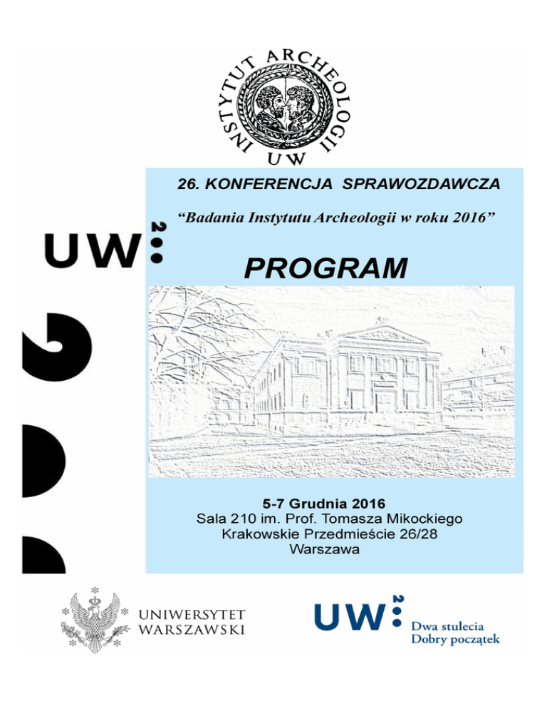 PROGRAM 26. KONFERENCJI SPRAWOZDAWCZEJ INSTYTUTU ARCHEOLOGII UNIWERSYTETU WARSZAWSKIEGO WARSZAWA, 5-7 GRUDNIA 2016 9.30 – 9.40 Poniedziałek, 5 grudnia Otwarcie konferencji ARCHEOLOGIA PRADZIEJOWA Sesja 1: Przewodniczący: Ryszard F. Mazurowski 9.40 – 9.45 Karol Szymczak Prezentacja Zakładu Paleolitu i Mezolitu 9.45 – 10.00 Michał Przeździecki Krzemienne noże tylcowe z epoki brązu i wczesnej epoki żelaza 10.00 – 10.15 Natalia Gryczewska Modyfikacje na kościach – praktyki funeralne górnego paleolitu w Europie 10.15 – 10.30 Mariusz Kowalewski Grupy i kategorie wytworów przemysłu krzemieniarskiego społeczności zasiedlających Niż Polski w epoce brązu 10.30 – 10.50 DYSKUSJA I PRZERWA Sesja 2: Przewodniczący: Kazimierz Lewartowski 10.50 – 10.55 Ryszard F. Mazurowski Prezentacja Zakładu Archeologii Pradziejowej 10.55 – 11.10 Witold Gumiński Szczepanki – stanowisko łowieckie epoki kamienia na Mazurach. Owocny sezon 2016 11.10 – 11.25 Karolina Bugajska Wieloetapowy obrządek pogrzebowy na stanowiskach epoki kamienia w Dudce i Szczepankach na Mazurach 11.25 – 11.40 Dariusz Manasterski Ceramika o cechach Pucharów Dzwonowatych z północno-wschodniej Polski 11.40 – 11.55 Martyna Zackiewicz Tradycje zbieracko-łowieckie w kulturach środkowo i późnoneolitycznych w dorzeczu Wisły 11.55 – 12.10 Artur Grabarek Trzeci sezon badań na stanowisku 6 w miejscowości Podlesie, Gm. Oleśnica, woj. świętokrzyskie 12.10 – 12.25 Artur Grabarek, Paweł Dziechciarz Cmentarzysko kultury łużyckiej. Stanowisko 5 w miejscowości Podlesie, Gm. Oleśnica, woj. świętokrzyskie 12.25– 13.25 DYSKUSJA I PRZERWA OBIADOWA ARCHEOLOGIA PROWINCJI RZYMSKICH Sesja 3: Przewodniczący: Bartosz Kontny 13.25 – 13.30 Agnieszka Tomas Prezentacja Zakładu Archeologii Prowincji Rzymskich 13.30 – 13.45 Agnieszka Tomas Osadnictwo cywilne na wschód od obozu legionowego w Novae (teren późnoantycznego aneksu). Projekt badań i perspektywy 13.45 – 14.00 Piotr Zakrzewski, Tadeusz Sarnowski Bramy obozu rzymskiego legionu w Novae. Badania weryfikacyjne Ekspedycji IA UW 14.00 – 14.15 Tomasz Dziurdzik Novae, Wieża nr 12 - rezultaty badań fragmentu umocnień południowego frontu fortyfikacji 14.15 – 14.30 Tomasz Dziurdzik Ljubuški Archaeological Project 2016 - wyniki i perspektywy nieinwazyjnych badań osadnictwa rzymskiego w Hercegowinie 14.30 – 14.50 DYSKUSJA I PRZERWA Sesja 4: Przewodniczący: Andrzej Buko 14.50 – 15.05 Radosław Karasiewicz-Szczypiorski, Shota Mamuladze Wczesne termy garnizonowe w rzymskim forcie Apsaros (Gonio, Adżarja) 15.05 – 15.20 Oskar Kubrak, Mkrtich Zardaryan Poszukiwania obozu legionu IV Scytyjskiego w pobliżu Artaxaty (Armenia). Wiosna- jesień 2016 15.20 – 15.35 Emil Jęczmienowski Rzymski fort w Pojejena – nowy nieinwazyjny projekt w Rumunii (okręg Caraș-Severin) 15.35 – 15.50 Marek Tycjan Olszewski Religijny akt ufundowania Antiochii na rzymskiej mozaice zrabowanej w Apameii i poszukiwanej przez INTERPOL. Nowe źródło do historii hellenistycznej miasta 15.50 – 16.05 Marek Tycjan Olszewski, Houmam Saad Historia ufundowania Pelli/Apamei syryjskiej na mozaice zrabowanej w Apameii i poszukiwanej przez INTERPOL. Nowe rzymskie źródło do hellenistycznej historii miasta 16.05 – 16.15 Maciej Czapski Granica lądowa prowincji Mauretania Tingitana. Wyniki ostatniej prospekcji (komunikat) 16.15 – 16.35 DYSKUSJA I PRZERWA MISCELLANEA Sesja 5: Przewodniczący: Alicja Lasota-Moskalewska 16.35 – 16.40 Anna Gręzak Prezentacja Zakładu Bioarcheologii 16.40 – 16.55 Javad Hoseinzadeh, Mohsen Javari, Montezer Zohouri, Reza Nori, Arkadiusz Sołtysiak First season of excavations at Estark, the Iron Age II cemetery near Kashan, Iran Pierwszy sezon wykopalisk na cmentarzysku z epoki żelaza II w Estark w pobliżu Kaszanu, Iran 16.55 – 17.10 Weronika Tomczyk Podsumowanie dotychczasowych badań zooarcheologicznych w Castillo de Huarmey, północne wybrzeże Peru 17.10 – 17.25 Janusz Wołoszyn, Karolina Juszczyk, Daniel Prusaczyk, Stanisław Rzeźnik Dokumentacja Toro Muerto - podsumowanie dwóch sezonów badań 17.25 – 17.35 Bogusław Franczyk, Krzysztof Rak Archeologiczna prospekcja terenowa w rejonie Pobe Mengao (Burkina Faso) – październik-listopad 2016 (komunikat) DYSKUSJA Wtorek, 6 grudnia METODY NIEINWAZYJNE W ARCHEOLOGII I ARCHEOLOGIA PODWODNA Sesja 6: Przewodniczący: Arkadiusz Sołtysiak 9.30 – 9.35 Marta Bura Prezentacja działalności Pracowni Skanerów 3D IA UW w roku akademickim 2015/2016 9.35 – 9.50 Marta Bura Trzy wymiary dokumentacji Kampusu UW 9.50 – 10.05 Janusz Janowski Co zdarzyło się na zamku w Ogrodzieńcu? 10.05 – 10.20 Paweł Janik Badania nieinwazyjne grodziska stożkowatego w Mokrsku Dolnym 10.20 – 10.30 Miron Bogacki Trójwymiarowa dokumentacja fotogrametryczna z powietrza i z ziemi w Pracowni Fotograficznej w 2016 roku (komunikat) 10.30 – 10.35 Małgorzata Mileszczyk Prezentacja Zakładu Archeologii Podwodnej 10.35 – 10.50 Małgorzata Mileszczyk, Mateusz Popek Rozpoznanie podwodne rzeki Muchawki w rejonie wydarzeń bitwy pod Iganiami z 1831 r. 10.50 - 11.05 Artur Brzóska, Piotr Preis „Drewniane mosty Warszawy w świetle najnowszych badań archeologicznych 11.05 – 11.15 Iwona Modrzewska-Pianetti, A. Chołuj, A. Cedro Rozpoczęcie realizacji grantu Harmonia dotyczącego kontaktów handlowych rejonu Murcji ( Hiszpania) ze światem śródziemnomorskim w okresie rzymskim (komunikat) 11.15 – 11.35 DYSKUSJA I PRZERWA ARCHEOLOGIA EGIPTU I NUBII Sesja 7: Przewodniczący: Iwona Modrzewska-Pianetti 11.35 – 11.40 Sławomir Rzepka Prezentacja Zakładu Archeologii Egiptu i Nubii 11.40 – 11.55 Sławomir Rzepka Badania Polsko-Słowackiej Misji Archeologicznej na stanowisku Tell elRetaba (Egipt), sezon 2016 11.55 – 12.10 Andrzej Niwiński Prace inwentaryzacyjne i badawcze nad sarkofagami z czasów 21 Dynastii 12.10 – 12.25 Grzegorz Ochała Od Faras do Edfu: nowy projekt francusko-belgijski