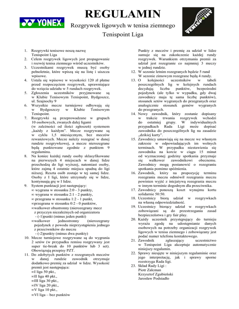 REGULAMIN Rozgrywek ligowych w tenisa ziemnego Tenispoint Liga 1. Rozgrywki tenisowe noszą nazwę Tenispoint Liga 2. Celem rozgrywek ligowych jest propagowanie i rozwój tenisa ziemnego wśród uczestników. 3. Uczestnikami rozgrywek muszą być osoby pełnoletnie, które wpiszą się na listę i uiszcza wpisowe. 4. Ustala się wpisowe w wysokości 120 zł płatne przed rozpoczęciem rozgrywek, uprawniające do wzięcia udziału w 5 rundach rozgrywek. 5. Zgłoszenia uczestników przyjmowane są w Klubie Tenisowym Tenispoint, Bydgoszcz, ul. Szajnochy 9 6. Wszystkie mecze turniejowe odbywają się w Bydgoszczy w Klubie Tenisowym Tenispoint. 7. Rozgrywki są przeprowadzane w grupach 10 osobowych, zwanych dalej ligami (w zależności od ilości zgłoszeń) systemem „każdy z każdym”. Mecze rozgrywane są w cyklu 1,5 miesięcznym, bez meczów rewanżowych. Mecze należy rozegrać w danej rundzie rozgrywkowej, a mecze nierozegrane będą punktowane zgodnie z punktem 9 regulaminu. 8. Na koniec każdej rundy osoby sklasyfikowane na pierwszych 4 miejscach w danej lidze przechodzą do ligi wyższej, natomiast osoby, które zajmą 4 ostatnie miejsca spadną do ligi niższej. Reszta osób zostaje w tej samej lidze. Osoby z I ligi, które utrzymały się w lidze, kontynuują grę w I lidze. 9. System punktacji jest następujący: • wygrana w stosunku 2:0 - 3 punkty, • wygrana w stosunku 2:1 - 2 punkty, • przegrana w stosunku 1:2 - 1 punkt, • przegrana w stosunku 0:2 - 0 punktów, • walkower obustronny (nierozegrany mecz z przyczyn niezależnych od organizatora - (-1)punkt (minus jeden punkt) • walkower jednostronny (nierozegrany pojedynek z powodu nieprzystąpienia jednego z przeciwników do meczu - (-2)punkty (minus dwa punkty) 10. Mecze turniejowe rozgrywane są do wygrania 2 setów (w przypadku remisu rozgrywany jest super tie-break do 10 punktów lub 3 set). Obowiązują przepisy PZT. 11. Do zdobytych punktów z rozegranych meczów w danej rundzie zawodnik otrzymuje dodatkowo premię za udział w lidze. Wysokość premii jest następująca: • I liga 50 pkt., • II liga 40 pkt., • III liga 30 pkt., • IV liga 20 pkt., • V liga 10 pkt., • VI liga – bez punktów 12. 13. 14. 15. 16. 17. 18. 19. 20. 21. 22. 23. Punkty z meczów i premię za udział w lidze sumuje się na zakończenie każdej rundy rozgrywek. Warunkiem otrzymania premii za udział jest rozegranie co najmniej 3 meczy w jednej rundzie. W sezonie letnim rozegranych będzie 5 rund W sezonie zimowym rozegrane będą 4 rundy. O kolejności uczestników w tabeli poszczególnych lig w kolejnych rundach decydują; liczba punktów, bezpośredni pojedynek (ale tylko w wypadku, gdy dwaj zawodnicy maja tę sama liczbę punktów), stosunek setów wygranych do przegranych oraz analogicznie stosunek gemów wygranych do przegranych. Nowy zawodnik, który zostanie dopisany w trakcie trwania rozgrywek wchodzi do ostatniej grupy. W indywidualnych przypadkach Rada Ligi może dopisać zawodnika do poszczególnych lig na zasadzie „dzikiej karty”. Zawodnicy umawiają się na mecze we własnym zakresie w odpowiadających im wolnych terminach. W przypadku niestawienia się zawodnika na korcie w ciągu 15 minut od wyznaczonej godziny spotkania przyznaje się walkower zawodnikowi obecnemu. Zawodnicy mogą postanowić o rozegraniu spotkania pomimo spóźnienia. Zawodnik, który na propozycję terminu rozegrania meczu odmówił rozegrania meczu powinien wyjść z inicjatywą rozegrania meczu w innym terminie dogodnym dla przeciwnika. Zawodnicy ponoszą koszt wynajmu kortu solidarnie 50:50. Uczestnicy biorą udział w rozgrywkach na własną odpowiedzialność. Uczestnicy biorący udział w rozgrywkach zobowiązani są do przestrzegania zasad bezpieczeństwa i gry fair play. Każdy uczestnik przystępujący do turnieju wyraża zgodę na udostępnianie danych osobowych na potrzeby organizacji rozgrywek ligowych w tenisa ziemnego i zobowiązany jest podać numer telefonu kontaktowego. Zawodnik zgłaszający uczestnictwo w Tenispoint Liga akceptuje automatycznie niniejszy regulamin. Sprawy nieujęte w niniejszym regulaminie oraz jego interpretację, jak i sprawy sporne rozstrzyga Rada ligi. Skład Rady Ligi : Piotr Zalcman Krzysztof Zgubieński Jarosław Podsiadło