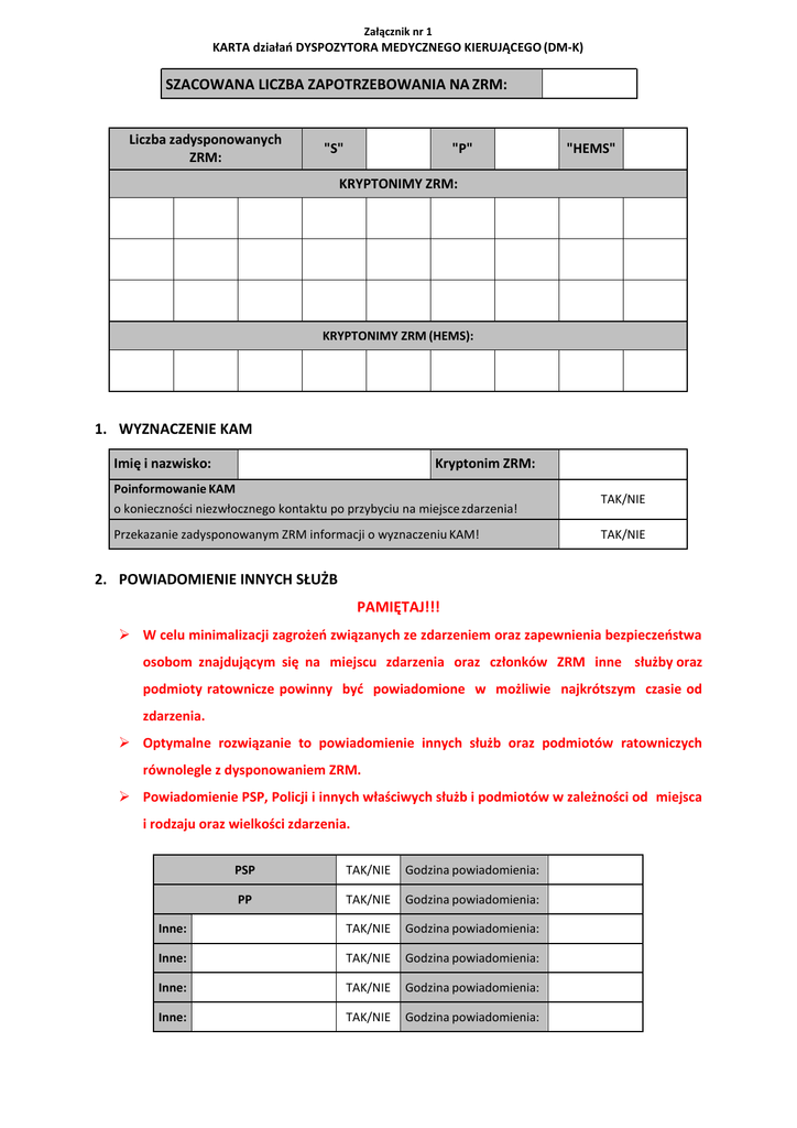 Załącznik nr 1 KARTA działań DYSPOZYTORA MEDYCZNEGO KIERUJĄCEGO (DM-K) SZACOWANA LICZBA ZAPOTRZEBOWANIA NA ZRM: Liczba zadysponowanych ZRM: "S" "P" "HEMS" KRYPTONIMY ZRM: KRYPTONIMY ZRM (HEMS): 1. WYZNACZENIE KAM Imię i nazwisko: Kryptonim ZRM: Poinformowanie KAM o konieczności niezwłocznego kontaktu po przybyciu na miejsce zdarzenia! TAK/NIE Przekazanie zadysponowanym ZRM informacji o wyznaczeniu KAM! TAK/NIE 2. POWIADOMIENIE INNYCH SŁUŻB PAMIĘTAJ!!! W celu minimalizacji zagrożeń związanych ze zdarzeniem oraz zapewnienia bezpieczeństwa osobom znajdującym się na miejscu zdarzenia oraz członków ZRM inne służby oraz podmioty ratownicze powinny być powiadomione w możliwie najkrótszym czasie od zdarzenia. Optymalne rozwiązanie to powiadomienie innych służb oraz podmiotów ratowniczych równolegle z dysponowaniem ZRM. Powiadomienie PSP, Policji i innych właściwych służb i podmiotów w zależności od miejsca i rodzaju oraz wielkości zdarzenia. PSP TAK/NIE Godzina powiadomienia: PP TAK/NIE Godzina powiadomienia: Inne: TAK/NIE Godzina powiadomienia: Inne: TAK/NIE Godzina powiadomienia: Inne: TAK/NIE Godzina powiadomienia: Inne: TAK/NIE Godzina powiadomienia: Załącznik nr 1 KARTA działań DYSPOZYTORA MEDYCZNEGO KIERUJĄCEGO (DM-K) 3. KONTAKT Z DYSPOZYTOREM KRAJOWYM CO-LPR Kontakt z CO-LPR tel. +48 2222 99999/98 TAK/NIE Godzina: Powiadomienie o wystąpieniu zdarzenia o potencjalnym charakterze masowym i przekazanie niezbędnych informacji o zdarzeniu: TAK/NIE Dostępność ZRM (HEMS): Kryptonim Baza HEMS Kryptonim Baza HEMS Kryptonim Baza HEMS Kryptonim Baza HEMS Kryptonim Baza HEMS Kryptonim Baza HEMS Przewidywany czas dotarcia (w min.): Zadysponowano Przewidywany czas dotarcia (w min.): Zadysponowano Przewidywany czas dotarcia (w min.): Zadysponowano Przewidywany czas dotarcia (w min.): Zadysponowano Przewidywany czas dotarcia (w min.): Zadysponowano Przewidywany czas dotarcia (w min.): Zadysponowano TAK/NIE TAK/NIE TAK/NIE TAK/NIE TAK/NIE TAK/NIE 4. PRACA DYSPOZYTORNI MEDYCZNEJ W TRYBIE ZDARZENIA MNOGIEGO/MASOWEGO Poinformowanie wszystkich DM o pracy w trybie ZDARZENIE MNOGIE/MASOWE TAK/NIE Wyznaczenie DM-W: Imię i nazwisko: Kod DM DM-W 1 TAK/NIE DM-W 2* TAK/NIE DM-W 3* TAK/NIE * - opcjonalnie w zależności od rodzaju i wielkości zdarzenia WYZNACZENIE zadań dla DM-W (propozycja zadań dla DM-W) Nr zadania Nr DMW Potwierdzenie Wprowadzenie dyscypliny w korespondencji radiowej 7 TAK/NIE Informacja KAM o optymalnej drodze dotarcia 10 TAK/NIE Weryfikacja dostępności ZRM - FAZA I 14 TAK/NIE Powiadomienie podmiotów leczniczych - grupa "CZERWONA" 18 TAK/NIE Weryfikacja dostępności ZRM - FAZA II 19 TAK/NIE Powiadomienie podmiotów leczniczych - grupa "ŻÓŁTA" 24 TAK/NIE Załącznik nr 1 KARTA działań DYSPOZYTORA MEDYCZNEGO KIERUJĄCEGO (DM-K) 5. WPROWADZENIE DYSCYPLINY W KORESPONDENCJI RADIOWEJ ZADANIE REALIZUJE DM-W Kryptonim radiowy dla DM-K: Kryptonim radiowy dla KAM: Kryptonim radiowy dla LKRM: TAK/NIE Nr DM-W "DYSPOZYTOR KIERUJĄCY" "KIERUJĄCY AKCJĄ MEDYCZNĄ" "LEKARZ KOORDYNATOR" Przekazanie ZRM zasad korzystania z łączności radiowej w trakcie trwania zdarzenia Ustawienie radiotelefonów na kanale: TAK/NIE ……………………………………………………………………… Zakaz nadawania TAK/NIE na czas prowadzenia działań bez wcześniejszego wywołania przez KAM lub DM-K. Podczas nawiązywania łączności i prowadzenia korespondencji obowiązuje zasada TAK/NIE „Minimum czasu nadawania – maksimum treści”. Konieczność nasłuchu na kanale: TAK/NIE ……………………………………………………………………… Kontakt z dyspozytorem medycznym w oparciu o inny kanał łączności radiowej – na kanale: TAK/NIE …………………………………. lub za pośrednictwem telefonu komórkowego. 6. POWIADOMIENIE LKRM Kontakt z LKRM tel.: + 48 ………………………………… TAK/NIE Godzina: Powiadomienie o wystąpieniu zdarzenia o potencjalnym charakterze mnogim/masowym i przekazanie niezbędnych informacji o zdarzeniu w tym informacji o KAM: TAK/NIE Zgłoszenie zapotrzebowania na ZRM dysponowane przez DM-O po TAK/NIE wskazaniu przez LKRM lub LKRM-O w ilości: ………………… ZRM Wskazanie konieczności określenia przez LKRM możliwości przyjęcia przez poszczególne szpitale poszkodowanych z grupy „CZERWONEJ” oraz w dalszej kolejności dostępności w ciągu 1 godziny i 2 godzin (przy założeniu wstrzymania planowych zabiegów operacyjnych): liczby bloków operacyjnych i ich rodzaju z zespołami operacyjnymi, stanowisk IT (z respiratorem), liczby dostępnych respiratorów (poza stanowiskami IT) – patrz TABELA SZPITALE. TAK/NIE 7. POWIADOMIENIE KIEROWNIKA PODMIOTU LECZNICZEGO/RZECZNIKA PRASOWEGO Kontakt z kierownikiem podmiotu leczniczego tel.: + 48 ……………………………………………. TAK/NIE Godzina: Powiadomienie o wystąpieniu zdarzenia o potencjalnym charakterze mnogim/masowym i przekazanie niezbędnych informacji o zdarzeniu: TAK/NIE Załącznik nr 1 KARTA działań DYSPOZYTORA MEDYCZNEGO KIERUJĄCEGO (DM-K) Kontakt z rzecznikiem prasowym tel.: + 48 ……………………………………………. TAK/NIE Godzina: Powiadomienie o wystąpieniu zdarzenia o potencjalnym charakterze masowym i przekazanie niezbędnych informacji o zdarzeniu: TAK/NIE 8. INFORMACJA KAM O OPTYMALNEJ DRODZE DOTARCIA ZADANIE REALIZUJE DM-W TAK/NIE Nr DM-W Informacja KAM o optymalnej drodze dotarcia do miejsca zdarzenia TAK/NIE Godzina: Potwierdzenie lokalizacji miejsca zdarzenia TAK/NIE Jeśli "NIE" to opisz: Potwierdzenie rodzaju/charakteru zdarzenia TAK/NIE Jeśli "NIE" to opisz: Przekazanie informacji o optymalnej drodze dotarcia i nowych zagrożeniach ZRM zadysponowanym do zdarzenia TAK/NIE Godzina: 9. WYMIANA INFORMACJI POMIĘDZY LKRM a DM-K Jeżeli zgłaszałeś LKRM zapotrzebowanie na dodatkowe ZRM przekaż informacje o optymalnej drodze dotarcia i nowych zagrożeniach TAK/