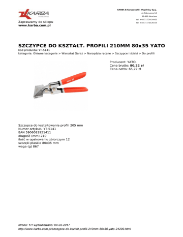 KARBA B.Karczewski i Wspólnicy Sp.J. ul. Fabryczna 14 53-609 Wrocław tel. +48 71 724-24-65 Zapraszamy do sklepu www.karba.com.pl tel. +48 71 718-20-03 SZCZYPCE DO KSZTAŁT. PROFILI 210MM 80x35 YATO kod produktu: YT-5141 kategoria: Główne kategorie > Warsztat Garaż > Narzędzia ręczne > Szczypce i ściski > Do profili Producent: YATO. Cena brutto: 80,22 zł Cena netto: 65,22 zł Szczypce do kształtowania profili 205 mm Numer artykułu YT-5141 EAN 5906083951411 długość (mm) 210 ilość w opakowaniu zbiorczym 12 szczęki płaskie 80x35 mm waga (g) 867 strona: 1/1 wydrukowano: 04-03-2017 http://www.karba.com.pl/szczypce-do-ksztalt-profili-210mm-80x35-yato-24209.html