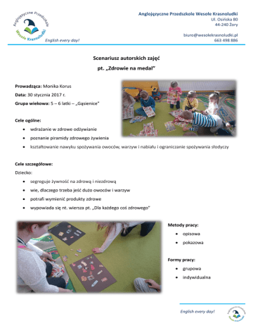 Anglojęzyczne Przedszkole Wesołe Krasnoludki Ul. Osińska 80 44-240 Żory [email protected] 663 498 886 English every day! Scenariusz autorskich zajęć pt. „Zdrowie na medal” Prowadząca: Monika Korus Data: 30 stycznia 2017 r. Grupa wiekowa: 5 – 6 latki – „Gąsienice” Cele ogólne: wdrażanie w zdrowe odżywianie poznanie piramidy zdrowego żywienia kształtowanie nawyku spożywania owoców, warzyw i nabiału i ograniczanie spożywania słodyczy Cele szczegółowe: Dziecko: segreguje żywność na zdrową i niezdrową wie, dlaczego trzeba jeść dużo owoców i warzyw potrafi wymienić produkty zdrowe wypowiada się nt. wiersza pt. „Dla każdego coś zdrowego” Metody pracy: opisowa pokazowa Formy pracy: grupowa indywidualna English every day! Anglojęzyczne Przedszkole Wesołe Krasnoludki Ul. Osińska 80 44-240 Żory English every day! [email protected] 663 498 886 Środki dydaktyczne: ilustracje zdrowej żywności gazetki z produktami spożywczymi piramida zdrowego odżywiania wiersz S. Karaszewskiego pt. „Dla każdego coś zdrowego” plastikowe talerze woreczki gimnastyczne Przebieg zajęć: 1. Zabawa integracyjna – tworzenie koła. 2. Wprowadzenie do tematyki zajęć; rozmowa na temat zdrowego odżywiania się (na podstawie ilustracji). 3. Wysłuchanie wiersza S. Karaszewskiego pt. „Dla każdego coś zdrowego” oraz rozmowa na jego temat. Treść: Jeśli chcesz się żywić zdrowo, jadaj zawsze kolorowo! Jedz owoce i jarzyny, to najlepsze witaminy! Jedz razowce z grubym ziarnem, zdrowe jest pieczywo czarne! Na kanapkę, prócz wędliny, połóż listek zieleniny! I kapusta, i sałata, w witaminy jest bogata! Oprócz klusek i kotleta niech się z jarzyn składa dieta! Jedz surówki i sałatki, będziesz za to piękny, gładki! Gotowane lub duszone zawsze zdrowsze niż smażone! Mleko, jogurt, ser, maślanka – to jest twoja wyliczanka. Chude mięso, drób i ryba to najlepsze białko chyba! Sok warzywny, owocowy, kolorowy jest i zdrowy! Kto je tłusto i obficie ten sam sobie skraca życie! Bób, fasola, groszek, soja – to potrawa będzie twoja. Sosy lepsze są niż tłuszcze, niech się w tłuszczu nic nie pluszcze! Zostaw smalec, dolej olej, niech na olej będzie kolej! Dobra także jest oliwa, bo dla zdrowia sprawiedliwa! English every day! Anglojęzyczne Przedszkole Wesołe Krasnoludki Ul. Osińska 80 44-240 Żory English every day! 4. Omówienie piramidy zdrowego żywienia. 5. Zabawa ruchowa: ”Kelnerzy”. 6. Zabawa dydaktyczna: Prawda czy fałsz? [email protected] 663 498 886 Treść: 7. przed spożyciem myjemy owoce i warzywa posiłki jemy brudnymi rękami pijemy dużo Coca-Coli brak Witamin sprzyja zdrowiu w słodyczach jest dużo witamin myjemy zęby raz w roku hamburgery są bardzo zdrowe słodycze dbają o nasze zęby owoce i warzywa szkodzą zdrowiu Praca plastyczna – makieta: „Co jest zdrowe, a co nie?” Scenariusz autorski Moniki Korus English every day!