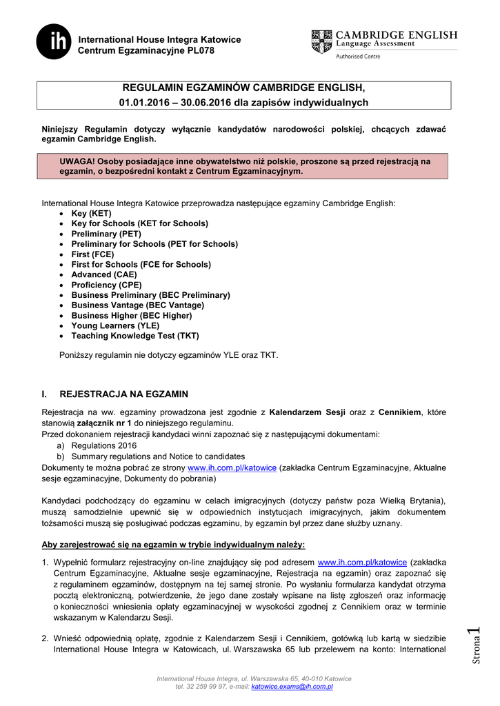 International House Integra Katowice Centrum Egzaminacyjne PL078 REGULAMIN EGZAMINÓW CAMBRIDGE ENGLISH, 01.01.2016 – 30.06.2016 dla zapisów indywidualnych Niniejszy Regulamin dotyczy wyłącznie kandydatów narodowości polskiej, chcących zdawać egzamin Cambridge English. UWAGA! Osoby posiadające inne obywatelstwo niż polskie, proszone są przed rejestracją na egzamin, o bezpośredni kontakt z Centrum Egzaminacyjnym. International House Integra Katowice przeprowadza następujące egzaminy Cambridge English: Key (KET) Key for Schools (KET for Schools) Preliminary (PET) Preliminary for Schools (PET for Schools) First (FCE) First for Schools (FCE for Schools) Advanced (CAE) Proficiency (CPE) Business Preliminary (BEC Preliminary) Business Vantage (BEC Vantage) Business Higher (BEC Higher) Young Learners (YLE) Teaching Knowledge Test (TKT) Poniższy regulamin nie dotyczy egzaminów YLE oraz TKT. I. REJESTRACJA NA EGZAMIN Rejestracja na ww. egzaminy prowadzona jest zgodnie z Kalendarzem Sesji oraz z Cennikiem, które stanowią załącznik nr 1 do niniejszego regulaminu. Przed dokonaniem rejestracji kandydaci winni zapoznać się z następującymi dokumentami: a) Regulations 2016 b) Summary regulations and Notice to candidates Dokumenty te można pobrać ze strony www.ih.com.pl/katowice (zakładka Centrum Egzaminacyjne, Aktualne sesje egzaminacyjne, Dokumenty do pobrania) Kandydaci podchodzący do egzaminu w celach imigracyjnych (dotyczy państw poza Wielką Brytania), muszą samodzielnie upewnić się w odpowiednich instytucjach imigracyjnych, jakim dokumentem tożsamości muszą się posługiwać podczas egzaminu, by egzamin był przez dane służby uznany. Aby zarejestrować się na egzamin w trybie indywidualnym należy: International House Integra, ul. Warszawska 65, 40-010 Katowice tel. 32 259 99 97, e-mail: [email protected] Strona 2. Wnieść odpowiednią opłatę, zgodnie z Kalendarzem Sesji i Cennikiem, gotówką lub kartą w siedzibie International House Integra w Katowicach, ul. Warszawska 65 lub przelewem na konto: International 1 1. Wypełnić formularz rejestracyjny on-line znajdujący się pod adresem www.ih.com.pl/katowice (zakładka Centrum Egzaminacyjne, Aktualne sesje egzaminacyjne, Rejestracja na egzamin) oraz zapoznać się z regulaminem egzaminów, dostępnym na tej samej stronie. Po wysłaniu formularza kandydat otrzyma pocztą elektroniczną, potwierdzenie, że jego dane zostały wpisane na listę zgłoszeń oraz informację o konieczności wniesienia opłaty egzaminacyjnej w wysokości zgodnej z Cennikiem oraz w terminie wskazanym w Kalendarzu Sesji. International House Integra Katowice Centrum Egzaminacyjne PL078 REGULAMIN EGZAMINÓW CAMBRIDGE ENGLISH, 01.01.2016 – 30.06.2016 dla zapisów indywidualnych House Integra Katowice 31 1050 1214 1000 0022 7343 9766. Przelew musi posiadać następujący opis: imię i nazwisko osoby zdającej egzamin oraz skróconą nazwę egzaminu (np. Maria Nowak, FCE). 3. Kandydaci przystępujący do egzaminów Cambridge English: Preliminary, First, Advanced, Proficiency (nie dotyczy to kandydatów przystępujących do egzaminów Preliminary i First w wersji „for Schools”), Business Preliminary, Business Vantage, Business Higher zobowiązani są do wypełnienia i dostarczenia do Centrum Egzaminacyjnego formularza zgody na wykonanie i przetwarzanie zdjęcia najpóźniej do końca terminu rejestracji (można wysłać skan na adres mailowy [email protected], a oryginał donieść najpóźniej w pierwszym dniu egzaminu). Zgodę na wykonanie i przetwarzanie zdjęcia podpisuje kandydat pełnoletni. W przypadku osób niepełnoletnich zgodę musi podpisać i dostarczyć do International House Integra rodzic/opiekun ustawowy. Formularze zgody można pobrać ze strony www.ih.com.pl/katowice (zakładka Centrum Egzaminacyjne, Aktualne sesje egzaminacyjne, Dokumenty do pobrania). Podany w formularzu zgody na wykonanie i przetwarzanie zdjęcia dokument tożsamości, musi być tym samym, którym kandydat będzie się legitymował podczas egzaminu. W przeciwnym razie kandydat nie zostanie wpuszczony na egzamin. UWAGA! Powyższe warunki, określone w punktach I.1, I.2, I.3 muszą zostać spełnione łącznie. Po spełnieniu ww. warunków, kandydat otrzyma pocztą elektroniczną potwierdzenie rejestracji na egzamin. Jeśli spełniony zostanie tylko jeden z tych warunków, kandydat nie będzie mógł przystąpić do egzaminu (w przypadku zrealizowania tylko warunku wniesienia opłaty, zostanie ona kandydatowi zwrócona po upłynięciu terminu zapisów na dany egzamin). Osoby w wieku poniżej 18 lat muszą być rejestrowane przez ustawowych opiekunów. Kandydaci niepełnoletni, których jedynym dowodem tożsamości na dzień egzaminu będzie legitymacja uczniowska, zobowiązani są dostarczyć kserokopię lub skan legitymacji najpóźniej w ostatnim dniu rejestracji na egzamin, w przeciwnym razie nie zostaną wpuszczeni na egzamin. 4. Uczniowie i studenci, którym przysługuje zniżka w okresie promocyjnym zapisów, zobowiązani są do przedstawienia ważnej legitymacji najpóźniej do dnia zakończenia okresu promocyjnego. Legitymację można przedstawić osobiście w Biurze International House Integra lub przesłać kserokopię pocztą tradycyjną na adres International House Integra bądź skan legitymacji pocztą elektroniczną na adres [email protected]. International House Integra, ul. Warszawska 65, 40-010 Katowice tel. 32 259 99 97, e-mail: [email protected] Strona 1. Osoby wymagające szczególnych udogodnień (np. niedowidzące, niedosłyszące) powinny zaznaczyć ten fakt w trakcie wypełniania formularza rejestracyjnego on-line oraz skontaktować się z International House Integra. Wymagane dokumenty z tym związane – zaświadczenie lekarskie (z wyjątkiem przypadków widocznej niepełnosprawności) oraz wypełniony i podpisany wniosek o szczególne udogodnienia, dostępny w International House Integra i pod adresem www.ih.com.pl/