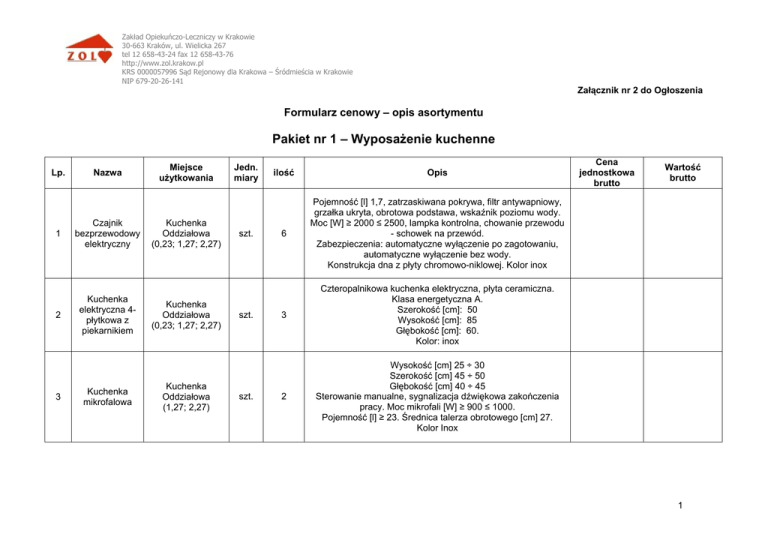 Zakład Opiekuńczo-Leczniczy w Krakowie 30-663 Kraków, ul. Wielicka 267 tel 12 658-43-24 fax 12 658-43-76 http://www.zol.krakow.pl KRS 0000057996 Sąd Rejonowy dla Krakowa – Śródmieścia w Krakowie NIP 679-20-26-141 Załącznik nr 2 do Ogłoszenia Formularz cenowy – opis asortymentu Pakiet nr 1 – Wyposażenie kuchenne Lp. Nazwa 1 Czajnik bezprzewodowy elektryczny 2 Kuchenka elektryczna 4płytkowa z piekarnikiem 3 Kuchenka mikrofalowa Miejsce użytkowania Kuchenka Oddziałowa (0,23; 1,27; 2,27) Kuchenka Oddziałowa (0,23; 1,27; 2,27) Kuchenka Oddziałowa (1,27; 2,27) Jedn. miary szt. szt. szt. ilość Opis 6 Pojemność [l] 1,7, zatrzaskiwana pokrywa, filtr antywapniowy, grzałka ukryta, obrotowa podstawa, wskaźnik poziomu wody. Moc [W] ≥ 2000 ≤ 2500, lampka kontrolna, chowanie przewodu - schowek na przewód. Zabezpieczenia: automatyczne wyłączenie po zagotowaniu, automatyczne wyłączenie bez wody. Konstrukcja dna z płyty chromowo-niklowej. Kolor inox 3 Czteropalnikowa kuchenka elektryczna, płyta ceramiczna. Klasa energetyczna A. Szerokość [cm]: 50 Wysokość [cm]: 85 Głębokość [cm]: 60. Kolor: inox 2 Wysokość [cm] 25 ÷ 30 Szerokość [cm] 45 ÷ 50 Głębokość [cm] 40 ÷ 45 Sterowanie manualne, sygnalizacja dźwiękowa zakończenia pracy. Moc mikrofali [W] ≥ 900 ≤ 1000. Pojemność [l] ≥ 23. Średnica talerza obrotowego [cm] 27. Kolor Inox Cena jednostkowa brutto Wartość brutto 1 Zakład Opiekuńczo-Leczniczy w Krakowie 30-663 Kraków, ul. Wielicka 267 tel 12 658-43-24 fax 12 658-43-76 http://www.zol.krakow.pl KRS 0000057996 Sąd Rejonowy dla Krakowa – Śródmieścia w Krakowie NIP 679-20-26-141 4 5 6 Kuchenka mikrofalowa Kuchenka Oddziałowa (0,19) Okap wentylacyjny przyścienny Kuchenka Oddziałowa (0,23; 1,27; 2,27) Chłodziarka domowa Pomieszczenie socjalne (0,18; 1,18; 2,18) i gabinety zabiegowe (0,19; 1,25; 2,25) szt. szt. szt. 1 Wysokość [cm] 25 ÷ 30 Szerokość [cm] 45 ÷ 50 Głębokość [cm] 40 ÷ 45 Sterowanie manualne, sygnalizacja dźwiękowa zakończenia pracy. Moc mikrofali [W] ≥ 900 ≤ 1000. Pojemność [l] ≥ 23. Średnica talerza obrotowego [cm] 27. Kolor inox 3 Okap wykonany ze stali nierdzewnej kwasoodpornej przeznaczony do wychwytywania i odprowadzania zapachów, pary i nadmiaru ciepła z pomieszczenia kuchni. Standardowo okap jest wyposażony w tzw. łapacze tłuszczu, czyli filtry wychwytujące tłuszcz (główny nośnik zapachów), kranik spustowy do usuwania nadmiaru tłuszczu i wilgoci oraz króćce przyłączeniowe. Szerokość 60 cm, wysokość 40 ÷ 50 cm. Kolor inox 6 Wewnętrzny zamrażalnik, półki 1 szklana, 1 pojemnik na warzywa, 3 balkoniki na drzwiach, klasa energetyczna A+, pojemność chłodziarki 116 l, zastosowana technologia AntiBacteria, poziom hałasu 38. Wymiary (cm): 82,5 ÷ 87,5 (wysokość) x 52,5 ÷ 57,5 (szerokość) x 55,5 ÷ 60,5 (głębokość) 7 Chłodziarka domowa Kuchenka Oddziałowa (0,23; 1,27; 2,27) szt. 3 Chłodziarko-zamrażarka o szerokości 59.5 cm, pojemności całkowitej netto 263 l, w klasie energetycznej A+. Wysokość [cm]: 167 Szerokość [cm]: 59.5 Głębokość [cm]: 65.5 Powłoka antybakteryjna. Czynnik chłodzący: R600a. Ilość agregatów ≥ 1. Obustronny montaż drzwi: Tak. Poziom hałasu [dB] ≤ 37 Oświetlenie wnętrza. Kolor inox 8 Chlebak Kuchenka Oddziałowa (1,27; 2,27) szt. 2 Chlebak wykonany ze stali. Wymiary: 41 ÷ 45 cm (szerokość) x 24 ÷ 28 cm (głębokość) x 17 ÷ 19 cm (wysokość). Kolor inox 2 Zakład Opiekuńczo-Leczniczy w Krakowie 30-663 Kraków, ul. Wielicka 267 tel 12 658-43-24 fax 12 658-43-76 http://www.zol.krakow.pl KRS 0000057996 Sąd Rejonowy dla Krakowa – Śródmieścia w Krakowie NIP 679-20-26-141 9 Chlebak Kuchenka Oddziałowa (0,23) szt. 1 Chlebak wykonany ze stali. Wymiary: 30 ÷ 35 cm (szerokość) x 23 ÷ 27 cm (głębokość) x 14 ÷ 18 cm (wysokość). Kolor inox 10 Suszarka Kuchenka Oddziałowa (0,23; 1,27; 2,27) szt. 3 Suszarka wisząca do naczyń z drutu chromowanego, dwupoziomowa z tacką. Wymiary: szerokość 45 ÷ 50 cm, głębokość 22 ÷ 26 cm, wysokość 34 ÷ 39 cm XXX XXX XXX XXX XXX XXX ………………………………………. /Miejscowość, data/ XXX ……………………………………… /podpis osoby(osób) uprawnionej(ych) do reprezentowania Wykonawcy/ UWAGA: w przypadku składania przez Wykonawcę ofert na konkretne pakiety należy dołączyć do oferty całość załącznika nr 2 do Ogłoszenia przekreślając te pakiety, na które Wykonawca nie składa oferty. 3 Zakład Opiekuńczo-Leczniczy w Krakowie 30-663 Kraków, ul. Wielicka 267 tel 12 658-43-24 fax 12 658-43-76 http://www.zol.krakow.pl KRS 0000057996 Sąd Rejonowy dla Krakowa – Śródmieścia w Krakowie NIP 679-20-26-141 Pakiet nr 2 – Lustra Lp. Nazwa Miejsce użytkowania Lustro Sale chorych i inne nadumywalkowe 1 XXX XXX XXX ………………………………………. /Miejscowość, data/ Jedn. miary Cena jednostkowa brutto ilość Opis szt. 111 Lustro pionowe, z półką dolną, zawieszane, kolor biały, grubość szkła 3 ÷ 5 cm. Oświetlenie nie wymagane. Szlifowane krawędzie lustra. Wymiary (cm) 60 ÷ 70 (wysokość) x 50 ÷ 55 (szerokość) x 15 ÷ 20 (głębokość dolnej półki). XXX XXX XXX Wartość brutto XXX ……………………………………… /podpis osoby(osób) uprawnionej(ych) do reprezentowania Wykonawcy/ UWAGA: w przypadku składania przez Wykonawcę ofert na konkretne pakiety należy dołączyć do oferty całość załącznika nr 2 do Ogłoszenia przekreślając te pakiety, na które Wykonawca nie składa oferty. 4 Zakład Opiekuńczo-Leczniczy w Krakowie 30-663 Kraków, ul. Wielicka 267 tel 12 658-43-24 fax 12 658-43-76 http://www.zol.krakow.pl KRS 0000057996 Sąd Rejonowy dla Krakowa – Śródmieścia w Krakowie NIP 679-20-26-141 Pakiet nr 3 – Wyposażenie łazienkowe – wieszaki Lp. Nazwa Miejsce użytkowania Jedn. miary ilość Opis Cena jednostkowa brutto 1 Wieszak na ręczniki Sale ch