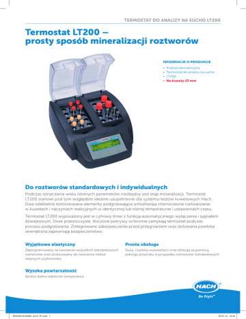 TERMOSTAT DO ANALIZY NA SUCHO LT200 Termostat LT200 – prosty sposób mineralizacji roztworów INFORMACJE O PRODUKCIE • • • • Analiza laboratoryjna Termostat do analizy na sucho LT200 Na kuwety 13 mm Do roztworów standardowych i indywidualnych Podczas oznaczania wielu istotnych parametrów niezbędny jest etap minaralizacji. Termostat LT200 stanowi pod tym względem idealne uzupełnienie dla systemu testów kuwetowych Hach. Dwa oddzielnie kontrolowane elementy podgrzewające umożliwiają równoczesne roztwarzanie w kuwetach i naczyniach reakcyjnych w identycznej lub różnej temperaturze i ustawieniach czasu. Termostat LT200 wyposażony jest w cyfrowy timer z funkcją automatycznego wyłączania i sygnałem dźwiękowym. Dwie przezroczyste, tłoczone pokrywy ochronne zamykają termostat podczas procesu podgrzewania. Zintegrowane zabezpieczenie przed przegrzaniem oraz izolowana powłoka zewnętrzna zapewniają bezpieczeństwo. Wyjątkowo elastyczny Prosta obsługa Zaprogramowany na tworzenie wszystkich standardowych roztworów oraz dostosowany do tworzenia metod własnych użytkownika Duży, czytelny wyświetlacz oraz obsługa za pomocą jednego przycisku w przypadku roztworów standardowych Wysoka powtarzalność Bardzo dobra stabilność temperatury DOC062.60.00361.Jul15_PL.indd 1 30.07.15 18:44 Dane techniczne Typ Nr kat. LT200-1 LT200-2 LT200-2 LT200-2 LTV082.99.10002 LTV082.99.21002 LTV082.99.23002 LTV082.99.51002 Programy podgrzewania Zaprogramowany dla 40 °C, 100 °C, 148 °C i dowolnie dla 37-150 °C, 1-480 min Czas rozgrzewania Od 20 °C do 148 °C w 10 min Stabilność temperatury Pobór mocy ±1 °C wg normy DIN, EN, ISO, metody EPA 115 V / 300 VA 115 V / 600 VA 230 V / 450 VA 230 V / 900 VA Waga 2 kg Wymiary 2,8 kg 250 × 145 × 310 mm (szer. × wys. × gł.) Schemat 9× 13 mm (średnica) 21× 13 mm (średnica) 2× 20 mm (średnica) 4× 20 mm (średnica) LT200-1 z elementem podgrzewającym 30× 13 mm (średnica) 12× 13 mm (średnica) 8× 20 mm (średnica) Modele LT200-2 wyposażone są w dwa niezależnie od siebie, sterowane elementy podgrzewające Zastosowanie Temp. [°C] Tid [min.] ChZT 148 120 Kwasy organiczne 100 10 Azot ogólny (Laton) 100 60 Fosfor ogólny 100 60 Metale (ołów, kadm, żelazo, miedź, nikiel, srebro, cynk) 100 60 Chrom ogólny 100 60 AOX, OWO 100 120 Dwutlenek węgla 100 60 Cyna 100 30 Formaldehyd 40 10 Cyjanki łatwo uwalniane 100 60 Programy indywidualne 37-150 1–480 Ändringar förbehållna. DOC062.60.00361.Jul15_PL.indd 2 DOC062.60.00361.Jul15 Liczba kuwet 30.07.15 18:44