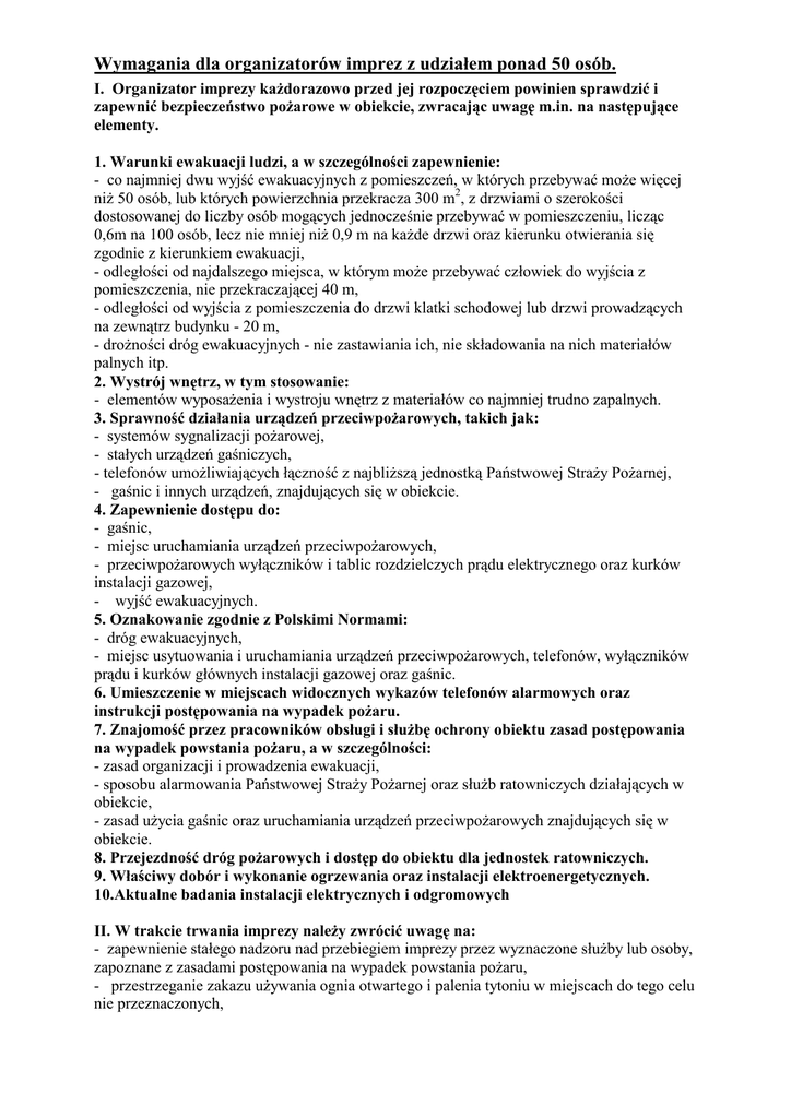 Wymagania dla organizatorów imprez z udziałem ponad 50 osób. I. Organizator imprezy kaŜdorazowo przed jej rozpoczęciem powinien sprawdzić i zapewnić bezpieczeństwo poŜarowe w obiekcie, zwracając uwagę m.in. na następujące elementy. 1. Warunki ewakuacji ludzi, a w szczególności zapewnienie: - co najmniej dwu wyjść ewakuacyjnych z pomieszczeń, w których przebywać moŜe więcej niŜ 50 osób, lub których powierzchnia przekracza 300 m2, z drzwiami o szerokości dostosowanej do liczby osób mogących jednocześnie przebywać w pomieszczeniu, licząc 0,6m na 100 osób, lecz nie mniej niŜ 0,9 m na kaŜde drzwi oraz kierunku otwierania się zgodnie z kierunkiem ewakuacji, - odległości od najdalszego miejsca, w którym moŜe przebywać człowiek do wyjścia z pomieszczenia, nie przekraczającej 40 m, - odległości od wyjścia z pomieszczenia do drzwi klatki schodowej lub drzwi prowadzących na zewnątrz budynku - 20 m, - droŜności dróg ewakuacyjnych - nie zastawiania ich, nie składowania na nich materiałów palnych itp. 2. Wystrój wnętrz, w tym stosowanie: - elementów wyposaŜenia i wystroju wnętrz z materiałów co najmniej trudno zapalnych. 3. Sprawność działania urządzeń przeciwpoŜarowych, takich jak: - systemów sygnalizacji poŜarowej, - stałych urządzeń gaśniczych, - telefonów umoŜliwiających łączność z najbliŜszą jednostką Państwowej StraŜy PoŜarnej, - gaśnic i innych urządzeń, znajdujących się w obiekcie. 4. Zapewnienie dostępu do: - gaśnic, - miejsc uruchamiania urządzeń przeciwpoŜarowych, - przeciwpoŜarowych wyłączników i tablic rozdzielczych prądu elektrycznego oraz kurków instalacji gazowej, - wyjść ewakuacyjnych. 5. Oznakowanie zgodnie z Polskimi Normami: - dróg ewakuacyjnych, - miejsc usytuowania i uruchamiania urządzeń przeciwpoŜarowych, telefonów, wyłączników prądu i kurków głównych instalacji gazowej oraz gaśnic. 6. Umieszczenie w miejscach widocznych wykazów telefonów alarmowych oraz instrukcji postępowania na wypadek poŜaru. 7. Znajomość przez pracowników obsługi i słuŜbę ochrony obiektu zasad postępowania na wypadek powstania poŜaru, a w szczególności: - zasad organizacji i prowadzenia ewakuacji, - sposobu alarmowania Państwowej StraŜy PoŜarnej oraz słuŜb ratowniczych działających w obiekcie, - zasad uŜycia gaśnic oraz uruchamiania urządzeń przeciwpoŜarowych znajdujących się w obiekcie. 8. Przejezdność dróg poŜarowych i dostęp do obiektu dla jednostek ratowniczych. 9. Właściwy dobór i wykonanie ogrzewania oraz instalacji elektroenergetycznych. 10.Aktualne badania instalacji elektrycznych i odgromowych II. W trakcie trwania imprezy naleŜy zwrócić uwagę na: - zapewnienie stałego nadzoru nad przebiegiem imprezy przez wyznaczone słuŜby lub osoby, zapoznane z zasadami postępowania na wypadek powstania poŜaru, - przestrzeganie zakazu uŜywania ognia otwartego i palenia tytoniu w miejscach do tego celu nie przeznaczonych, - utrzymanie droŜności dróg ewakuacyjnych i moŜliwości natychmiastowego otwarcia drzwi ewakuacyjnych, - zapewnienie przejezdności dróg poŜarowych i zachowanie dostępu do obiektu dla jednostek ratowniczych, - sprawność urządzeń nagłaśniających i oświetleniowych, - zachowanie bezpieczeństwa podczas stosowania efektów specjalnych, - przestrzeganie zakazu uŜywania wyrobów pirotechnicznych wewnątrz pomieszczeń, - stosowanie się do postanowień instrukcji obsługi wyrobów pirotechnicznych, - przestrzeganie wymagań prawa lokalnego w zakresie uŜywania wyrobów pirotechnicznych, - przestrzeganie zasad bezpieczeństwa przez uczestników imprezy. III. Imprezy masowe Zgodnie z ustawą z dnia 22 sierpnia 1997 r., poprzez imprezę masową rozumie się imprezę sportową, artystyczną lub rozrywkową, na której liczba miejsc dla osób na stadionie, w innym obiekcie niebędącym budynkiem lub na terenie umoŜliwiającym przeprowadzenie imprezy masowej wynosi - nie mniej niŜ 1.000, a w przypadku hali sportowej lub innego budynku umoŜliwiającego przeprowadzenie imprezy - nie mniej niŜ 300 (nie dotyczy imprez odbywających się w teatrach, kinach, placówkach oświatowych itp.). Bezpieczeństwo imprezy masowej polega na spełnieniu przez organizatora imprezy (osobę prawną, osobę fizyczną lub jednostkę organizacyjną nieposiadającą osobowości prawnej) wymogów w zakresie bezpieczeństwa osób obecnych na imprezie w czasie jej trwania, ochrony porządku publicznego, zabezpieczenia pod względem medycznym, a takŜe stanu technicznego obiektów budowlanych wraz ze słuŜącymi tym obiektom instalacjami i urządzeniami technicznymi, w szczególności przeciwpoŜarowymi i sanitarnymi. Organizator imprezy masowej, w uzgodnieniu z właściwym miejscowo komendantem powiatowym (miejskim) Państwowej StraŜy PoŜarnej, powinien określić szczegółowe zasady postępowania w przypadku powstania poŜaru lub innego miejscowego zagroŜenia w obiekcie (terenie), w którym planuje się przeprowadzenie imprezy. PowyŜsze uzgodnienie zasad postępowania stanowi m.in. podstawę do wystąpienia przez organizatora imprezy masowej z wnioskiem, do właściwego ze względu na miejsce przeprowadzenia imprezy organu administracji samorządowej (wójta, burmistrza lub prezydenta miasta), o wydanie zezwolenia na przeprowadzenie imprezy masowej. Organizator imprezy masowej jest obowiązany do zapewnienia bezpieczeństwa osobom obecnym na imprezie oraz porządku podczas jej trwania. W tym celu powinien przede wszystkim zapewnić: 1. Spełnienie wymogów określonych w przepisach prawa, w szczególności w przepisach budowlanych, sanitarnych i dotyczących ochrony przeciwpoŜarowej, 2. SłuŜbę porządkową i informacyjną, 3. Pomoc medyczną oraz zaplecze higieniczno-sanitarne, 4. Drogi ewakuacyjne oraz drogi umoŜliwiające dojazd jednostkom ratowniczogaśniczym i innym słuŜbom interwencyjnym, 5. Warunki zorganizowania łączności pomięd