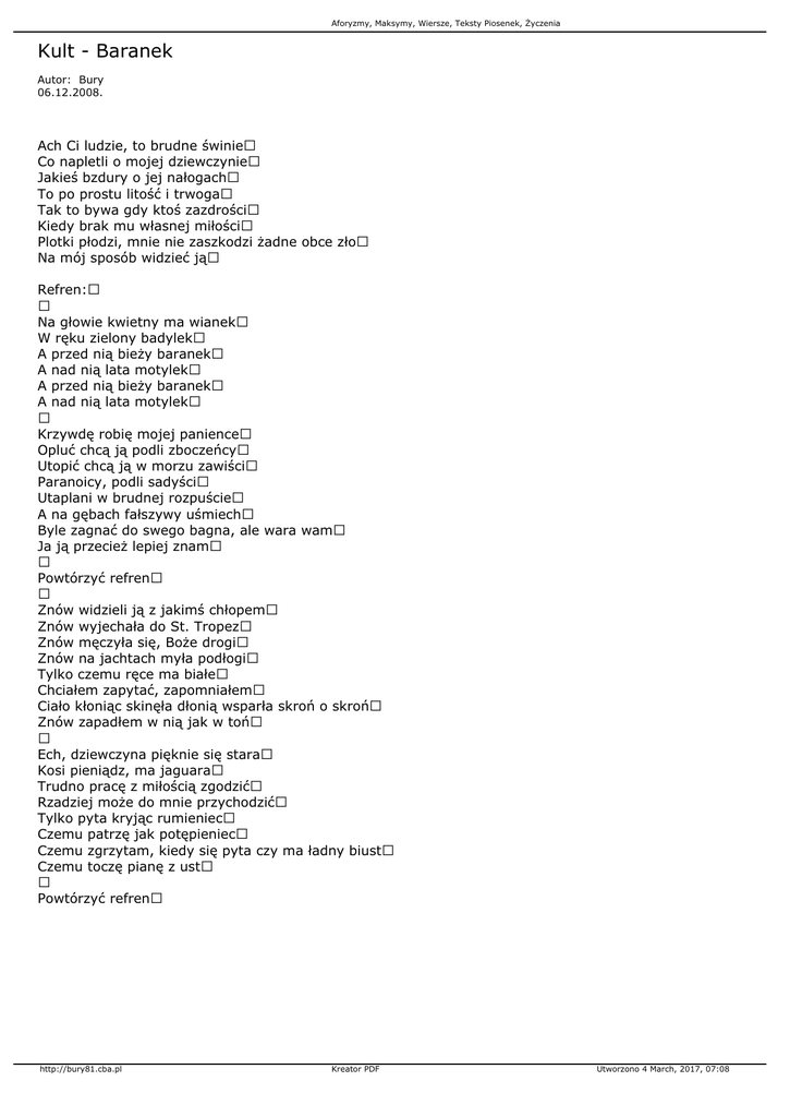 Aforyzmy, Maksymy, Wiersze, Teksty Piosenek, Życzenia Kult - Baranek Autor: Bury 06.12.2008. Ach Ci ludzie, to brudne świnie Co napletli o mojej dziewczynie Jakieś bzdury o jej nałogach To po prostu litość i trwoga Tak to bywa gdy ktoś zazdrości Kiedy brak mu własnej miłości Plotki płodzi, mnie nie zaszkodzi żadne obce zło Na mój sposób widzieć ją Refren: Na głowie kwietny ma wianek W ręku zielony badylek A przed nią bieży baranek A nad nią lata motylek A przed nią bieży baranek A nad nią lata motylek Krzywdę robię mojej panience Opluć chcą ją podli zboczeńcy Utopić chcą ją w morzu zawiści Paranoicy, podli sadyści Utaplani w brudnej rozpuście A na gębach fałszywy uśmiech Byle zagnać do swego bagna, ale wara wam Ja ją przecież lepiej znam Powtórzyć refren Znów widzieli ją z jakimś chłopem Znów wyjechała do St. Tropez Znów męczyła się, Boże drogi Znów na jachtach myła podłogi Tylko czemu ręce ma białe Chciałem zapytać, zapomniałem Ciało kłoniąc skinęła dłonią wsparła skroń o skroń Znów zapadłem w nią jak w toń Ech, dziewczyna pięknie się stara Kosi pieniądz, ma jaguara Trudno pracę z miłością zgodzić Rzadziej może do mnie przychodzić Tylko pyta kryjąc rumieniec Czemu patrzę jak potępieniec Czemu zgrzytam, kiedy się pyta czy ma ładny biust Czemu toczę pianę z ust Powtórzyć refren http://bury81.cba.pl Kreator PDF Utworzono 4 March, 2017, 07:08