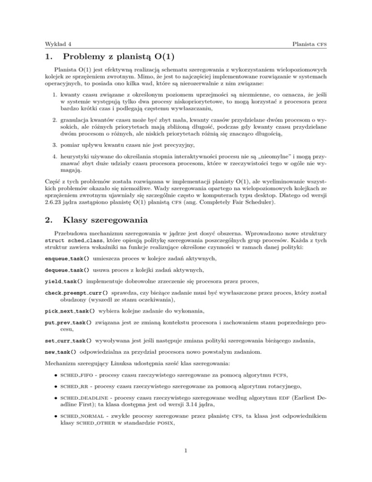 Wykład 4 1. Planista cfs Problemy z planistą O(1) Planista O(1) jest efektywną realizacją schematu szeregowania z wykorzystaniem wielopoziomowych kolejek ze sprzężeniem zwrotnym. Mimo, że jest to najczęściej implementowane rozwiązanie w systemach operacyjnych, to posiada ono kilka wad, które są nierozerwalnie z nim związane: 1. kwanty czasu związane z określonym poziomem uprzejmości są niezmienne, co oznacza, że jeśli w systemie występują tylko dwa procesy niskopriorytetowe, to mogą korzystać z procesora przez bardzo krótki czas i podlegają częstemu wywłaszczaniu, 2. granulacja kwantów czasu może być zbyt mała, kwanty czasów przydzielane dwóm procesom o wysokich, ale różnych priorytetach mają zbliżoną długość, podczas gdy kwanty czasu przydzielane dwóm procesom o różnych, ale niskich priorytetach różnią się znacząco długością, 3. pomiar upływu kwantu czasu nie jest precyzyjny, 4. heurystyki używane do określania stopnia interaktywności procesu nie są „nieomylne” i mogą przyznawać zbyt duże udziały czasu procesora procesom, które w rzeczywistości tego w ogóle nie wymagają. Część z tych problemów została rozwiązana w implementacji planisty O(1), ale wyeliminowanie wszystkich problemów okazało się niemożliwe. Wady szeregowania opartego na wielopoziomowych kolejkach ze sprzężeniem zwrotnym ujawniały się szczególnie często w komputerach typu desktop. Dlatego od wersji 2.6.23 jądra zastąpiono planistę O(1) planistą cfs (ang. Completely Fair Scheduler). 2. Klasy szeregowania Przebudowa mechanizmu szeregowania w jądrze jest dosyć obszerna. Wprowadzono nowe struktury struct sched class, które opisują politykę szeregowania poszczególnych grup procesów. Każda z tych struktur zawiera wskaźniki na funkcje realizujące określone czynności w ramach danej polityki: enqueue task() umieszcza proces w kolejce zadań aktywnych, dequeue task() usuwa proces z kolejki zadań aktywnych, yield task() implementuje dobrowolne zrzeczenie się procesora przez proces, check preempt curr() sprawdza, czy bieżące zadanie musi być wywłaszczone przez proces, który został obudzony (wyszedł ze stanu oczekiwania), pick next task() wybiera kolejne zadanie do wykonania, put prev task() związana jest ze zmianą kontekstu procesora i zachowaniem stanu poprzedniego procesu, set curr task() wywoływana jest jeśli następuje zmiana polityki szeregowania bieżącego zadania, new task() odpowiedzialna za przydział procesora nowo powstałym zadaniom. Mechanizm szeregujący Linuksa udostępnia sześć klas szeregowania: • sched fifo - procesy czasu rzeczywistego szeregowane za pomocą algorytmu fcfs, • sched rr - procesy czasu rzeczywistego szeregowane za pomocą algorytmu rotacyjnego, • sched deadline - procesy czasu rzeczywistego szeregowane według algorytmu edf (Earliest Deadline First); ta klasa dostępna jest od wersji 3.14 jądra, • sched normal - zwykłe procesy szeregowane przez planistę cfs, ta klasa jest odpowiednikiem klasy sched other w standardzie posix, 1 Wykład 4 Planista cfs • sched batch - jest to klasa procesów niskopriorytetowych ograniczonych przez procesor, które obsługiwane są przez planistę cfs, • sched idle - klasa procesów o jeszcze niższym priorytecie niż sched batch. Warto odnotować, że nowy mechanizm szeregowania może szeregować nie tylko pojedyncze procesy, ale i grupy procesów, zatem to co podlega szeregowaniu jest określane jako jednostka szeregowania i jest opisane strukturą struct sched entity. Pole tego typu jest umieszczone w deskryptorze procesu. Przykładem takiej grupy jest grupa procesów czasu rzeczywistego, która od wersji jądra 2.6.25 podlega szeregowaniu rt bandwidth. To szeregowanie zakłada, że 95% jednej sekundy pracy procesora ma być poświęcone na realizację procesów czasu rzeczywistego, a 5% na realizację „zwykłych” procesów. Te proporcje są konfigurowalne. Podstawowym celem wprowadzenia tej metody szeregowania jest zapobieganie monopolizacji procesora przez procesy z klasy szeregowania sched fifo. 3. Priorytety Priorytety procesów od czasu wprowadzenia mechanizmu cfs stały się prawie niezmienne. Służą one do określenia tak zwanej wagi procesu. Istnieje jednak sytuacja wyjątkowa, która pozwala zmienić tymczasowo priorytet procesu normalnego na priorytet czasu rzeczywistego. Tą sytuacją jest korzystanie przez proces z wywołania systemowego, które używa muteksu czasu rzeczywistego (ang. rt-mutex). Ma to na celu zapobieżenie zjawisku inwersji priorytetów. 4. Sprawiedliwe szeregowanie - koncepcja W szeregowaniu sprawiedliwym nie występuje pojęcie kwantów czasu, a przynajmniej nie jest ono obecne w takiej postaci jak w szeregowaniu rotacyjnym. Głównym kryterium jest tu moc obliczeniowa procesora. Planista dąży do tego, aby każdy z procesów otrzymał należną mu porcje tej mocy. Gdyby istniał procesor idealny, to każdemu z n identycznych zadań gotowych do wykonania przydzielałby n1 mocy tego procesora. Każde z tych zadań wykonywałoby się n razy wolniej, niż gdyby korzystało samodzielnie z procesora, ale za to wszystkie zdania kończyłyby się w tym samym czasie od przydzielenia procesora i wykonywałyby się bez zbędnych przerw. W rzeczywistych komputerach taka koncepcja nie jest możliwa do realizacji. Można jednak przydzielać procesom procesor na podstawie czasu przez który one nie korzystały z procesora. Przykładowo, jeśli w systemie jest tylko jeden proces gotowy do uruchomienia to może on korzystać dowolnie długo z procesora, czyli do czasu aż skorzysta z wywołania systemowego, które wprowadzi go w stan oczekiwania. Jeśli jednak pojawi się nowy proces gotów do wykonania, to wywłaszcza on bieżące zadanie, bo krócej korzystał z procesora. Planista cfs przydziela więc procesor temu procesowi, który najkrócej z niego korzystał. Czas oczekiwania liczony jest na podstawie wskazań