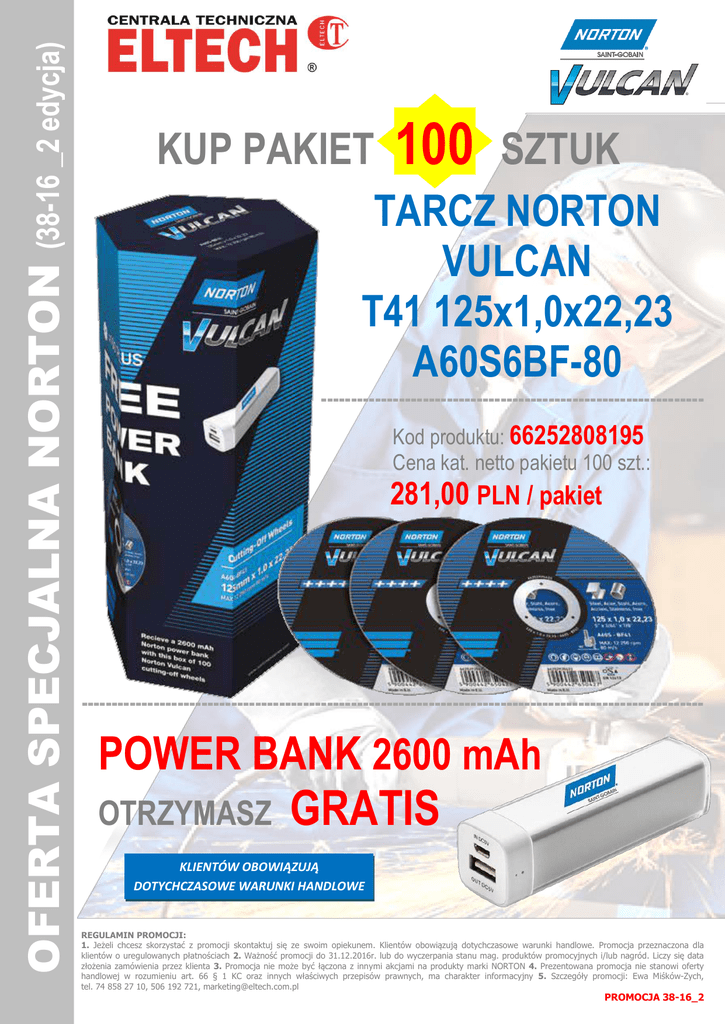 (38-16 _2 edycja) OFERTA SPECJALNA NORTON KUP PAKIET 100 SZTUK TARCZ NORTON VULCAN T41 125x1,0x22,23 A60S6BF-80 ---------------------------------------------------------------Kod produktu: 66252808195 Cena kat. netto pakietu 100 szt.: 281,00 PLN / pakiet -------------------------------------------------------------------------------------------------------- POWER BANK 2600 mAh OTRZYMASZ GRATIS KLIENTÓW OBOWIĄZUJĄ DOTYCHCZASOWE WARUNKI HANDLOWE REGULAMIN PROMOCJI: 1. Jeżeli chcesz skorzystać z promocji skontaktuj się ze swoim opiekunem. Klientów obowiązują dotychczasowe warunki handlowe. Promocja przeznaczona dla klientów o uregulowanych płatnościach 2. Ważność promocji do 31.12.2016r. lub do wyczerpania stanu mag. produktów promocyjnych i/lub nagród. Liczy się data złożenia zamówienia przez klienta 3. Promocja nie może być łączona z innymi akcjami na produkty marki NORTON 4. Prezentowana promocja nie stanowi oferty handlowej w rozumieniu art. 66 § 1 KC oraz innych właściwych przepisów prawnych, ma charakter informacyjny 5. Szczegóły promocji: Ewa Miśków-Zych, tel. 74 858 27 10, 506 192 721, [email protected] PROMOCJA 38-16_2