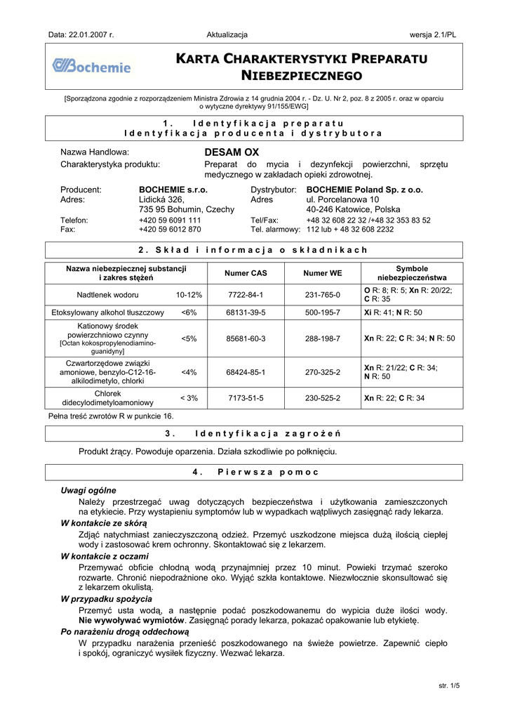 Data: 22.01.2007 r. Aktualizacja wersja 2.1/PL KARTA CHARAKTERYSTYKI PREPARATU NIEBEZPIECZNEGO [Sporządzona zgodnie z rozporządzeniem Ministra Zdrowia z 14 grudnia 2004 r. - Dz. U. Nr 2, poz. 8 z 2005 r. oraz w oparciu o wytyczne dyrektywy 91/155/EWG] 1. Identyfikacja preparatu Identyfikacja producenta i dystrybutora DESAM OX Nazwa Handlowa: Charakterystyka produktu: Preparat do mycia i dezynfekcji powierzchni, medycznego w zakładach opieki zdrowotnej. sprzętu Producent: Adres: BOCHEMIE s.r.o. Lidická 326, 735 95 Bohumin, Czechy Dystrybutor: Adres BOCHEMIE Poland Sp. z o.o. ul. Porcelanowa 10 40-246 Katowice, Polska Telefon: Fax: +420 59 6091 111 +420 59 6012 870 Tel/Fax: +48 32 608 22 32 /+48 32 353 83 52 Tel. alarmowy: 112 lub + 48 32 608 2232 2. Skład i informacja o składnikach Nazwa niebezpiecznej substancji i zakres stężeń Numer CAS Numer WE Symbole niebezpieczeństwa Nadtlenek wodoru 10-12% 7722-84-1 231-765-0 O R: 8; R: 5; Xn R: 20/22; C R: 35 Etoksylowany alkohol tłuszczowy <6% 68131-39-5 500-195-7 Xi R: 41; N R: 50 Kationowy środek powierzchniowo czynny <5% 85681-60-3 288-198-7 Xn R: 22; C R: 34; N R: 50 Czwartorzędowe związki amoniowe, benzylo-C12-16alkilodimetylo, chlorki <4% 68424-85-1 270-325-2 Xn R: 21/22; C R: 34; N R: 50 Chlorek didecylodimetyloamoniowy < 3% 7173-51-5 230-525-2 Xn R: 22; C R: 34 [Octan kokospropylenodiaminoguanidyny] Pełna treść zwrotów R w punkcie 16. 3. Identyfikacja zagrożeń Produkt żrący. Powoduje oparzenia. Działa szkodliwie po połknięciu. 4. Pierwsza pomoc Uwagi ogólne Należy przestrzegać uwag dotyczących bezpieczeństwa i użytkowania zamieszczonych na etykiecie. Przy wystapieniu symptomów lub w wypadkach wątpliwych zasięgnąć rady lekarza. W kontakcie ze skórą Zdjąć natychmiast zanieczyszczoną odzież. Przemyć uszkodzone miejsca dużą ilością ciepłej wody i zastosować krem ochronny. Skontaktować się z lekarzem. W kontakcie z oczami Przemywać obficie chłodną wodą przynajmniej przez 10 minut. Powieki trzymać szeroko rozwarte. Chronić niepodrażnione oko. Wyjąć szkła kontaktowe. Niezwłocznie skonsultować się z lekarzem okulistą. W przypadku spożycia Przemyć usta wodą, a następnie podać poszkodowanemu do wypicia duże ilości wody. Nie wywoływać wymiotów. Zasięgnąć porady lekarza, pokazać opakowanie lub etykietę. Po narażeniu drogą oddechową W przypadku narażenia przenieść poszkodowanego na świeże powietrze. Zapewnić ciepło i spokój, ograniczyć wysiłek fizyczny. Wezwać lekarza. str. 1/5 KARTA CHARAKTERYSTYKI PREPARATU NIEBEZPIECZNEGO Nazwa Handlowa: Producent: Adres: Telefon/Fax: Data aktualizacji: DESAM OX BOCHEMIE s.r.o. Lidická 326 735 95 Bohumin, Czechy +420 59 6091111/+420 59 6012870 22.01.2007 r. 5. Dystrybutor: Adres: Telefon/Fax: Wersja: BOCHEMIE POLAND Sp. z o.o. ul. Porcelanowa 10 40-246 Katowice, Polska +48 32 608 2232/ +48 32 353 8352 2.1/PL Postępowanie w przypadku pożaru Odpowiednie środki gaśnicze Piana, gaśnica śniegowa, proszkowa, mgła wodna. Środki gaśnicze dostosować do palących się substancji w otoczeniu. Nieodpowiednie środki gaśnicze Zwarty strumień wody-ryzyko rozproszenia pożaru. Uwagi dodatkowe Produkt sam nie jest palny. Środki ochrony ogólnej typowe w przypadku pożaru. Nie należy przebywać w zagrożonej ogniem strefie bez odpowiedniego ubrania i aparatu do oddychania z niezależnym obiegiem powietrza. W miarę możliwości pojemniki z produktem usunąć z zagrożonego obszaru. Nie należy dopuścić do przedostania się wody gaśniczej do kanalizacji, obiegu wody. Niebezpieczne produkty rozkładu Podczas pożaru pod wpływem wysokiej temperatury dojść może do rozkładu preparatu z wydzieleniem tlenu, który podtrzymuje pożar. 6. P o stę pow a n ie w prz yp a d ku n iez a m ierz on eg o uw oln i en i a do ś ro dow iska Indywidualne środki ostrożności Należy przestrzegać ogólnych zasad bezpieczeństwa. Używać odpowiednie środki ochrony osobistej. Unikać kontaktu ze skórą i oczami. Patrz także pkt 8 karty. Niezbędne środki w zakresie ochrony środowiska Unikać przedostania się większych ilości preparatu do wód powierzchniowych lub gruntowych, obiegu wody. W razie potrzeby wezwać odpowiednie służby ratownicze i poczynić odpowiednie kroki w celu niedopuszczenia do zanieczyszczenia środowiska. Metody oczyszczania/wchłaniania Po rozlaniu małej ilości, preparat należy spłukać dużą ilością wody. W przypadku rozlania dużych ilości preparatu użyć odpowiednich materiałów pochłaniających ciecze (np. piasek, trociny). Zebrany materiał traktować jak odpady (umieścić w oznakowanych pojemnikach) i dalej postępować wg pkt 13. W razie potrzeby wezwać służbę ratowniczą. 7. Postępowanie z preparatem i jego magazynowanie Środki ostrożności podczas obchodzenia się z substancją Przestrzegać przepisów prawnych w zakresie ochrony i bezpieczeństwa. Pracować w dobrze wentylowanym pomieszczeniu. Nosić odpowiednią odzież ochronną. Unikać zanieczyszczenia oczu i skóry. Podczas pracy nie jeść, nie pić i nie palić tytoniu. Wymagania w zakresie przechowywania i opakowań Przechowywać w szczelnych opakowaniach, w suchym i dobrze wentylowanym pomieszczeniu, z dala od żywności i wody pitnej. Zalecana temperatura magazynowania -10 do +25°C. Nie przechowywać produktu bezpośrednio na słońcu. Odpowiednie materiały na opakowania Przechowywać tylko w oryginalnych, właściwie oznakowanych i szczelnych opakowaniach. 8. Kontrola narażania i środki ochrony indywidualnej Parametry kontroli niebezpiecznych składników w miejscu pracy Specyfikacja Nadtlenek wodoru [CAS 7722-84-1] NDS NDSCh 3 1,5 mg/m 3 4 mg/m NDSP DSB — — str. 2/6 KARTA CHARAKTERYSTYKI PREPARATU NIEBEZPIECZNEGO Nazwa Handlowa: Producent: Adres: Telefon/Fax: Data aktualizacji: DESAM OX BOCHEMIE s.r.o. Lidická 326 735 95 Bohumin, Czechy +420 59 6091111/+420 59 6012870 22.01.2007 r. Dystrybutor: Adres: Tele