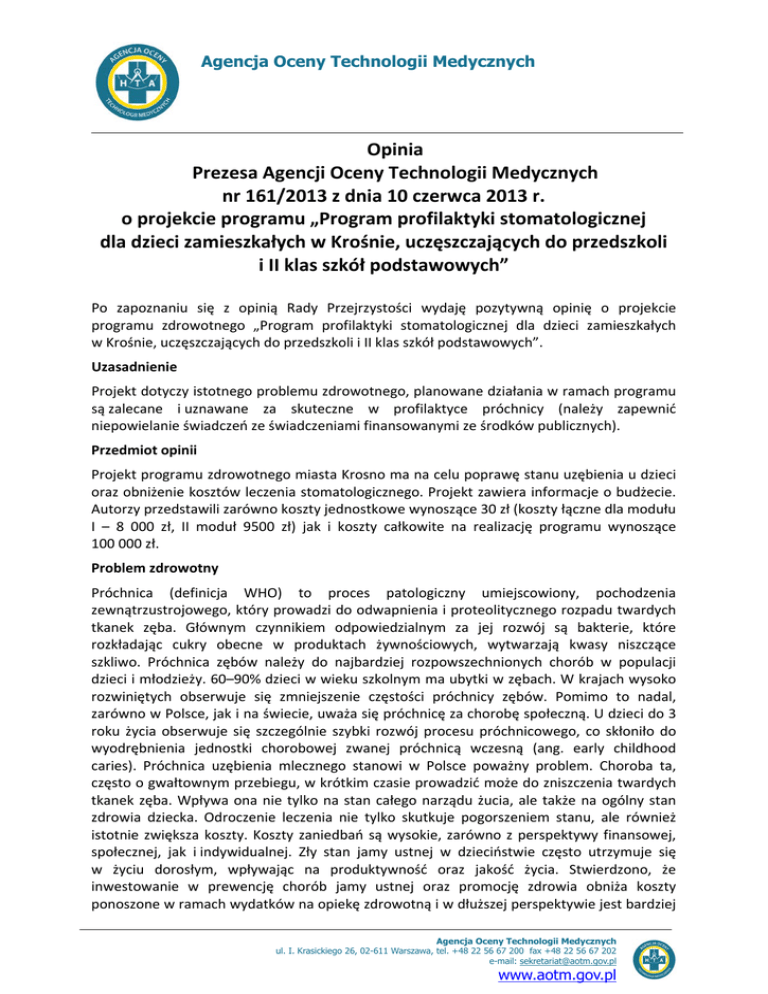 Agencja Oceny Technologii Medycznych Opinia Prezesa Agencji Oceny Technologii Medycznych nr 161/2013 z dnia 10 czerwca 2013 r. o projekcie programu „Program profilaktyki stomatologicznej dla dzieci zamieszkałych w Krośnie, uczęszczających do przedszkoli i II klas szkół podstawowych” Po zapoznaniu się z opinią Rady Przejrzystości wydaję pozytywną opinię o projekcie programu zdrowotnego „Program profilaktyki stomatologicznej dla dzieci zamieszkałych w Krośnie, uczęszczających do przedszkoli i II klas szkół podstawowych”. Uzasadnienie Projekt dotyczy istotnego problemu zdrowotnego, planowane działania w ramach programu są zalecane i uznawane za skuteczne w profilaktyce próchnicy (należy zapewnić niepowielanie świadczeń ze świadczeniami finansowanymi ze środków publicznych). Przedmiot opinii Projekt programu zdrowotnego miasta Krosno ma na celu poprawę stanu uzębienia u dzieci oraz obniżenie kosztów leczenia stomatologicznego. Projekt zawiera informacje o budżecie. Autorzy przedstawili zarówno koszty jednostkowe wynoszące 30 zł (koszty łączne dla modułu I – 8 000 zł, II moduł 9500 zł) jak i koszty całkowite na realizację programu wynoszące 100 000 zł. Problem zdrowotny Próchnica (definicja WHO) to proces patologiczny umiejscowiony, pochodzenia zewnątrzustrojowego, który prowadzi do odwapnienia i proteolitycznego rozpadu twardych tkanek zęba. Głównym czynnikiem odpowiedzialnym za jej rozwój są bakterie, które rozkładając cukry obecne w produktach żywnościowych, wytwarzają kwasy niszczące szkliwo. Próchnica zębów należy do najbardziej rozpowszechnionych chorób w populacji dzieci i młodzieży. 60–90% dzieci w wieku szkolnym ma ubytki w zębach. W krajach wysoko rozwiniętych obserwuje się zmniejszenie częstości próchnicy zębów. Pomimo to nadal, zarówno w Polsce, jak i na świecie, uważa się próchnicę za chorobę społeczną. U dzieci do 3 roku życia obserwuje się szczególnie szybki rozwój procesu próchnicowego, co skłoniło do wyodrębnienia jednostki chorobowej zwanej próchnicą wczesną (ang. early childhood caries). Próchnica uzębienia mlecznego stanowi w Polsce poważny problem. Choroba ta, często o gwałtownym przebiegu, w krótkim czasie prowadzić może do zniszczenia twardych tkanek zęba. Wpływa ona nie tylko na stan całego narządu żucia, ale także na ogólny stan zdrowia dziecka. Odroczenie leczenia nie tylko skutkuje pogorszeniem stanu, ale również istotnie zwiększa koszty. Koszty zaniedbań są wysokie, zarówno z perspektywy finansowej, społecznej, jak i indywidualnej. Zły stan jamy ustnej w dzieciństwie często utrzymuje się w życiu dorosłym, wpływając na produktywność oraz jakość życia. Stwierdzono, że inwestowanie w prewencję chorób jamy ustnej oraz promocję zdrowia obniża koszty ponoszone w ramach wydatków na opiekę zdrowotną i w dłuższej perspektywie jest bardziej Agencja Oceny Technologii Medycznych ul. I. Krasickiego 26, 02-611 Warszawa, tel. +48 22 56 67 200 fax +48 22 56 67 202 e-mail: [email protected] www.aotm.gov.pl Opinia Prezesa AOTM nr 161/2013 z dnia 10 czerwca 2013 r. kosztowo-efektywne. Zapobieganie próchnicy powinno mieć charakter kompleksowy, tzn. powinno obejmować edukację rodziców, edukację dzieci i naukę współodpowiedzialności za stan swojego zdrowia. Na podstawie analizy doświadczeń międzynarodowych WHO uznała, że najkorzystniejszym środowiskiem do wykorzystania w celu promocji zdrowia jamy ustnej jest szkoła, gdzie realizacja programów edukacji stomatologicznej przynosi najlepsze efekty i zapewnia najszerszy krąg oddziaływania. Alternatywne świadczenia Wykazy oraz warunki realizacji świadczeń gwarantowanych z zakresu leczenia stomatologicznego określa Rozporządzenie Ministra Zdrowia z dnia 30 sierpnia 2009 r. w sprawie świadczeń gwarantowanych z zakresu leczenia stomatologicznego. Świadczenia ogólnostomatologiczne dla dzieci i młodzieży do ukończenia 18. r.ż. obejmują m.in. (załącznik 2 ww. Rozporządzenia): badanie lekarskie stomatologiczne z instruktażem higieny jamy ustnej 1 raz w okresie 12 miesięcy, badanie lekarskie kontrolne 3 razy w okresie 12 miesięcy, badanie lekarza specjalisty z krótką pisemną oceną i wskazaniami diagnostyczno-terapeutycznymi dla lekarza prowadzącego, bez powiązania z innymi świadczeniami gwarantowanymi, zabezpieczenie bruzd zębów szóstych lakiem szczelinowym – 1 raz do ukończenia 7. roku życia, lakierowanie wszystkich zębów stałych nie częściej niż 1 raz na kwartał – za każdą 1/4 łuku zębowego, usunięcie złogów nazębnych nie częściej niż 1 raz na 6 miesięcy w obrębie całego uzębienia. Świadczenia stomatologiczne dla dzieci i młodzieży do ukończenia 19. r.ż. (załącznik 11 ww. Rozporządzenia) obejmują: wiek 7 lat – ocenę stanu uzębienia za pomocą wskaźnika intensywności próchnicy PUW dla zębów stałych i PUW dla zębów mlecznych, oddzielne podanie poszczególnych składowych wskaźnika PUW dla zębów stałych i wskaźnika PUW dla zębów mlecznych, wykrywanie nieprawidłowości (wad) zgryzu: wyraźnego zniekształcenia lub wyraźnego ograniczenia funkcji żucia lub gryzienia, kwalifikację do szczególnej opieki stomatologicznej, w tym profesjonalna profilaktyka fluorkowa; wiek 10 lat: – j. w.; wiek 12 i 13 lat – j. w. – dla zębów stałych. W załączniku 4 do Rozporządzenia Ministra Zdrowia z 29.08.2009 r. w sprawie świadczeń gwarantowanych z zakresu podstawowej opieki zdrowotnej, w zakresie świadczeń gwarantowanych pielęgniarki lub higienistki szkolnej udzielanych w środowisku nauczania i wychowania znajduje się „prowadzenie u uczniów szkół podstawowych (klasy I–VI) znajdujących się na obszarach gdzie poziom fluorków w wodzie pitnej nie przekracza wartości 1mg/l, grupowej profilaktyki fluorkowej metodą nadzorowanego szczotkowania zębów preparatami fluorkowymi”. Wnioski z 