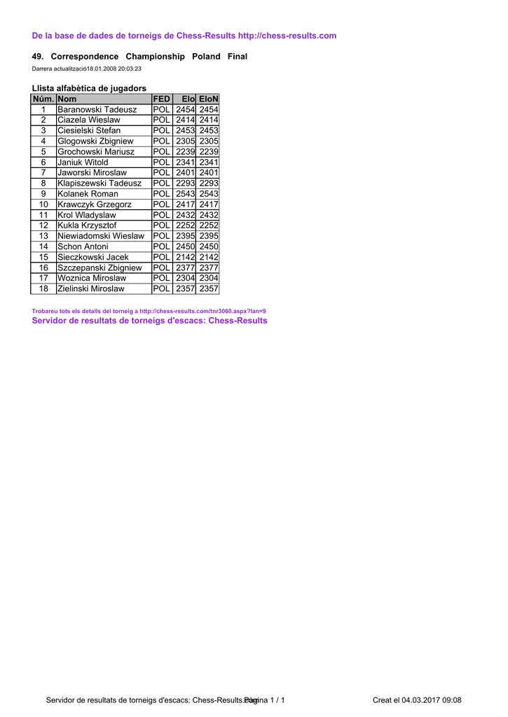 De la base de dades de torneigs de Chess-Results http://chess-results.com 49. Correspondence Championship Poland Final Darrera actualització18.01.2008 20:03:23 Llista alfabètica de jugadors Núm. Nom 1 Baranowski Tadeusz 2 Ciazela Wieslaw 3 Ciesielski Stefan 4 Glogowski Zbigniew 5 Grochowski Mariusz 6 Janiuk Witold 7 Jaworski Miroslaw 8 Klapiszewski Tadeusz 9 Kolanek Roman 10 Krawczyk Grzegorz 11 Krol Wladyslaw 12 Kukla Krzysztof 13 Niewiadomski Wieslaw 14 Schon Antoni 15 Sieczkowski Jacek 16 Szczepanski Zbigniew 17 Woznica Miroslaw 18 Zielinski Miroslaw FED POL POL POL POL POL POL POL POL POL POL POL POL POL POL POL POL POL POL Elo 2454 2414 2453 2305 2239 2341 2401 2293 2543 2417 2432 2252 2395 2450 2142 2377 2304 2357 EloN 2454 2414 2453 2305 2239 2341 2401 2293 2543 2417 2432 2252 2395 2450 2142 2377 2304 2357 Trobareu tots els detalls del torneig a http://chess-results.com/tnr3060.aspx?lan=9 Servidor de resultats de torneigs d'escacs: Chess-Results Servidor de resultats de torneigs d'escacs: Chess-Results.com Pàgina 1 / 1 Creat el 04.03.2017 09:08