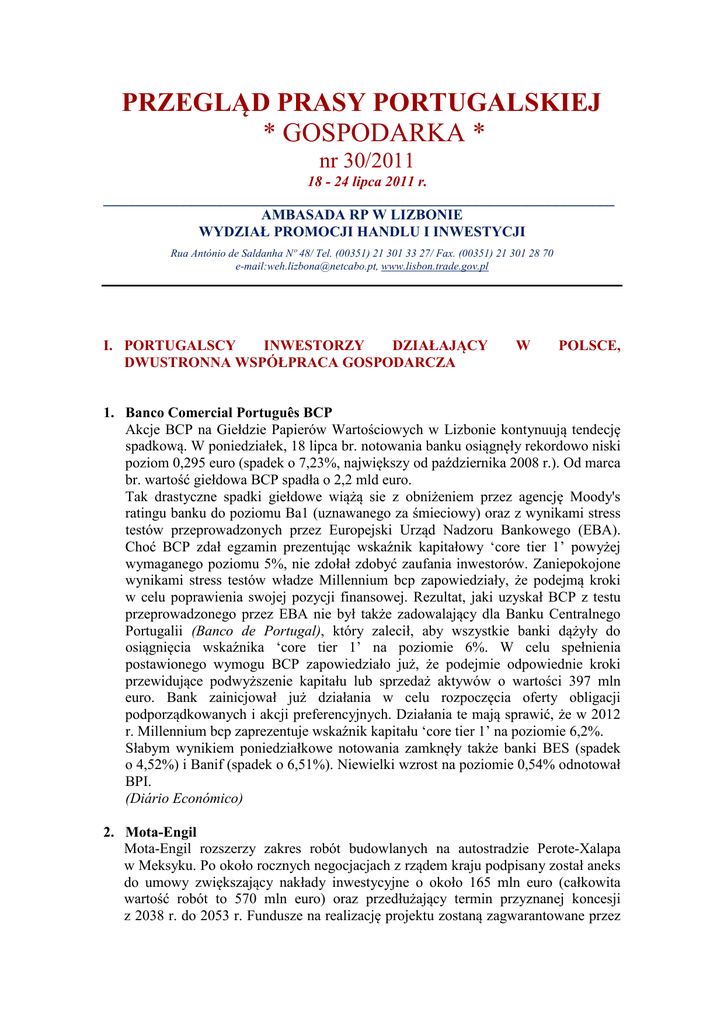 PRZEGLĄD PRASY PORTUGALSKIEJ * GOSPODARKA * nr 30/2011 18 - 24 lipca 2011 r. ______________________________________________________________________ AMBASADA RP W LIZBONIE WYDZIAŁ PROMOCJI HANDLU I INWESTYCJI Rua António de Saldanha Nº 48/ Tel. (00351) 21 301 33 27/ Fax. (00351) 21 301 28 70 e-mail:[email protected], www.lisbon.trade.gov.pl I. PORTUGALSCY INWESTORZY DZIAŁAJĄCY DWUSTRONNA WSPÓŁPRACA GOSPODARCZA W POLSCE, 1. Banco Comercial Português BCP Akcje BCP na Giełdzie Papierów Wartościowych w Lizbonie kontynuują tendecję spadkową. W poniedziałek, 18 lipca br. notowania banku osiągnęły rekordowo niski poziom 0,295 euro (spadek o 7,23%, największy od października 2008 r.). Od marca br. wartość giełdowa BCP spadła o 2,2 mld euro. Tak drastyczne spadki giełdowe wiążą sie z obniżeniem przez agencję Moody's ratingu banku do poziomu Ba1 (uznawanego za śmieciowy) oraz z wynikami stress testów przeprowadzonych przez Europejski Urząd Nadzoru Bankowego (EBA). Choć BCP zdał egzamin prezentując wskaźnik kapitałowy ‘core tier 1’ powyżej wymaganego poziomu 5%, nie zdołał zdobyć zaufania inwestorów. Zaniepokojone wynikami stress testów władze Millennium bcp zapowiedziały, że podejmą kroki w celu poprawienia swojej pozycji finansowej. Rezultat, jaki uzyskał BCP z testu przeprowadzonego przez EBA nie był także zadowalający dla Banku Centralnego Portugalii (Banco de Portugal), który zalecił, aby wszystkie banki dążyły do osiągnięcia wskaźnika ‘core tier 1’ na poziomie 6%. W celu spełnienia postawionego wymogu BCP zapowiedziało już, że podejmie odpowiednie kroki przewidujące podwyższenie kapitału lub sprzedaż aktywów o wartości 397 mln euro. Bank zainicjował już działania w celu rozpoczęcia oferty obligacji podporządkowanych i akcji preferencyjnych. Działania te mają sprawić, że w 2012 r. Millennium bcp zaprezentuje wskaźnik kapitału ‘core tier 1’ na poziomie 6,2%. Słabym wynikiem poniedziałkowe notowania zamknęły także banki BES (spadek o 4,52%) i Banif (spadek o 6,51%). Niewielki wzrost na poziomie 0,54% odnotował BPI. (Diário Económico) 2. Mota-Engil Mota-Engil rozszerzy zakres robót budowlanych na autostradzie Perote-Xalapa w Meksyku. Po około rocznych negocjacjach z rządem kraju podpisany został aneks do umowy zwiększający nakłady inwestycyjne o około 165 mln euro (całkowita wartość robót to 570 mln euro) oraz przedłużający termin przyznanej koncesji z 2038 r. do 2053 r. Fundusze na realizację projektu zostaną zagwarantowane przez PRZEGLĄD PRASY PORTUGALSKIEJ - GOSPODARKA nr 30/2011 meksykański Narodowy Fundusz Infrastrukturalny (FONADIM). Projekt w Meksyku będzie realizowany w konsorcjum z hiszpańską grupą Isolux/Corsán. Przyznana koncesja obejmuje budowę, finansowanie, zarządzanie i utrzymanie odcinka 59 km autostrady. Wartość portfela projektów Mota-Engil na rynkach obu Ameryk (Meksyk, Peru, Brazylia, Kolumbia) opiewa na 316 mln euro. Spółka podkreśla znaczący potencjał regionu Ameryki Łacińskiej dla rozwoju swojej działalności i deklaruje, że w obecnych działaniach skoncentruje się na konsolidacji operacji w regionie a nie rozszerzaniu obecności na nowe rynki. (Diário Económico, Jornal de Negócios) 2 II. INNE INWESTYCJE PORTUGALSKICH I KONTRAKTY ZAGRANICZNE FIRM 1. Sonae Sonae Sierra, firma z grupy Sonae kontrolująca i zarządzająca centrami handlowymi w sześciu europejskich krajach i w Brazylii, zamierza sprzedać swoje udziały w galerii handlowej Via Catarina w Porto. Wartość udziałów szacowana jest na ok. 12,5 mln euro. Sprzedaż udziałów w Via Catarina wpisuje się w strategię firmy przewidującą sprzedaż gotowych projektów w celu pozyskania środków na nowe inwestycje typu greenfield na rynkach międzynarodowych. W br. Sonae Sierra sprzedała już dwie galerie handlowe w Hiszpanii o łącznej wartości 120 mln euro. Sonae zarządza obecnie 26 centrami handlowymi. Dodatkowo w budowie jest kolejnych sześć (we Włoszech, Niemczech, Rumunii i Brazylii) o łącznej wartości 318,8 mln euro. Jednocześnie pięć inwestycji (w Portugalii, Niemczech, Rumunii i Grecji) zostało zawieszonych, m.in. w związku z niekorzystną sytuację gospodarczą na niektórych rynkach. (Diário Económico) 2. Secil Lobito Projekt budowy fabryki cementu w Angoli ogłoszony w 2008 r. przez portugalską firmę produkującą cement - Secil Lobito, wciąż pozostaje w zawieszeniu. Prezesa Secil, Pedro Queiroz Pereira, przyznał, że obecnie trwa impas w odblokowaniu środków na inwestycję przez wspólnika portugalskiej firmy – spółkę Encime, kontrolowaną przez rząd Angoli. W 2008 r. wartość inwestycji była szacowana na 95 mln euro, Innym czynnikiem hamującym postępy inwestycji może być spór w zarządzie spółki pomiędzy prezesem Pedro Queiroz Pereirą a irlandzką grupą CRH (Cement Roadstone Holdings), która posiada 49% udziałów firmy. Z powodu istniejących różnic dotyczących strategii internacjonalizacji przedsiębiorstwa, jest prawie pewne, że CRH sprzeda swoje udziały, jak tylko ich cena zostanie ustalona przez sąd. Poza Portugalią i Angolą Secil Lobito działa w Tunezji, Libanie i Rep. Zielonego Przylądka. (Diário Económico) 3. Visabeira Angolańska spółka TVCABO, kontrolowana przez spółki Visabeira i Angola Telecom, zamierza wprowadzić w Luandzie szerokopasmowe usługi teleinformatyczne używając technologii FTTH - ”Fiber To The Home”. Dzięki tej PRZEGLĄD PRASY PORTUGALSKIEJ - GOSPODARKA nr 30/2011 operacji będzie w stanie dostarczać usługi nowej generacji, tj. telewizję wysokiej rozdzielczości (HD) czy interaktywne aplikacje. Wartość inwestycji jest szacowana na 3,2 mln euro. Projekt jest kolejnym krokiem w strategii wzrostu i rozwoju grupy oraz wprowadzania nowych technologii w Angoli. (Diário Económico, Oje) 4. Grupa Casais Casais, portugalska firma z Bragi zajmująca się inżynierią i budown