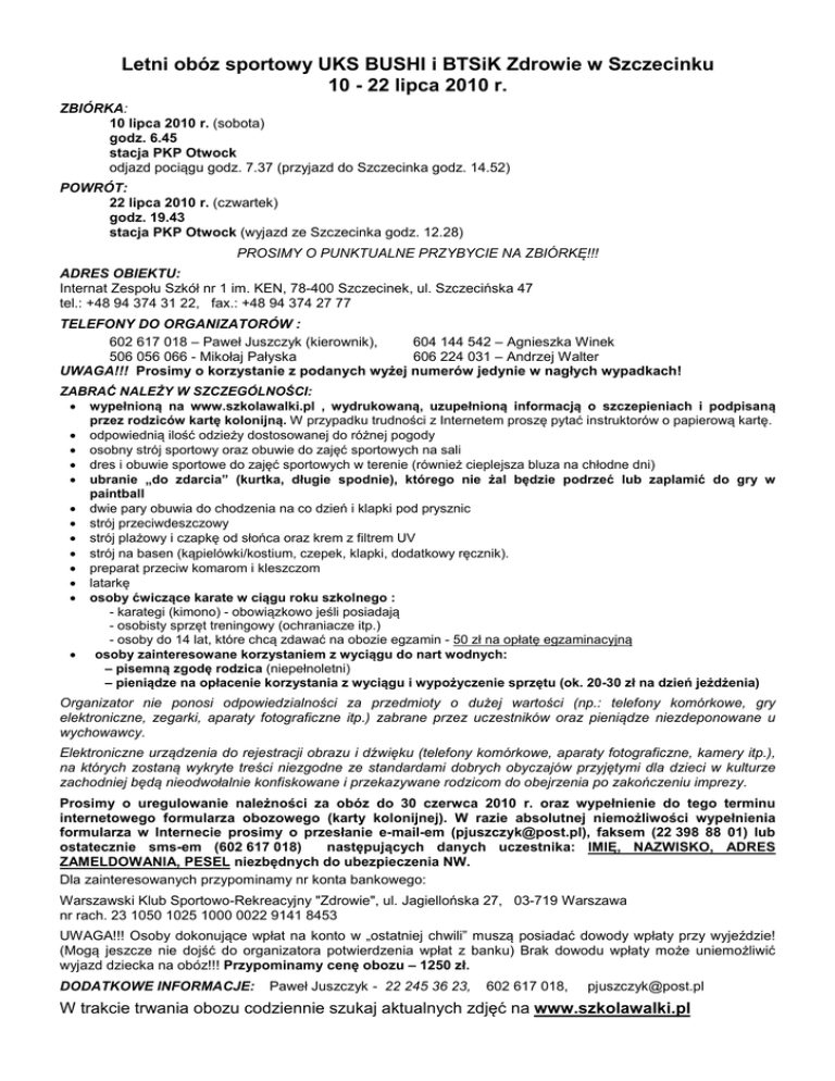Letni obóz sportowy UKS BUSHI i BTSiK Zdrowie w Szczecinku 10 - 22 lipca 2010 r. ZBIÓRKA: 10 lipca 2010 r. (sobota) godz. 6.45 stacja PKP Otwock odjazd pociągu godz. 7.37 (przyjazd do Szczecinka godz. 14.52) POWRÓT: 22 lipca 2010 r. (czwartek) godz. 19.43 stacja PKP Otwock (wyjazd ze Szczecinka godz. 12.28) PROSIMY O PUNKTUALNE PRZYBYCIE NA ZBIÓRKĘ!!! ADRES OBIEKTU: Internat Zespołu Szkół nr 1 im. KEN, 78-400 Szczecinek, ul. Szczecińska 47 tel.: +48 94 374 31 22, fax.: +48 94 374 27 77 TELEFONY DO ORGANIZATORÓW : 602 617 018 – Paweł Juszczyk (kierownik), 604 144 542 – Agnieszka Winek 506 056 066 - Mikołaj Pałyska 606 224 031 – Andrzej Walter UWAGA!!! Prosimy o korzystanie z podanych wyżej numerów jedynie w nagłych wypadkach! ZABRAĆ NALEŻY W SZCZEGÓLNOŚCI: • wypełnioną na www.szkolawalki.pl , wydrukowaną, uzupełnioną informacją o szczepieniach i podpisaną przez rodziców kartę kolonijną. W przypadku trudności z Internetem proszę pytać instruktorów o papierową kartę. • odpowiednią ilość odzieży dostosowanej do różnej pogody • osobny strój sportowy oraz obuwie do zajęć sportowych na sali • dres i obuwie sportowe do zajęć sportowych w terenie (również cieplejsza bluza na chłodne dni) • ubranie „do zdarcia” (kurtka, długie spodnie), którego nie żal będzie podrzeć lub zaplamić do gry w paintball • dwie pary obuwia do chodzenia na co dzień i klapki pod prysznic • strój przeciwdeszczowy • strój plażowy i czapkę od słońca oraz krem z filtrem UV • strój na basen (kąpielówki/kostium, czepek, klapki, dodatkowy ręcznik). • preparat przeciw komarom i kleszczom • latarkę • osoby ćwiczące karate w ciągu roku szkolnego : - karategi (kimono) - obowiązkowo jeśli posiadają - osobisty sprzęt treningowy (ochraniacze itp.) - osoby do 14 lat, które chcą zdawać na obozie egzamin - 50 zł na opłatę egzaminacyjną • osoby zainteresowane korzystaniem z wyciągu do nart wodnych: – pisemną zgodę rodzica (niepełnoletni) – pieniądze na opłacenie korzystania z wyciągu i wypożyczenie sprzętu (ok. 20-30 zł na dzień jeżdżenia) Organizator nie ponosi odpowiedzialności za przedmioty o dużej wartości (np.: telefony komórkowe, gry elektroniczne, zegarki, aparaty fotograficzne itp.) zabrane przez uczestników oraz pieniądze niezdeponowane u wychowawcy. Elektroniczne urządzenia do rejestracji obrazu i dźwięku (telefony komórkowe, aparaty fotograficzne, kamery itp.), na których zostaną wykryte treści niezgodne ze standardami dobrych obyczajów przyjętymi dla dzieci w kulturze zachodniej będą nieodwołalnie konfiskowane i przekazywane rodzicom do obejrzenia po zakończeniu imprezy. Prosimy o uregulowanie należności za obóz do 30 czerwca 2010 r. oraz wypełnienie do tego terminu internetowego formularza obozowego (karty kolonijnej). W razie absolutnej niemożliwości wypełnienia formularza w Internecie prosimy o przesłanie e-mail-em ([email protected]), faksem (22 398 88 01) lub ostatecznie sms-em (602 617 018) następujących danych uczestnika: IMIĘ, NAZWISKO, ADRES ZAMELDOWANIA, PESEL niezbędnych do ubezpieczenia NW. Dla zainteresowanych przypominamy nr konta bankowego: Warszawski Klub Sportowo-Rekreacyjny "Zdrowie", ul. Jagiellońska 27, 03-719 Warszawa nr rach. 23 1050 1025 1000 0022 9141 8453 UWAGA!!! Osoby dokonujące wpłat na konto w „ostatniej chwili” muszą posiadać dowody wpłaty przy wyjeździe! (Mogą jeszcze nie dojść do organizatora potwierdzenia wpłat z banku) Brak dowodu wpłaty może uniemożliwić wyjazd dziecka na obóz!!! Przypominamy cenę obozu – 1250 zł. DODATKOWE INFORMACJE: Paweł Juszczyk - 22 245 36 23, 602 617 018, [email protected] W trakcie trwania obozu codziennie szukaj aktualnych zdjęć na www.szkolawalki.pl