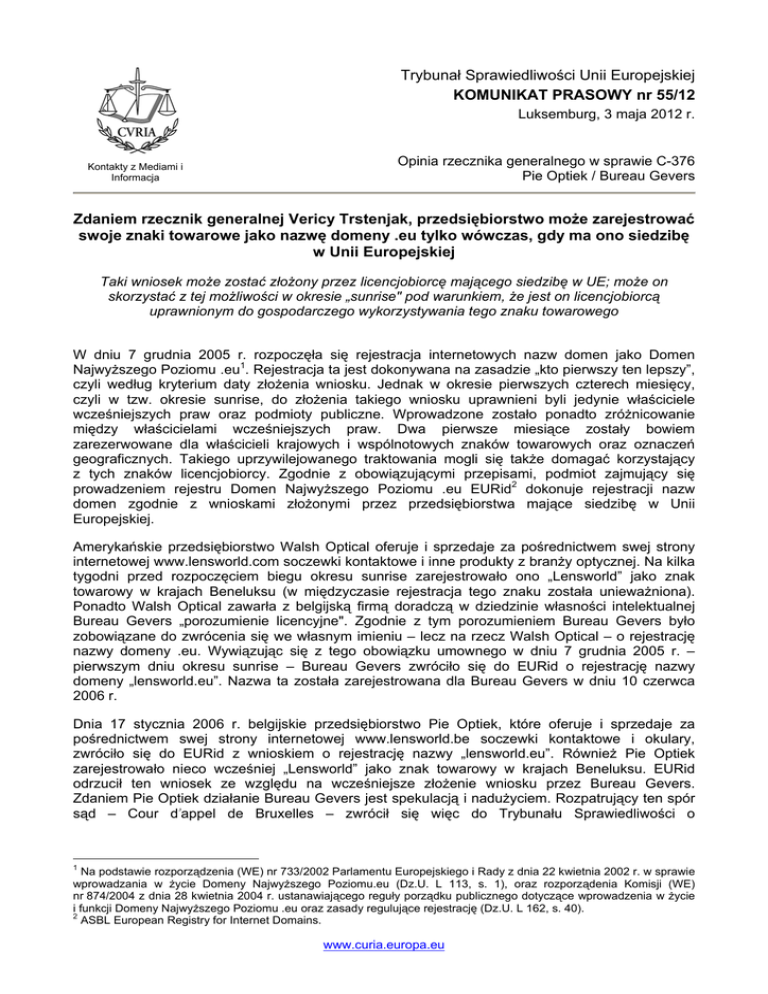 Trybunał Sprawiedliwości Unii Europejskiej KOMUNIKAT PRASOWY nr 55/12 Luksemburg, 3 maja 2012 r. Kontakty z Mediami i Informacja Opinia rzecznika generalnego w sprawie C-376 Pie Optiek / Bureau Gevers Zdaniem rzecznik generalnej Vericy Trstenjak, przedsiębiorstwo może zarejestrować swoje znaki towarowe jako nazwę domeny .eu tylko wówczas, gdy ma ono siedzibę w Unii Europejskiej Taki wniosek może zostać złożony przez licencjobiorcę mającego siedzibę w UE; może on skorzystać z tej możliwości w okresie „sunrise" pod warunkiem, że jest on licencjobiorcą uprawnionym do gospodarczego wykorzystywania tego znaku towarowego W dniu 7 grudnia 2005 r. rozpoczęła się rejestracja internetowych nazw domen jako Domen Najwyższego Poziomu .eu1. Rejestracja ta jest dokonywana na zasadzie „kto pierwszy ten lepszy”, czyli według kryterium daty złożenia wniosku. Jednak w okresie pierwszych czterech miesięcy, czyli w tzw. okresie sunrise, do złożenia takiego wniosku uprawnieni byli jedynie właściciele wcześniejszych praw oraz podmioty publiczne. Wprowadzone zostało ponadto zróżnicowanie między właścicielami wcześniejszych praw. Dwa pierwsze miesiące zostały bowiem zarezerwowane dla właścicieli krajowych i wspólnotowych znaków towarowych oraz oznaczeń geograficznych. Takiego uprzywilejowanego traktowania mogli się także domagać korzystający z tych znaków licencjobiorcy. Zgodnie z obowiązującymi przepisami, podmiot zajmujący się prowadzeniem rejestru Domen Najwyższego Poziomu .eu EURid2 dokonuje rejestracji nazw domen zgodnie z wnioskami złożonymi przez przedsiębiorstwa mające siedzibę w Unii Europejskiej. Amerykańskie przedsiębiorstwo Walsh Optical oferuje i sprzedaje za pośrednictwem swej strony internetowej www.lensworld.com soczewki kontaktowe i inne produkty z branży optycznej. Na kilka tygodni przed rozpoczęciem biegu okresu sunrise zarejestrowało ono „Lensworld” jako znak towarowy w krajach Beneluksu (w międzyczasie rejestracja tego znaku została unieważniona). Ponadto Walsh Optical zawarła z belgijską firmą doradczą w dziedzinie własności intelektualnej Bureau Gevers „porozumienie licencyjne". Zgodnie z tym porozumieniem Bureau Gevers było zobowiązane do zwrócenia się we własnym imieniu – lecz na rzecz Walsh Optical – o rejestrację nazwy domeny .eu. Wywiązując się z tego obowiązku umownego w dniu 7 grudnia 2005 r. – pierwszym dniu okresu sunrise – Bureau Gevers zwróciło się do EURid o rejestrację nazwy domeny „lensworld.eu”. Nazwa ta została zarejestrowana dla Bureau Gevers w dniu 10 czerwca 2006 r. Dnia 17 stycznia 2006 r. belgijskie przedsiębiorstwo Pie Optiek, które oferuje i sprzedaje za pośrednictwem swej strony internetowej www.lensworld.be soczewki kontaktowe i okulary, zwróciło się do EURid z wnioskiem o rejestrację nazwy „lensworld.eu”. Również Pie Optiek zarejestrowało nieco wcześniej „Lensworld” jako znak towarowy w krajach Beneluksu. EURid odrzucił ten wniosek ze względu na wcześniejsze złożenie wniosku przez Bureau Gevers. Zdaniem Pie Optiek działanie Bureau Gevers jest spekulacją i nadużyciem. Rozpatrujący ten spór sąd – Cour dۥappel de Bruxelles – zwrócił się więc do Trybunału Sprawiedliwości o 1 Na podstawie rozporządzenia (WE) nr 733/2002 Parlamentu Europejskiego i Rady z dnia 22 kwietnia 2002 r. w sprawie wprowadzania w życie Domeny Najwyższego Poziomu.eu (Dz.U. L 113, s. 1), oraz rozporządenia Komisji (WE) nr 874/2004 z dnia 28 kwietnia 2004 r. ustanawiającego reguły porządku publicznego dotyczące wprowadzenia w życie i funkcji Domeny Najwyższego Poziomu .eu oraz zasady regulujące rejestrację (Dz.U. L 162, s. 40). 2 ASBL European Registry for Internet Domains. www.curia.europa.eu uszczegółowienie znaczenia pojęcia w początkowej fazie okresu sunrise. licencjobiorcy uprawnionego do złożenia wniosku W przedłożonej dzisiaj opinii rzecznik generalna Verica Trstenjak stanęła na stanowisku, że porozumienie zawarte przez Walsh Optical i Bureau Gevers, pomimo tego, że zostało ono określone przez jego strony jako „porozumienie licencyjne", nie jest umową licencyjną, lecz umową o świadczenie usług. Bureau Gevers było bowiem zobowiązane, w zamian za świadczenie wzajemne, do zwrócenia się o dokonanie rejestracji nazwy domeny „lensworld.eu" – choć we własnym imieniu – lecz wyłącznie na rzecz Walsh Optical. Zobowiązało się jedynie do świadczenia usługi. Porozumieniu temu brak jest zatem najważniejszych cech charakterystycznych umowy licencyjnej, czyli prawa licencjobiorcy do gospodarczego wykorzystywania znaku towarowego (w niniejszym przypadku „Lensworld") i możliwości powołania się na ten znak wobec podmiotów trzecich. Nie można zatem uznać, że Bureau Gevers było w okresie sunrise uprawnionym do skorzystania z tego okresu licencjobiorcą. Rzecznik generalna V. Trstenjak podkreśliła następnie, że zamierzoną intencją prawodawcy unijnego było to, iż o dokonanie rejestracji nazwy domeny .eu mogą zwracać się tylko przedsiębiorstwa i organizacje, które mają siedzibę na terenie Unii. Domeny Najwyższego Poziomu .eu służą bowiem do tego, aby stworzyć jednoznacznie rozpoznawalny związek z Unią Europejską, kojarzonymi z nią ramami prawnymi i europejskim rynkiem. Umożliwienie mającym siedzibę w Unii przedsiębiorstwom i organizacjom oraz zamieszkałym na jej terytorium osobom fizycznym rejestracji w specjalnej domenie ma na celu urzeczywistnienie tego związku z Unią. Biorąc pod uwagę te zasady nie można umożliwić przedsiębiorstwu, które ma siedzibę poza Unią, obchodzenia przepisów dotyczących uprawnienia do złożenia wniosku i uzyskania rejestracji nazwy domeny .eu poprzez wykorzystanie konstrukcji prawnej polegającej na zleceniu uzyskania tej rejestracji innemu, mającemu siedzibę na terenie Unii, podmiotowi uprawnionemu do złożenia takiego wnios