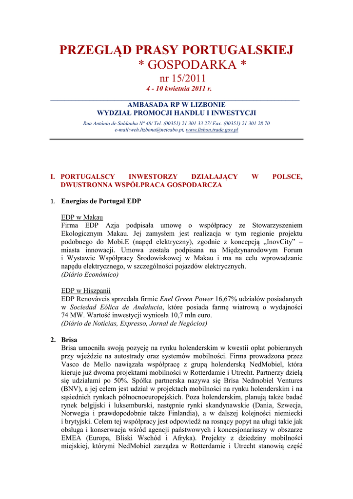 PRZEGLĄD PRASY PORTUGALSKIEJ * GOSPODARKA * nr 15/2011 4 - 10 kwietnia 2011 r. ______________________________________________________________________ AMBASADA RP W LIZBONIE WYDZIAŁ PROMOCJI HANDLU I INWESTYCJI Rua António de Saldanha Nº 48/ Tel. (00351) 21 301 33 27/ Fax. (00351) 21 301 28 70 e-mail:[email protected], www.lisbon.trade.gov.pl I. PORTUGALSCY INWESTORZY DZIAŁAJĄCY DWUSTRONNA WSPÓŁPRACA GOSPODARCZA W POLSCE, 1. Energias de Portugal EDP EDP w Makau Firma EDP Azja podpisała umowę o współpracy ze Stowarzyszeniem Ekologicznym Makau. Jej zamysłem jest realizacja w tym regionie projektu podobnego do Mobi.E (napęd elektryczny), zgodnie z koncepcją „InovCity” – miasta innowacji. Umowa została podpisana na Międzynarodowym Forum i Wystawie Współpracy Środowiskowej w Makau i ma na celu wprowadzanie napędu elektrycznego, w szczególności pojazdów elektrycznych. (Diário Económico) EDP w Hiszpanii EDP Renováveis sprzedała firmie Enel Green Power 16,67% udziałów posiadanych w Sociedad Eólica de Andalucia, które posiada farmę wiatrową o wydajności 74 MW. Wartość inwestycji wyniosła 10,7 mln euro. (Diário de Notícias, Expresso, Jornal de Negócios) 2. Brisa Brisa umocniła swoją pozycję na rynku holenderskim w kwestii opłat pobieranych przy wjeździe na autostrady oraz systemów mobilności. Firma prowadzona przez Vasco de Mello nawiązała współpracę z grupą holenderską NedMobiel, która kieruje już dwoma projektami mobilności w Rotterdamie i Utrecht. Partnerzy dzielą się udziałami po 50%. Spółka partnerska nazywa się Brisa Nedmobiel Ventures (BNV), a jej celem jest udział w projektach mobilności na rynku holenderskim i na sąsiednich rynkach północnoeuropejskich. Poza holenderskim, planują także badać rynek belgijski i luksemburski, następnie rynki skandynawskie (Dania, Szwecja, Norwegia i prawdopodobnie także Finlandia), a w dalszej kolejności niemiecki i brytyjski. Celem tej współpracy jest odpowiedź na rosnący popyt na uługi takie jak obsługa i konserwacja wśród agencji państwowych i koncesjonariuszy w obszarze EMEA (Europa, Bliski Wschód i Afryka). Projekty z dziedziny mobilności miejskiej, którymi NedMobiel zarządza w Rotterdamie i Utrecht stanowią część PRZEGLĄD PRASY PORTUGALSKIEJ - GOSPODARKA nr 15/2011 polityki wdrażania innowacyjnych koncepcji, takich jak unikanie godzin szczytu, wprowadzanie opłat drogowych i budżetowania mobilności. Jako członek spółki partnerskiej BNV, Brisa weszła także na rynek turecki i będzie zarządzać obsługą i konserwacją projektu 400 km autostrady łączącej miasta Gebze i Izmir. 6 kwietnia br. Brisa zaczęła ponownie wykupywać swoje akcje. Obecnie jest w posiadaniu 28,7 mln własnych akcji, co odpowiada 4,8% kapitału firmy. (Diário Económico, Diário de Notícias) 3. Banco Comercial Português BCP Agencje ratingowe Moody's oraz Fitch obniżyły rating BCP na BBB- (Fitch) i Baa3 (Moody’s), czyli w obu przypadkach jeden poziom powyżej kategorii „junk”. Obok BCP w ratingu spadło też sześć innych banków portugalskich: Montepio, Caixa Geral de Depósitos, Banco Espírito Santo, BPI, Santander Totta i BPN. (Diário Económico, Jornal de Negócios) 4. Mota-Engil W związku z niepewną sytuacją finansową zarówno sektora prywatnego, jak i publicznego w Portugalii oraz planami znaczących przedsięwzięć infrastrukturalnych, najważniejsze firmy budowlane Portugalii, w tym Mota-Engil, poszukują możliwości inwestycji za granicą. Już w 2010 r. inwestycje na rynkach zagranicznych stanowiły od 40% (w przypadku Somague) do 58% (Mota-Engil) obrotów tych przedsiębiorstw. (Diário Económico) Mota-Engil w Mozambiku Jak przewiduje Jorge Coelho, dyrektor generalny Mota-Engil, firma ma zamiar rozszerzyć swoją działalność w tym roku w Mozambiku o 159%. Sytuacja na rynku mozambikańskim w roku 2010 była nadspodziewanie dobra i przewiduje się, że wielkość obrotów powinna przekroczyć 150 mln euro. (Diário de Notícias) Mota-Engil w Angoli Mota-Engil Angola rozpocznie realizację dwóch nowych projektów budowlanych w Angoli, o wartości 100 mln euro. Firma zamierza utrzymać wzrost działalności na rynku angolańskim, gdzie obency portfel firmy wynosi około 570 mln euro. Projekty, którymi firma aktualnie będzie się zajmować to budowa Centrum Szkolenia Morskiego w Angoli, w Sumbe, stolicy prowincji Kwanza Sul, o wartości 62 mln euro, która ma zostać ukończona w czerwcu 2012 r., oraz urbanizacji Cabaia w Lobito, w którą zainwestowane zostanie 38 mln euro. (Expresso, Diário Económico, Jornal de Negócios) 2 PRZEGLĄD PRASY PORTUGALSKIEJ - GOSPODARKA nr 15/2011 II. INNE INWESTYCJE PORTUGALSKICH I KONTRAKTY ZAGRANICZNE FIRM 1. Galp Galp w Angoli Firma Galp przewiduje, że w ciągu sześciu lat podwoi produkcję baryłek ropy naftowej w Angoli. Jak twierdzi dyrektor generalny firmy w Angoli, jeżeli wszystkie projekty uda się zrealizować na czas, w latach 2017-2018 Galp będzie produkował 40 tys., a do roku 2020 - 200 tys. baryłek dziennie. (Diário de Notícias, Diário Económico) Galp w Brazylii Galp rozpoczął w tym tygodniu produkcję pierwszych baryłek oleju napędowego ze źródeł w Natal (Brazylia). Obecnie możliwa jest produkcja 400 baryłek dziennie. Celem jest produkcja 200 tys. baryłek dziennie w 2020 r., firma wierzy jednak, że na początku następnej dekady możliwa będzie produkcja 300 tys. baryłek dziennie, co pozwoli firmie na zaopatrzenie rafinerii posiadanych w Sines i Matosinhos. Petrobas uzyskał potwierdzenie istnienia ropy w szybie Lula, który znajduje się w Bacia de Santos. Galp posiada 10 % udziałów w konsorcjum które bada to pole, reszta należy do Petrobas (65%) i BG (25%). Przewiduje się, że jest to drugie największe źródło ropy w Brazylii, z którego będzie można wydobyć nawet 6,5 mld baryłek. W połowie marca br. Galp ogłosił, że przewidzwane inwestycje firmy w 2011