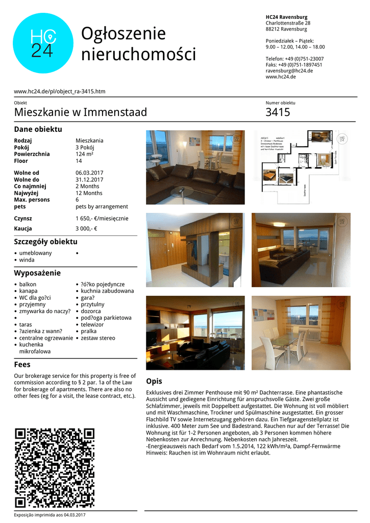 Ogłoszenie nieruchomości HC24 Ravensburg Charlottenstraße 28 88212 Ravensburg Poniedziałek – Piątek: 9.00 – 12.00, 14.00 – 18.00 Telefon: +49 (0)751-23007 Faks: +49 (0)751-1897451 [email protected] www.hc24.de www.hc24.de/pl/object_ra-3415.htm Obiekt Numer obiektu Mieszkanie w Immenstaad 3415 Dane obiektu Rodzaj Pokój Powierzchnia Floor Mieszkania 3 Pokój 124 m² 14 Wolne od Wolne do Co najmniej Najwyżej Max. persons pets 06.03.2017 31.12.2017 2 Months 12 Months 6 pets by arrangement Czynsz 1 650,- €/miesięcznie Kaucja 3 000,- € Szczegóły obiektu umeblowany winda Wyposażenie balkon kanapa WC dla go?ci przyjemny zmywarka do naczy? taras ?azienka z wann? centralne ogrzewanie kuchenka mikrofalowa ?ó?ko pojedyncze kuchnia zabudowana gara? przytulny dozorca pod?oga parkietowa telewizor pralka zestaw stereo Fees Our brokerage service for this property is free of commission according to § 2 par. 1a of the Law for brokerage of apartments. There are also no other fees (eg for a visit, the lease contract, etc.). Exposição imprimida aos 04.03.2017 Powered by TCPDF (www.tcpdf.org) Opis Exklusives drei Zimmer Penthouse mit 90 m² Dachterrasse. Eine phantastische Aussicht und gediegene Einrichtung für anspruchsvolle Gäste. Zwei große Schlafzimmer, jeweils mit Doppelbett aufgestattet. Die Wohnung ist voll möbliert und mit Waschmaschine, Trockner und Spülmaschine ausgestattet. Ein grosser Flachbild TV sowie Internetzugang gehören dazu. Ein Tiefgaragenstellplatz ist inklusive. 400 Meter zum See und Badestrand. Rauchen nur auf der Terrasse! Die Wohnung ist für 1-2 Personen angeboten, ab 3 Personen kommen höhere Nebenkosten zur Anrechnung. Nebenkosten nach Jahreszeit. -Energieausweis nach Bedarf vom 1.5.2014, 122 kWh/m²a, Dampf-Fernwärme Hinweis: Rauchen ist im Wohnraum nicht erlaubt.