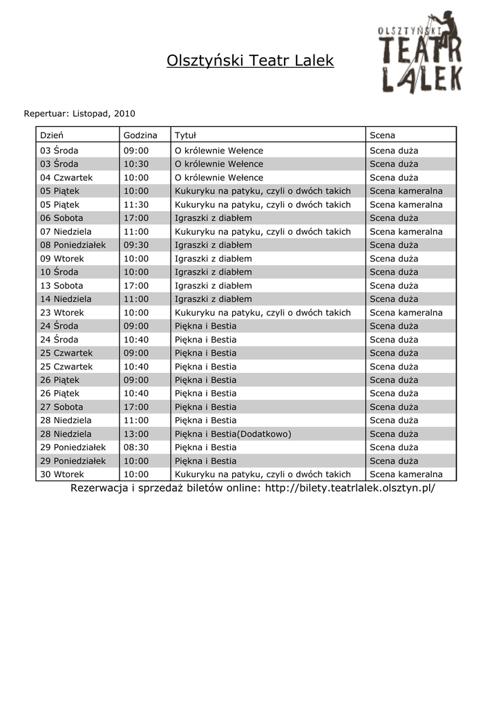 Olsztyński Teatr Lalek Repertuar: Listopad, 2010 Dzień Godzina Tytuł Scena 03 Środa 09:00 O królewnie Wełence Scena duża 03 Środa 10:30 O królewnie Wełence Scena duża 04 Czwartek 10:00 O królewnie Wełence Scena duża 05 Piątek 10:00 Kukuryku na patyku, czyli o dwóch takich Scena kameralna 05 Piątek 11:30 Kukuryku na patyku, czyli o dwóch takich Scena kameralna 06 Sobota 17:00 Igraszki z diabłem Scena duża 07 Niedziela 11:00 Kukuryku na patyku, czyli o dwóch takich Scena kameralna 08 Poniedziałek 09:30 Igraszki z diabłem Scena duża 09 Wtorek 10:00 Igraszki z diabłem Scena duża 10 Środa 10:00 Igraszki z diabłem Scena duża 13 Sobota 17:00 Igraszki z diabłem Scena duża 14 Niedziela 11:00 Igraszki z diabłem Scena duża 23 Wtorek 10:00 Kukuryku na patyku, czyli o dwóch takich Scena kameralna 24 Środa 09:00 Piękna i Bestia Scena duża 24 Środa 10:40 Piękna i Bestia Scena duża 25 Czwartek 09:00 Piękna i Bestia Scena duża 25 Czwartek 10:40 Piękna i Bestia Scena duża 26 Piątek 09:00 Piękna i Bestia Scena duża 26 Piątek 10:40 Piękna i Bestia Scena duża 27 Sobota 17:00 Piękna i Bestia Scena duża 28 Niedziela 11:00 Piękna i Bestia Scena duża 28 Niedziela 13:00 Piękna i Bestia(Dodatkowo) Scena duża 29 Poniedziałek 08:30 Piękna i Bestia Scena duża 29 Poniedziałek 10:00 Piękna i Bestia Scena duża 30 Wtorek 10:00 Kukuryku na patyku, czyli o dwóch takich Scena kameralna Rezerwacja i sprzedaż biletów online: http://bilety.teatrlalek.olsztyn.pl/