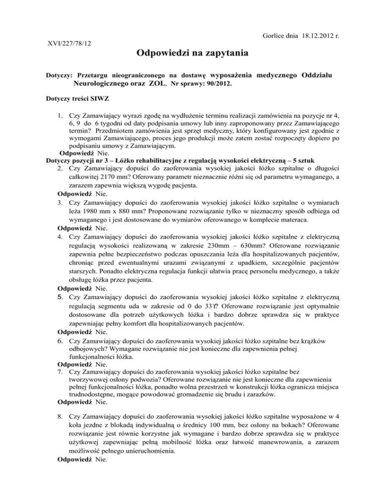 Gorlice dnia 18.12.2012 r. XVI/227/78/12 Odpowiedzi na zapytania Dotyczy: Przetargu nieograniczonego na dostawę wyposażenia medycznego Oddziału Neurologicznego oraz ZOL, Nr sprawy: 90/2012. Dotyczy treści SIWZ 1. Czy Zamawiający wyrazi zgodę na wydłużenie terminu realizacji zamówienia na pozycje nr 4, 6, 9 do 6 tygodni od daty podpisania umowy lub inny zaproponowany przez Zamawiającego termin? Przedmiotem zamówienia jest sprzęt medyczny, który konfigurowany jest zgodnie z wymogami Zamawiającego, proces jego produkcji może zatem zostać rozpoczęty dopiero po podpisaniu umowy z Zamawiającym. Odpowiedź Nie. Dotyczy pozycji nr 3 – Łóżko rehabilitacyjne z regulacją wysokości elektryczną – 5 sztuk 2. Czy Zamawiający dopuści do zaoferowania wysokiej jakości łóżko szpitalne o długości całkowitej 2170 mm? Oferowany parametr nieznacznie różni się od parametru wymaganego, a zarazem zapewnia większą wygodę pacjenta. Odpowiedź Nie. 3. Czy Zamawiający dopuści do zaoferowania wysokiej jakości łóżko szpitalne o wymiarach leża 1980 mm x 880 mm? Proponowane rozwiązanie tylko w nieznaczny sposób odbiega od wymaganego i jest dostosowane do wymiarów oferowanego w komplecie materaca. Odpowiedź Nie. 4. Czy Zamawiający dopuści do zaoferowania wysokiej jakości łóżko szpitalne z elektryczną regulacją wysokości realizowaną w zakresie 230mm – 630mm? Oferowane rozwiązanie zapewnia pełne bezpieczeństwo podczas opuszczania leża dla hospitalizowanych pacjentów, chroniąc przed ewentualnymi urazami związanymi z upadkiem, szczególnie pacjentów starszych. Ponadto elektryczna regulacja funkcji ułatwia pracę personelu medycznego, a także obsługę łóżka przez pacjenta. Odpowiedź Nie. 5. Czy Zamawiający dopuści do zaoferowania wysokiej jakości łóżko szpitalne z elektryczną regulacją segmentu uda w zakresie od 0 do 33°? Oferowane rozwiązanie jest optymalnie dostosowane dla potrzeb użytkowych łóżka i bardzo dobrze sprawdza się w praktyce zapewniając pełny komfort dla hospitalizowanych pacjentów. Odpowiedź Nie. 6. Czy Zamawiający dopuści do zaoferowania wysokiej jakości łóżko szpitalne bez krążków odbojowych? Wymagane rozwiązanie nie jest konieczne dla zapewnienia pełnej funkcjonalności łóżka. Odpowiedź Nie. 7. Czy Zamawiający dopuści do zaoferowania wysokiej jakości łóżko szpitalne bez tworzywowej osłony podwozia? Oferowane rozwiązanie nie jest konieczne dla zapewnienia pełnej funkcjonalności łóżka, ponadto wolna przestrzeń w konstrukcji łóżka ogranicza miejsca trudnodostępne, mogące powodować gromadzenie się brudu i zarazków. Odpowiedź Nie. 8. Czy Zamawiający dopuści do zaoferowania wysokiej jakości łóżko szpitalne wyposażone w 4 koła jezdne z blokadą indywidualną o średnicy 100 mm, bez osłony na bokach? Oferowane rozwiązanie jest równie korzystne jak wymagane i bardzo dobrze sprawdza się w praktyce użytkowej zapewniając pełną mobilność łóżka oraz łatwość manewrowania, a zarazem możliwość pełnego unieruchomienia. Odpowiedź Nie. 9. Czy Zamawiający dopuści do zaoferowania wysokiej jakości łóżko szpitalne czterosegmentowe, w którym segmenty leża wypełnione są metalowymi lamelami montowanymi na stałe? Oferowane rozwiązanie pod względem funkcjonalnym jest tożsame z wymaganym, a stabilna konstrukcja zapewnia długotrwałe użytkowanie łóżka. Odpowiedź Nie. 10. Czy Zamawiający dopuści do zaoferowania wysokiej jakości łóżko szpitalne, którego ramy szczytów wykonane są z rurek metalowych malowanych proszkowo i wypełnione są drewnianymi dekoracyjnymi panelami w kolorze buk ciemny, nie odejmowalnymi? Oferowane rozwiązanie zapewnia trwałość konstrukcji oraz łatwość utrzymania w czystości. Gładkie powierzchnie ułatwiają dezynfekcję, a staranne i eleganckie wykończenie stanowi dodatkowy walor estetyczny. Odpowiedź Nie. 11. Czy Zamawiający oczekuje zaoferowania wysokiej jakości łóżka szpitalnego z elektryczną regulacją pozycji Trendelenburga oraz anty Trendelenburga? Oferowane parametry zwiększają wartość użytkową łóżka. Odpowiedź Zamawiający dopuszcza. 12. Czy Zamawiający dopuści do zaoferowania wysokiej jakości łóżko szpitalne posiadające certyfikat ISO 14001:2003, w miejsce certyfikatu ISO 13 485:2003? Certyfikat ten jest równoważny z wymaganym i potwierdza ustanowienie, wdrożenie, utrzymanie i doskonalenie systemu zarządzania jakością dla wyrobów medycznych. Odpowiedź Tak.. 13. Czy Zamawiający dopuści do zaoferowania materac bez opinii laboratoryjnej potwierdzającej właściwości nieprzepuszczalności drobnoustrojów, natomiast posiadający certyfikat OEKOTEX® Standard 100 oznaczający, że materiały z jakich został wykonany były badane na substancje szkodliwe? Stawiane wymaganie nie jest określone ani wymagane przepisami prawa, a w znacznym stopniu ogranicza konkurencyjność składanych ofert. Ustawa o wyrobach medycznych określa dokumenty jakie powinien posiadać wyrób medyczny, a wymagane certyfikaty nie mieszczą się w tym obligatoryjnym wyliczeniu. Prosimy zatem o modyfikację zapisu w tym względzie. Odpowiedź Nie. Dotyczy pozycji nr 4 – Łóżko rehabilitacyjne z hydrauliczną regulacją wysokości – 5 sztuk 14. Czy Zamawiający dopuści do zaoferowania wysokiej jakości łóżko szpitalne o długości całkowitej 2170 mm? Oferowany parametr nieznacznie różni się od parametru wymaganego, a zarazem zapewnia większą wygodę pacjenta. Odpowiedź Nie. 15. Czy Zamawiający dopuści do zaoferowania wysokiej jakości łóżko szpitalne o wymiarach leża 1980 mm x 880 mm? Oferowane rozwiązanie tylko w nieznaczny sposób odbiega od wymaganego. Odpowiedź Nie. 16. Czy Zamawiający dopuści do zaoferowania wysokiej jakości łóżko szpitalne z elektryczną regulacją wysokości przy pomocy pilota realizowaną w zakresie 230mm – 630mm? Oferowane rozwiązanie zapewnia peł