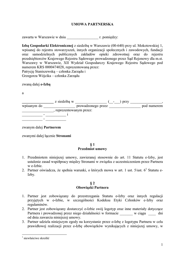 UMOWA PARTNERSKA zawarta w Warszawie w dniu _________________ r. pomiędzy: Izbą Gospodarki Elektronicznej z siedzibą w Warszawie (00-640) przy ul. Mokotowskiej 1, wpisanej do rejestru stowarzyszeń, innych organizacji społecznych i zawodowych, fundacji oraz samodzielnych publicznych zakładów opieki zdrowotnej oraz do rejestru przedsiębiorców Krajowego Rejestru Sądowego prowadzonego przez Sąd Rejonowy dla m.st. Warszawy w Warszawie, XII Wydział Gospodarczy Krajowego Rejestru Sądowego pod numerem KRS 0000474028, reprezentowaną przez: Patrycję Staniszewską – członka Zarządu i Grzegorza Wójcika – członka Zarządu zwaną dalej e-Izbą a _________________ z siedzibą w _________________ (__-___) przy _________________, wpisanym do _________________ prowadzonego przez _________________ pod numerem _________________, reprezentowanym przez: ___________ - ___________ i ___________ - ___________ zwanym dalej Partnerem zwanymi dalej łącznie Stronami §1 Przedmiot umowy 1. Przedmiotem niniejszej umowy, zawieranej stosownie do art. 11 Statutu e-Izby, jest ustalenie zasad współpracy między Stronami w związku z uczestniczeniem przez Partnera w e-Izbie. 2. Partner oświadcza, że spełnia warunki, o których mowa w art. 1 ust. 5/ust. 61 Statutu eIzby. §2 Obowiązki Partnera 1. Partner jest zobowiązany do przestrzegania Statutu e-Izby oraz innych regulacji przyjętych w e-Izbie, w szczególności Kodeksu Etyki Członków e-Izby oraz regulaminów. 2. Partner jest zobowiązany dostarczyć e-Izbie swój logotyp oraz inne materiały dotyczące Partnera i prowadzonej przez niego działalności w formacie _______ w ciągu ____ dni od dnia zawarcia niniejszej umowy. 3. Partner udziela niniejszym zgody na korzystanie przez e-Izbę z logotypu Partnera w celu prawidłowej realizacji przez e-Izbę obowiązków wynikających z niniejszej umowy, w 1 niewłaściwe skreślić 1 szczególności określonych § 3 ust. 2 niniejszej umowy, oraz dla pełnej realizacji określonych w niniejszej umowie zasad współpracy pomiędzy Stronami. e-Izba jest w szczególności uprawniona do informowania o współpracy z Partnerem i korzystania z logotypu w celach marketingowych i promocyjnych e-Izby. 4. Partner jest zobowiązany dbać o dobre imię e-Izby, przestrzegać zasad etyki zawodowej oraz dobrych obyczajów. 5. Partner jest zobowiązany udzielać e-Izbie niezbędnych informacji na swój temat w celu prawidłowego funkcjonowania e-Izby oraz prawidłowej realizacji niniejszej umowy, w tym wskazywać swój aktualny adres poczty elektronicznej oraz aktualizować inne dane, w szczególności podane w deklaracji partnerskiej. §3 Obowiązki e-Izby 1. e-Izba zobowiązuje się nadać Partnerowi status Partnera e-Izby w oparciu o deklarację w przedmiocie udzielenia e-Izbie wsparcia w realizacji przez nią celów statutowych (deklarację partnerską) oraz niniejszą umowę. 2. W związku z nadaniem Partnerowi przez e-Izbę statusu Partnera e-Izby, e-Izba zobowiązuje się do: 1) zamieszczenia logotypu Partnera na stronie internetowej: www.ecommercepolska.pl w części „partnerzy”; 2) zamieszczenia informacji o nadaniu Partnerowi statusu Partnera e-Izby na stronie internetowej: www.ecommercepolska.pl. 3. Z chwilą nadania Partnerowi przez e-Izbę statusu Partnera e-Izby, e-Izba udziela Partnerowi zgody na korzystanie przez Partnera z tytułu „Partner e-Izby”. 4. e-Izba zobowiązuje się świadczyć na rzecz Partnera usługi składające się na Pakiet Usług Partnerskich począwszy od dnia zawarcia niniejszej umowy przez okres obowiązywania Pakietu Usług Partnerskich. Szczegółowy opis usług składających się na Pakiet Usług Partnerskich zawiera załącznik nr 1 do niniejszej umowy. Wysokość i zasady wnoszenia opłat za usługi składające się na Pakiet Usług Partnerskich zostały określone w § 5 ust. 1 niniejszej umowy. §4 Podstawowe uprawnienia Partnera w ramach Pakietu Usług Partnerskich 1. Partner może aktywnie uczestniczyć w działalności e-Izby i wyrażać opinie w sprawach z zakresu działalności e-Izby, w szczególności poprzez: 1) uczestnictwo w posiedzeniach Walnego Zgromadzenia e-Izby z wyłączeniem prawa głosu; 2) uczestnictwo w spotkaniach grup merytorycznych, do których przystąpił Partner. 2. Partner jest informowany o dacie i miejscu posiedzeń Walnego Zgromadzenia w ten sam sposób co Członkowie e-Izby. 3. Od momentu nadania Partnerowi przez e-Izbę statusu Partnera e-Izby Partner może posługiwać się tytułem Partnera e-Izby. 4. W przypadku organizowania przez e-Izbę wydarzeń o charakterze odpłatnym lub objęcia przez e-Izbę patronatu nad tego rodzaju wydarzeniami, Partner jest uprawniony do otrzymania zniżki w opłacie przysługującej członkowi e-Izby. 2 §5 Wynagrodzenie 1. Z tytułu świadczenia przez e-Izbę na rzecz Partnera usług w ramach Pakietu Usług Partnerskich, Partner jest zobowiązany do zapłaty rocznego wynagrodzenia, którego wysokość jest ustalana na podstawie cennika i informacji podanych przez Partnera w deklaracji partnerskiej. Cennik obowiązujący w dniu zawarcia niniejszej umowy stanowi załącznik nr 2 do niniejszej umowy. 2. Wynagrodzenie obejmuje okres każdego roku kalendarzowego obowiązywania niniejszej umowy, z zastrzeżeniem pierwszego roku kalendarzowego jej obowiązywania, w którym stosuje się poniższe zasady: 1) jeżeli niniejsza umowa została zawarta w pierwszej połowie roku kalendarzowego – wówczas Partner zobowiązany jest do zapłaty wynagrodzenia w pełnej wysokości za pierwszy rok kalendarzowy, 2) jeżeli niniejsza umowa została zawarta w drugiej połowie roku kalendarzowego – wówczas Partner zobowiązany jest do zapłaty wynagrodzenia równego połowie wynagrodzenia za pierwszy rok kalendarzowy. 3. Płatność wynagrodzenia, o którym mowa w ust. 1 powyżej, następuje z góry w dwóch ratach płatnych: 1) na podstawie noty księgowej wystawianej przez e-Izbę na początku stycznia każd