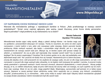 STYCZEŃ 2015 CZY NAPRAWDĘ CHCESZ ROZWIJAĆ SWOICH LUDZI Warsztat dla menedżerów jednego z największych banków w Polsce: „Rola przełożonego w rozwoju swoich podwładnych”. Temat coraz częściej zgłaszany jako ważny, nawet kluczowy, przez liczne działy personalne. Skąd ta potrzeba? I skąd problemy w jej realizowaniu na co dzień? Renata Tadeusiak Dyrektor TTX Institute Menedżerowie bardzo zajęci robią wyniki, dbają o jakość obsługi klienta i nie bardzo mają czas na spotkania z pracownikami dotyczące ich rozwoju. Trochę to rozumiem, bo sama nie dość często rozmawiam z moimi ludźmi o tym, jakie cele rozwojowe sobie stawiają. Zatem warsztat bardzo praktyczny, blisko realnych wyzwań, aby każdy z uczestników mógł określić, jak to z tym jego nastawieniem do rozwoju swoich ludzi jest. Okazuje się, że bardzo często cała sprawa rozbija się właśnie „o nastawienie”, bo czy ja jako szef naprawdę chcę rozwijać swoich ludzi? Czy na pewno każdego? Na ile jestem wspierający? Cierpliwy? Na ile jestem gotów na to, aby mój podwładny sam definiował swoje cele? No i przecież nie każdy chce się rozwijać. Nastawienie jest tu zatem kluczowe, zresztą dla obydwu stron. Jeśli pracownik nie ma zaufania do swojego szefa, nie jest on dla niego autorytetem, nie lubi z nim rozmawiać o rzeczach dla niego ważnych jako człowieka, to nie będzie miał motywacji do spotkań i rozmów. A przecież trzeba wtedy powiedzieć o sprawach ważnych: moich mocnych stronach, obszarach doskonalenia, o moich planach... Muszę podjąć decyzję, że to, co robiłem dotychczas, będę od jutra robił inaczej lub zacznę robić coś nowego, na czym zupełnie się nie znam. Dużo więc ryzykuję. Może mi się nie udać, mogę popełnić błędy. Wspierający, wyrozumiały szef pomoże mi w takiej nowej sytuacji. Zapewne w naszej pamięci łatwo odróżnimy osoby, które wspierały nas w rozwoju, przy których „rozwijaliśmy skrzydła”, przekraczaliśmy to, co niemożliwe... Jakie cechy miały te osoby? Jakie były? Obyśmy takich menedżerów spotykali na swojej drodze zawodowej i takimi menedżerami byli dla swoich ludzi. ZMIENIŁA SIĘ TA ZMIANA Firmy inaczej podchodzą do wykorzystywania wsparcia w przejściu przez zmianę. Dotychczas z podobnych serwisów (warsztaty zarządzania zmianą, konsultacje grupowe, indywidualne sesje coachingowe) korzystały głównie korporacje przechodzące przez restrukturyzacje, fuzje, zwolnienia – słowem: trudne zmiany związane najczęściej z redukcją etatów. Obecnie coraz częściej korzystają z niego firmy, które planują zmianę struktury, profilu działalności czy też modyfikują dotychczasowe sposoby działania na rynku. W konsekwencji takie decyzje wymagają ponownego przemyślenia ról i kompetencji menedżerskich oraz sposobu realizacji codziennych zadań. Dla menedżerów oznacza to konieczność szybkiego „przestawienia się” na inny, często trudniejszy dla nich sposób funkcjonowania: umiejętność zarządzania zespołem na każdym etapie zmiany; komunikowania decyzji, które naruszają dotychczasowe „status quo” poszczególnych członków zespołu; utrzymania własnej motywacji w niełatwym okresie… źródło:sxc.hu Dla większości firm, z perspektywy biznesowej, nadal kluczowa pozostaje walka o wysoki poziom satysfakcji klientów, zarówno zewnętrznych, jak i wewnętrznych, co wiąże się np. z zadbaniem o ludzi bezpośrednio odpowiedzialnych za serwisy klienckie. Uczestnicy warsztatów i sesji najwyższą wartość widzą w konkretnych, wypracowanych inicjatywach, które wspierają współpracę w zespole w trakcie zmiany oraz rozwijają nowe narzędzia menedżerskie skuteczne w pracy z ludźmi w trakcie zmiany. Nie dziwi zatem, że jako najbardziej wartościowy efekt programu menedżerowie najczęściej wskazują „przejęcie odpowiedzialności za zmianę”. Ewa Solarczyk-Konik, Lee Hecht Harrison DBM, Kraków PRZEPRASZAM, CZY MOGĘ WYCOFAĆ WYPOWIEDZENIE… źródło:sxc.hu „Cofnięcie oświadczenia woli o wypowiedzeniu umowy o pracę (potocznie określanego wypowiedzeniem) nie jest uregulowane przepisami Kodeksu Pracy (KP), zatem na podstawie art. 300 KP należy stosować tu Kodeks Cywilny. Wynika z niego, że wypowiedzenie umowy o pracę jest złożone z chwilą, gdy doszło do adresata (w zależności od sytuacji pracownika lub pracodawcy) w taki sposób, że mógł zapoznać się z jego treścią. Odwołanie wypowiedzenia (potocznie określanego cofnięciem wypowiedzenia) jest możliwe, jeżeli oświadczenie o odwołaniu wypowiedzenia dojdzie do adresata jednocześnie lub wcześniej od oświadczenia o wypowiedzeniu umowy o pracę. W przypadku niezachowania tego warunku i późniejszego cofnięcia wypowiedzenia tj. po tym jak wypowiedzenie umowy o pracę dotarło już do adresata, koniecznym elementem warunkującym jego skuteczność jest zgoda drugiej strony na cofnięcie przedmiotowego oświadczenia. Dla celów dowodowych należałoby również dążyć do tego, aby oświadczenie o cofnięciu wypowiedzenia umowy o pracę zostało sporządzone i doręczone drugiej stronie na piśmie (choć nie jest to forma wymagana prawem), na którym zostanie potwierdzona data doręczenia, a także złożone oświadczenie o wyrażeniu zgodny na cofnięcie odwołania.” Ewa Badowska-Domagała radca prawny w kancelarii GDBD MEDIA FLASH „Nie tak łatwo zmienić zawód” - Puls Biznesu, D.Czerwińska, 2014.12.01 Przekwalifikowanie pomaga się utrzymać na rynku pracy. Ale to duże wyzwanie. Po pierwsze - trzeba zdobyć nowe kwalifikacje, co wymaga inwestycji czasu i pieniędzy. Niektóre kwalifikacje łatwiej uzupełnić, bo wystarczy kurs, inne wymagają np. ukończenia studiów. Po drugie - problemem jest wchodzenie w nową rolę. Dla pracodawców najważniejsze jest doświadczenie, więc punkt wyjściowy takiego kandydata jest podobny jak osoby tuż po szkole czy studiach. Startuje niejako od zer