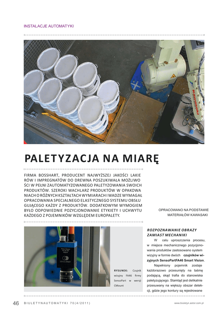 INSTALACJE AUTOMATYKI PALETYZACJA PALET YZACJANA NAMIARĘ MIARĘ FIRMA BOSSHART, PRODUCENT NAJWYŻSZEJ JAKOŚCI LAKIE RÓW I IMPREGNATÓW DO DREWNA POSZUKIWAŁA MOŻLIWO ŚCI W PEŁNI ZAUTOMATYZOWANEGO PALETYZOWANIA SWOICH PRODUKTÓW. SZEROKI WACHLARZ PRODUKTÓW W OPAKOWA NIACH O RÓŻNYCH KSZTAŁTACH WYMIARACH I WADZE WYMAGAŁ OPRACOWANIA SPECJALNEGO ELASTYCZNEGO SYSTEMU OBSŁU GUJĄCEGO KAŻDY Z PRODUKTÓW. DODATKOWYM WYMOGIEM BYŁO ODPOWIEDNIE POZYCJONOWANIE ETYKIETY I UCHWYTU KAŻDEGO Z POJEMNIKÓW WZGLĘDEM EUROPALETY. OPRACOWANO NA PODSTAWIE MATERIAŁÓW KAWASAKI ROZPOZNAWANIE OBRAZY ZAMIAST MECHANIKI W celu uproszczenia procesu, w miejsce mechanicznego pozycjonowania produktów zastosowano system wizyjny w formie dwóch czujników wizyjnych SensoPartFA46 Smart Vision. Napełniony RYSUNEK: wizyjny FA46 SensoPart CMount w pojemnik zostaje Czujnik każdorazowo przesunięty na taśmę fi rmy podającą, skąd traa do stanowiska wersji paletyzującego. Stamtąd jest delikatnie przesuwany na większy obszar detekcji, gdzie jego kontury są rejestrowane 46 B I U L E T Y N A U T O M AT Y K I 7 0 ( 4 / 2 0 11 ) www.biuletyn.astor.com.pl INSTALACJE AUTOMATYKI RYSUNEK: Chwytak ssawkowo-mechaniczny i wykrywane przez czujnik wizyjny. kiedy burzowe chmury przyciemnia- saki mogą niezależnie od programu Uzyskane dane o kształcie i orientacji ją otoczenie. Taki wpływ warunków ruchu wykonywać równocześnie 5 do- środka ciężkości pojemnika traają po- oświetlenia na jakość pracy systemu datkowych równoległych programów przez sieć LAN do robota paletyzujące- musiał zostać i został wyeliminowany. PC. Te programy zostały wykorzystane go typu FD050N rmy Kawasaki. Ten Wystarczyło nieco przyciemnić okna do nadzoru nad całą linią. Kontroler z dużą dokładnością chwyta pojemnik w bezpośrednim otoczeniu stanowiska, robota Kawasaki umożliwia również i układa go na palecie zgodnie z prze- tak aby warunki oświetlenia zmieniały korzystanie z kazanymi wcześniej informacjami. się w mniejszym zakresie. Resztą zajął nika softwarowego Soft-PLC. Wyko- Problem rozpoznania pozycji na- prawdziwego sterow- się już system wizyjny, który umożli- rzystanie tego rozwiązania zapewnia pisu i uchwytu przy różnych wielko- wia wykonanie optymalnego zgięcia bardzo precyzyjne sterowania z gwa- ściach i kolorach pojemników rozwią- w pełnym zakresie zmian oświetlenia rancją czasu cyklu. W ten sposób przy zano przy pomocy czujnika wizyjnego aktualnie panujących na hali. mniejszych SensoPart FA46 Smart Vision, który spełnia swoje zadanie ze 100% skutecznościąpozostającprawieniewidoczny w urządzeniu. aplikacjach użytkownik oszczędza czas związany z montażem DOBRY ROBOT TO PODSTAWA DOBREGO SYSTEMU W i programowaniem standardowego sterownika PLC oraz jego okablowaniem celu zapewnienia pewnego i deniowaniem interfejsu. Problemem przy obróbce zdjęć chwytu opakowań o dużej masie za- Dotykowy panel sterowania z ko- z systemu wizyjnego okazał się wpływ stosowano specjalny chwytak oparty lorowym wyświetlaczem umieszczony światła zewnętrznego przy rejestracji o przyssawki uzupełnione zaciskiem na froncie kontrolera robota ułatwia konturów dużych obiektów, które wy- mechanicznym. interakcję człowieka z magają większego oddalenia od sensora wizyjnego. W obszar detekcji zawsze traa maszyną bez skomplikowanych szkoleń. Umożliwia tylko jeden pojemnik. Uzyskano to sto- to np. szybkie i proste przeprowadza- sując na taśmie podającej konstrukcję nie zmian produktu. W świeci we fronty okien, powstają moc- do rozdzielania artykułów. Całe oprzy- robot staje się urządzeniem realizują- ne rozjaśnienia, reeksy lub cienie rządowanie (rozdziela- cym sterowanie, nadzór oraz sam pro- mogące zakłócać rejestrację obiektów cze artykułów, transportery, magazyn ces paletyzacji, przy pomocy którego i palet, kontrola palet) sterowane jest w kompleksowy sposób mogą być prze- przez kontroler robota. Roboty Kawa- prowadzane skomplikowane zadania. Kiedy w południe słońce ostro dostarczać lekko zniekształconych konturów w porównaniu do sytuacji, www.biuletyn.astor.com.pl stanowiska BIULETYNAUTOMATYKI ten sposób 7 0 ( 4 / 2 0 11 ) 47