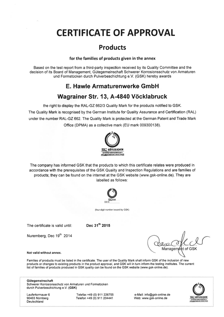 Tłumaczenie z j. angielskiego CERTYFIKAT ZGODNOŚCI Produkty z grupy wyrobów wymienionych w załączniku Na podstawie raportu z badań przeprowadzonych przez jednostkę zewnętrzną, otrzymanego przez Komitet Jakości oraz decyzji Zarządu, Stowarzyszenie Ochrony Antykorozyjnej Armatur i Kształtek Poprzez Pokrycie Proszkowe (GSK) niniejszym nadaje E.Hawle Armaturenwerke GmbH Wagrainer Str. 13, A-4840 Vöcklabruck prawo do znakowania Znakiem Jakości RAL-GZ 662/3 dla produktów notyfikowanych w GSK. Znak Jakości uznawany jest przez Niemiecki Instytut Zapewniania Jakości oraz Certyfikacji (RAL), pod numerem RAL-GZ 662. Znak Jakości chroniony jest w Niemieckim Urzędzie Patentów oraz Znaków Towarowych jako znak wspólny (EU 009300138) Firma poinformowała GSK że wyroby do których odnosi się niniejszy certyfikat zostały wyprodukowane w zgodności z wymaganiami wstępnymi Przepisów Jakościowych oraz Kontrolnych GSK oraz są grupami produktów: można je znaleźć na stronie internetowej GSK (www.gsk-online.de). Oznakowane są jak poniżej: data ważności Świadectwa – 31.12.2015 Nürnberg , 19.12 .2014 Nieważne bez załącznika Menedżer /podpis nieczytelny/ Załącznik certyfikatu dopuszczenia produktowego. Wyroby Certyfikat przyznany E.Hawle Armaturenwerke GmbH WAgrainer Str. 13, A-4840 Vöcklabruck jest obowiązujący dla poniżej wymienionych produktów: Opis Zasuwy do przyłączy domowych ze złączem ISO Zasuwy kołnierzowe E2 Zasuwy redukcyjne E2 Zasuwy kołnierzowe Hawle-A Zasuwy Hawle-A z mufami elektrooporowymi Hawle VARIO krótkie i długie Hawle Synoflex Hawle Combiflex Kształtka T Kształtka TT Kształtka FF Kształtka Q Kołnierz luźny Hydrant typu EURO 2000 RW0 – wszystkie wykonania Hydrant typu DUO – wszystkie wykonania Hydrant podziemny Euro/DUO – wszystkie wykonania Hydrant tunelowy – wszystkie wykonania Hydrant staromiejski – wszystkie wykonania Hydrant BS 750 Hydrant podziemny EXPO – wszystkie wykonania Certyfikat jest ważny do: Nuremberg, 19.12.2014 Średnica nominalna DN ½” – DN 2” DN 20 – DN 600 DN 65 – DN 300 DN 50 – DN 200 DN 80, 100, 150 DN50 - 200 DN50 - 300 DN100 – DN400 DN200 – DN300 DN50 – DN300 DN80 – DN250 DN250 DN80 – DN100 DN80 – DN150 DN80 – DN100 DN80 – DN100 DN80 – DN100 DN80 – DN100 DN80 – DN100 DN80 31.12.2015 Menedżer /podpis nieczytelny/