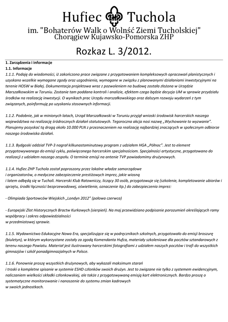 Rozkaz L. 3/2012. 1. Zarządzenia i informacje 1.1. Informacje 1.1.1. Podaję do wiadomości, iż zakończono prace związane z przygotowaniem kompleksowych opracowań planistycznych i uzyskano wszelkie wymagane zgody oraz uzgodnienia, wymagane w związku z planowanymi działaniami inwestycyjnymi na terenie HOSW w Białej. Dokumentacja projektowa wraz z pozwoleniem na budowę została złożona w Urzędzie Marszałkowskim w Toruniu. Zostanie tam poddana kontroli i analizie, efektem czego będzie decyzja UM w sprawie przydziału środków na realizację inwestycji. O wynikach prac Urzędu marszałkowskiego oraz dalszym rozwoju wydarzeń z tym związanych, poinformuję po uzyskaniu stosownych informacji. 1.1.2. Podobnie, jak w minionych latach, Urząd Marszałkowski w Toruniu przyjął wnioski środowisk harcerskich naszego województwa na realizację śródrocznych działań statutowych. Tegoroczna akcja nosi nazwę „Wychowanie to wyzwanie”. Planujemy pozyskać tą drogą około 10.000 PLN z przeznaczeniem na realizację najbardziej znaczących w społecznym odbiorze naszego środowiska działań. 1.1.3. Bydgoski oddział TVP-3 nagrał kilkunastominutowy program z udziałem HGA „Północ”. Jest to element przygotowywanego do emisji cyklu, poświęconego harcerskim specjalnościom. Specjalności artystyczne, przygotowano do realizacji z udziałem naszego zespołu. O terminie emisji na antenie TVP powiadomimy drużynowych. 1.1.4. Hufiec ZHP Tuchola został poproszony przez lokalne władze samorządowe i organizatorów, o medyczne zabezpieczenie prestiżowych imprez, jakie wiosną i latem odbędą się w Tucholi. Harcerski Klub Ratowniczy, liczący 30 osób, przygotowuje się (szkolenie, kompletowanie ubiorów i sprzętu, środki łączności bezprzewodowej, oświetlenie, oznaczenie itp.) do zabezpieczenia imprez: - Olimpiada Sportowców Wiejskich „Londyn 2012” (połowa czerwca) - Europejski Zlot Historycznych Bractw Kurkowych (sierpień). Na maj przewidziano podpisanie porozumień określających ramy współpracy i zakres odpowiedzialności w przedmiotowej sprawie. 1.1.5. Wydawnictwo Edukacyjne Nowa Era, specjalizujące się w podręcznikach szkolnych, przygotowało do emisji broszurę (biuletyn), w którym wykorzystane zostały za zgodą Komendanta Hufca, materiały szkoleniowe dla pocztów sztandarowych z terenu naszego Powiatu. Materiał jest ilustrowany harcerskimi fotografiami z udziałem naszych pocztów i trafi do wszystkich gimnazjów i szkół ponadgimnazjalnych w Polsce. 1.1.6. Ponownie proszę wszystkich drużynowych, aby wykazali maksimum starań i troski o kompletne spisanie w systemie ESHD członków swoich drużyn. Jest to związane nie tylko z systemem ewidencyjnym, naliczaniem wielkości składki członkowskiej, ale także z przygotowywaną emisją kart elektronicznych. Bardzo proszę o systematyczne monitorowanie i nanoszenie do systemu zmian kadrowych w swoich jednostkach. 2. Hufiec 2.1. Powołanie i rozwiązanie sztabów, komisji, komend kursów 2.1.1. Powołuję Sztab Rajdu „Trampoteka 2012” w składzie: dh. pwd. Maciej Myśliwiec HO – Komendant, dh. pwd. Łukasz Podgórski HO – Zastępca Komendanta, dh. HO. Patryk Myśliwiec – Oboźny Rajdu, dh. Jan czerwiński – Kwatermistrz Rajdu dh. pwd. Kacper Pril – Koordynator trasy/ Członek Komendy Rajdu Drużynę sztabową wystawi 4 DH „Buki” ze Śliwic. Tegoroczna „Trampoteka” odbędzie się na bazie ZS w Cekcynie. Bardzo proszę o odpowiednie rozpropagowanie imprezy w swoich środowiskach i niezawodny udział. 2.2.2. Powołuję Sztab Harcerskiej Akcji Letniej 2012 - dh pwd. Wioletta Górska – Komendant - dh pwd. Ewelina Drzycimska – Zastępca komendanta - dh phm. Jacek Jeziorski – Członek Komendy Komenda podejmie wszelkie działania, jakie są niezbędne do przygotowania i realizacji obozów dla harcerzy naszego Hufca oraz przyjezdnych gości HOSW w Białej na podstawie zawartych umów o świadczenie usług obozowych. Dotyczy to w szczególności rekrutacji uczestników, skompletowania kadry, rejestracji wypoczynku w oparciu o przepisy resortu edukacji, promocji przedsięwzięcia oraz innych koniecznych działań (logistycznych, sanitarnych, remontowych, a także niezbędnych rejestracji, pozwoleń i zakupów). 3. Mianowania instruktorów 3.1. Zamknięcia próby na stopień przewodniczki/przewodnika 3.1.1. Na wniosek Komisji Stopni Instruktorskich zamykam próbę, przyznaję stopień przewodnika i dopuszczam do złożenia Zobowiązania Instruktorskiego: - dh Kacpra Pril - dh Izabelę Słoma - dh Julię Kaczanowską - dh Dominikę Rudzińską Serdecznie gratuluję. Życzę wiele satysfakcji z podjętej służby, odnajdywania nowych wyzwań i szerokiego grona wspierających Przyjaciół. 4. Pochwały, wyróżnienia, nagrody 4.1. Pochwały. 4.1.1. Serdecznie dziękuję Kwatermistrzowi Hufca - druhowi pwd. Kacprowi Pril oraz członkom 1DW „Gryf” za magazynowe porządki, jakie poczynione zostały w głównym magazynie Hufca. Czuwaj! hm Jarosław Słoma