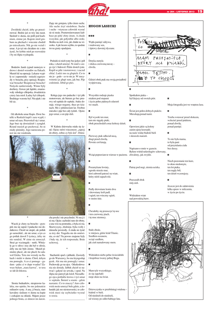 nr 204 - LISTOPAD 2013 * Zwoliñski chcio³, ¿eby go przezimowaæ. Bedzie ju¿ ze trzy lata nazat. Siedzio³ w dumu, nie poli³ pod kuchnium, zimne jot. Kapote mio³ grubum na plechach i wiecznie chodzi³ po mieszkaniu. Nik go nie wziu³ i umar. A jo ty¿ nie chcia³am sie z nim ¿yniæ, bo kobite mio³ po rozwodzie i by mi œlipia wydrapa³a. * Boderów Janek rypnu³ motorym w drewo i dosto³ wrzodów na flakach. Musio³ iœæ na operacje. Lekarze wypi³y se i zapumnia³y - no¿ycki zagrzynz³y w brzuchu, przy operacji. Rozpruwaæ brzucho! Rozpruwaæ brzucho! No¿ycki zardzewnia³y. Winne by³y dochtory. Gorsze jak ³ajdoki, zmarnowa³y m³odego ch³opoka, dwadzieœcia cztery lata mio³. £adny by³ ch³opok. Œredniego wzrostu by³. Nie-pijok i nie bi³ sie. * Od alkoholu umar Kupis. Dwie butelki u Ruskich kupi³ i zara wypi³, i umar od razu. Przewróci³ siê i umar. Jego brat siê dowiedzio³ i zymglo³. Rzund musio³ go pochowaæ, bo ni mia³y pinindzy. Jego narzecuna ponoæ nic nie wiedzia³a. Zupy nie gotujum, tylko ¿rum suche. Ale suche ¿ryæ niedobrze. Suche i suche - wtynczas cz³owiek wysraæ sie ni mo¿e. Przeterminowanum kie³base po piñæ z³oty ¿rum. A chude wszyskie, jak go³ymbie albo sroki. Skórka na nich wisi, jak cha³at na wiszoku. A jak lecum szybko, to spodnie im na gnaty opadajum. HUGON LASECKI Wątła pamięć odżywa, i malowany sen, i śpiewy dawniej słyszane. * PoŸniok ni mio³ rynty bez jedyn i pó³ roku, i chcio³ umrzyæ. Ni mio³ z czego ¿yæ i bidowo³. PóŸni dosto³ rynte. Kupi³ se pi³e i motorower, i zaczu³ chlaæ. Ludzi mo za g³upich. Co to nie jo - godo - co to nie jo. W rzecywistoœci je g³upi sum, jak but. Pije codzinnie. Jeba³ go pies. Dotyka motyla i słońca czerwoną tarczę – chwila. Gdzieś obok ptak ma swoją posiadłość wyśpiewaną. * Kolega jego mo padaczke i ty¿ pi³e motorowum, ale bierum go bez przerwy od szpitala do szpitala. Ataku dostaje, wirzgo nogamy, t³uce po œcianach. Mo z piñdziesiunt lat. Osobno mieszko i pije bez ca³y tydziñ. Ojciec jego umar, a un pije dali. * Wszystkie rodzaje piasku miałem pod stopami i życie pełne pięknych zdarzeń we snach. Spotkałem ptaka – był lżejszy od swoich piór. Moja fotografia jest we wnętrzu lasu. Świat jest pełen dobrych ptaków. Mieszkają ponad nami. Był wysoki ten mur, tam nie sięgały ptaki, obok przechodził coraz krótszy dzień. W Kaliniu dziewucha mia³a siê ¿yniæ. Ojciec mówi wieczorym: „zajrzyj do obory, zoboc cy byk stoi”. DzieuPierwszy ptak odleciał nocą, drugi przed chwilą. Pewnie coś knują. Opowiem jakie są kolory zanim ujrzę krawędź; na razie widzę białość bieli i skrawek marzeń. Napisano o mnie w gazecie. Byłem wśród nekrologów schowany, Wciąż poprawiam te wiersze w pacierzu. chwalony, jak zwykle. Pozamykane kwiaty, ogrodu strzeże mur, ktoś zabronił patrzeć na wiatr, który niósł zapach róż. Patrzę pod nogi, ziemia ucieka. Trzeba wstawać przed słońcem, wzlecieć przed ptakiem, ponad chwilę, ponad pamięć. To nie była mama, to była pani od przytulania ciała bez duszy. Niech pozostanie ten kurz, to okno niedomyte, ten lot ptaka, ten nagły ból, ten dzień wczorajszy. Przeszedł obok mój cień. Padły drewniane konie dwa i drewniany król padł, i ogień, ten wieczny ogień, w moim śnie. * Wacek je chory na brzucho - pympek mu siê zapod. I padaczke mo dodatkowo. Chcio³ sie utopiæ, ale pot³uk go samochód... ale nie umar, a tyn co go pot³uk dawo³ 5 tysincy, ¿eby sie nie sundziæ. W zime sie zmoczy³. Stra¿ go wyciunga³a - nurki. W³o¿y³y go w oliwe i trzy dni by³ w oliwie, ¿eby mu nie by³o zimno. Musio³ pinindze p³aciæ, ale nie p³aci³, bo udawo³ Greka. Tera mo wrzody na flakach i siedzi w dumu. Chio³, ¿ebym mu pomog³a. A co ci pomoge - gadum - palec ci w dupe wsadze? Zawsze by³am „stara kurwa”, to tera se idŸ do lekorza. * Siostra bednarków, niesprawno kaleka, mo opieke, bo mo jedenaœcie miliunów rynty. A uny, ji bracia, stare kawalery siedzum w dumu na kupie i czekajum na oklaski. Majum jeszce jednego brata, co donosi im ¿arcie. 19 cha posz³a i nie przychodzi. Ni ma ji i ni ma. Ojciec zachodzi rano do obory, a una wisi na postrunku, a byka ni ma. Skurwysyny, z³odzieje, byka wzi³y i dzieuche powiesi³y. A mia³a sie ¿yniæ za trzy dni. Tragedia nie do omówinia, co nie? Na pewno znajume by³y i ba³y siê, ¿e ich rozpozna³a. Bo¿e uchowej. Chciałoby się przeoczyć tę noc i ten czerwony piach, i tę moc niemocy. Stało zboże, w miejscu, gdzie leżał Titanic. Szedłem oceanem, wciąż szedłem, jak cień namalowany snem. * Stachurski spod z jab³unki. Zawiez³y go do Warszawy, bo mu kryngos³up pynk. Ale mu nie pomog³y i umar. Pochowa³y go na ojcu. Odszkodowania nie dosta³y. Jab³ek chcio³ se narwaæ i ga³ynŸ sie urwa³a, i spod. Na œlipia nie patrzy³ jak le¿o³. Niezad³ugo ojca pot³uk³a krowa i ty¿ umar w szpitalu. Œmieræ a sranie - gdzie nastanie. Co to znaczy? Ano cz³owiek mo¿e umrzyæ bele gdzie, a ¿o³undek jak mo niestrawnoœci, to cz³owiek musi siê szybciutko wysraæ w rowie. Widziałem niebo pełne świecidełek i krajobraz twarzy pełnej Boga. Mam tyle wszystkiego, że się zapchało moje okno na świat. Dziewczynka w przebiśniegi wtulona – białość w bieli. Od niedzieli do niedzieli, od wiosny po odlot babiego lata. Jeszcze jest do załatwienia kilka spraw w milczeniu, w życiu po życiu. Widziałem wiatr nad powodzią barw.