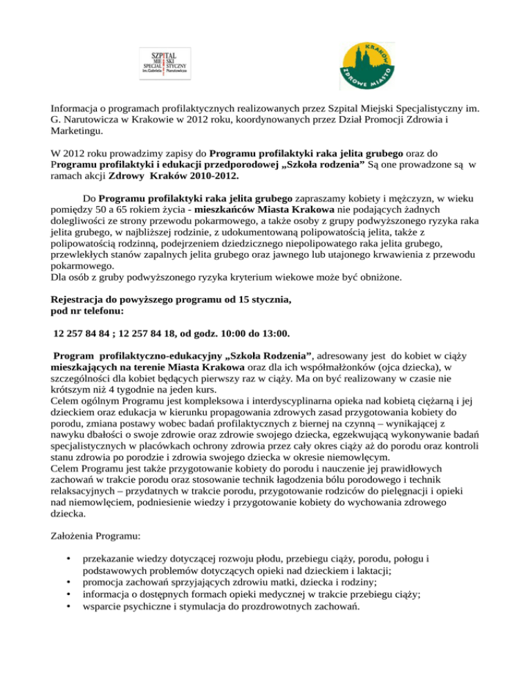 Informacja o programach profilaktycznych realizowanych przez Szpital Miejski Specjalistyczny im. G. Narutowicza w Krakowie w 2012 roku, koordynowanych przez Dział Promocji Zdrowia i Marketingu. W 2012 roku prowadzimy zapisy do Programu profilaktyki raka jelita grubego oraz do Programu profilaktyki i edukacji przedporodowej „Szkoła rodzenia” Są one prowadzone są w ramach akcji Zdrowy Kraków 2010-2012. Do Programu profilaktyki raka jelita grubego zapraszamy kobiety i mężczyzn, w wieku pomiędzy 50 a 65 rokiem życia - mieszkańców Miasta Krakowa nie podających żadnych dolegliwości ze strony przewodu pokarmowego, a także osoby z grupy podwyższonego ryzyka raka jelita grubego, w najbliższej rodzinie, z udokumentowaną polipowatością jelita, także z polipowatością rodzinną, podejrzeniem dziedzicznego niepolipowatego raka jelita grubego, przewlekłych stanów zapalnych jelita grubego oraz jawnego lub utajonego krwawienia z przewodu pokarmowego. Dla osób z gruby podwyższonego ryzyka kryterium wiekowe może być obniżone. Rejestracja do powyższego programu od 15 stycznia, pod nr telefonu: 12 257 84 84 ; 12 257 84 18, od godz. 10:00 do 13:00. Program profilaktyczno-edukacyjny „Szkoła Rodzenia”, adresowany jest do kobiet w ciąży mieszkających na terenie Miasta Krakowa oraz dla ich współmałżonków (ojca dziecka), w szczególności dla kobiet będących pierwszy raz w ciąży. Ma on być realizowany w czasie nie krótszym niż 4 tygodnie na jeden kurs. Celem ogólnym Programu jest kompleksowa i interdyscyplinarna opieka nad kobietą ciężarną i jej dzieckiem oraz edukacja w kierunku propagowania zdrowych zasad przygotowania kobiety do porodu, zmiana postawy wobec badań profilaktycznych z biernej na czynną – wynikającej z nawyku dbałości o swoje zdrowie oraz zdrowie swojego dziecka, egzekwującą wykonywanie badań specjalistycznych w placówkach ochrony zdrowia przez cały okres ciąży aż do porodu oraz kontroli stanu zdrowia po porodzie i zdrowia swojego dziecka w okresie niemowlęcym. Celem Programu jest także przygotowanie kobiety do porodu i nauczenie jej prawidłowych zachowań w trakcie porodu oraz stosowanie technik łagodzenia bólu porodowego i technik relaksacyjnych – przydatnych w trakcie porodu, przygotowanie rodziców do pielęgnacji i opieki nad niemowlęciem, podniesienie wiedzy i przygotowanie kobiety do wychowania zdrowego dziecka. Założenia Programu: • • • • przekazanie wiedzy dotyczącej rozwoju płodu, przebiegu ciąży, porodu, połogu i podstawowych problemów dotyczących opieki nad dzieckiem i laktacji; promocja zachowań sprzyjających zdrowiu matki, dziecka i rodziny; informacja o dostępnych formach opieki medycznej w trakcie przebiegu ciąży; wsparcie psychiczne i stymulacja do prozdrowotnych zachowań. Formy i zasady prowadzenia edukacji przedporodowej: zbiorowa – wykłady, zajęcia praktyczne w podgrupach (do 10 par), w tym: • • zajęcia teoretyczne w wymiarze nie mniejszym niż (4) spotkania seminaryjne trwające 90 minut; zajęcia praktyczne w wymiarze nie mniejszym niż (4) spotkania trwające 60 minut. Zapisy do programu po 15 stycznia pod nr tel. 12 257 86 05, po godzinie 16-ej. Wszystkie programy profilaktyczne realizowane w Szpitalu są w całości finansowane przez Urząd Miasta Krakowa. Agnieszka Marzęcka Rzecznik Prasowy Szpitala Miejskiego Specjalistycznego im. G. Narutowicza w Krakowie