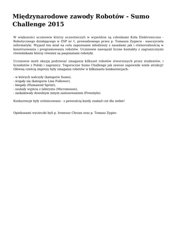 Międzynarodowe zawody Robotów - Sumo Challenge 2015 W większości uczniowie którzy uczestniczyli w wyjeździe są członkami Koła Elektroniczno Robotycznego działającego w ZSP nr 1, prowadzonego przez p. Tomasza Zygiera - nauczyciela informatyki. Wyjazd ten miał na celu zapoznanie młodzieży z zasadami jak i różnorodnością w konstruowaniu i programowaniu robotów. Uczniowie nawiązali liczne kontakty z zagranicznymi rówieśnikami którzy również są pasjonatami robotyki. Uczniowie mieli okazję podziwiać zmagania kilkuset robotów stworzonych przez studentów, i licealistów z Polski i zagranicy. Tegoroczne Sumo Challenge jak zawsze zapewniło wiele atrakcji! Główną cześcią imprezy były zmagania robotów w kilkunastu konkurencjach: - w których walczyły (kategorie Sumo), - ścigały się (kategorie Line Follower), - biegały (Humanoid Sprint), - szukały wyjścia z labiryntu (Micromouse), - zaskakiwały dowolnym innym zastosowaniem (Freestyle). Konkurencje były zróżnicowane - z pewnością każdy znalazł coś dla siebie! Opiekunami wycieczki byli p. Ireneusz Chrzan oraz p. Tomasz Zygier.