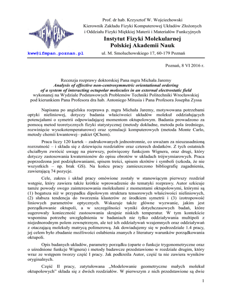 Prof. dr hab. Krzysztof W. Wojciechowski Kierownik Zakładu Fizyki Komputerowej Układów Złożonych i Oddziału Fizyki Miękkiej Materii i Materiałów Funkcyjnych Instytut Fizyki Molekularnej Polskiej Akademii Nauk [email protected] ul. M. Smoluchowskiego 17, 60,179 Poznań Poznań, 8 VI 2016 r. Recenzja rozprawy doktorskiej Pana mgra Michała Jaremy Analysis of effective non centrosymmetric orientational ordering of a system of interacting octupolar molecules in an external electrostatic field wykonanej na Wydziale Podstawowych Problemów Techniki Politechniki Wrocławskiej pod kierunkiem Pana Profesora dra hab. Antoniego Mitusia i Pana Profesora Josepha Zyssa Napisana po angielsku rozprawa p. mgra Michała Jaremy, motywowana potrzebami optyki nieliniowej, dotyczy badania właściwości układów molekuł oddziałujących potencjałami o symetrii odpowiadającej momentom oktupolowym. Badania prowadzono za pomocą metod teoretycznych fizyki statystycznej (metody dokładne, metoda pola średniego, rozwinięcie wysokotemperaturowe) oraz symulacji komputerowych (metoda Monte Carlo, metody chemii kwantowej– pakiet QChem). Praca liczy 120 kartek – zadrukowanych jednostronnie, co uważam za nieuzasadnioną rozrzutność – i składa się z dziewięciu rozdziałów oraz czterech dodatków. Z tych ostatnich chciałbym zwrócić uwagę na pierwszy, poświęcony funkcjom Wignera, oraz drugi, który dotyczy zastosowania kwaternionów do opisu obrotów w układach trójwymiarowych. Praca poprzedzona jest podziękowaniami, spisem treści, spisem skrótów i symboli (szkoda, że nie wszystkich – np. brak GS). Na końcu pracy zamieszczono bibliografię zagadnienia, zawierającą 74 pozycje. Cele, zakres i układ pracy omówione zostały w stanowiącym pierwszy rozdział wstępie, który zawiera także krótkie wprowadzenie do tematyki rozprawy. Autor szkicuje tamże powody swego zainteresowania molekułami z momentami oktupolowymi, którymi są (1) bogatsza niż w przypadku dipolowym struktura tensorowych właściwości nieliniowych, (2) słabsza tendencja do tworzenia klasterów ze środkiem symetrii i (3) izotropowość liniowych parametrów optycznych. Wskazuje także główne wyzwanie, jakim jest porządkowanie oktupoli, a w szczególności wyniki dotychczasowych badań, które sugerowały konieczność zastosowania skrajnie niskich temperatur. W tym kontekście wspomina potrzebę uwzględnienia w badaniach nie tylko oddziaływania multipoli z niejednorodnym polem zewnętrznym, ale też ich oddziaływań wzajemnych oraz oddziaływań z otaczającą molekuły matrycą polimerową. Jak dowiadujemy się w podrozdziale 1.4 pracy, jej celem było zbadanie możliwości osłabienia znanych z literatury warunków porządkowania oktupoli. Opis badanych układów, parametry porządku (oparte o funkcje trygonometryczne oraz o uśrednione funkcje Wignera) i metody badawcze przedstawiono w rozdziale drugim, który wraz ze wstępem tworzy część I pracy. Jak podkreśla Autor, część ta nie zawiera wyników oryginalnych. Część II pracy, zatytułowana „Modelowanie geometryczne małych molekuł oktupolowych” składa się z dwóch rozdziałów. W pierwszym z nich przedstawione są dwie 1 dwu, (nazwane 3AO i 6AO) i dwie trójwymiarowe (nazwane tetraedryczną, TO, i kubiczną, CO) modelowe molekuły z momentem oktupolowym. Wypada tu dodać, że molekuły 3AO i CO posiadają izotropowy moment kwadrupolowy. Dyskutowana jest też symetryzacja i norma parametru porządku. W kolejnym rozdziale przeprowadzono analizę parametrów molekuł modelowych i realnych (TATB – trój,amino,trój,nitro,benzen) oraz dokonano oceny temperatury, w której można realizować uporządkowanie oktupolowe rzędu 1%, które jest wystarczające w doświadczeniu. Temperaturę tę można przybliżyć wyrażeniem 30 HE/kB . W skład części III pracy, pt. „Nieoddziałujące molekuły w polu zewnętrznym”, również wchodzą dwa rozdziały. W pierwszym z nich badane są płaskie molekuły na płaszczyźnie. Głównym rezultatem tych badań jest pokazanie, że temperatura wymagana dla uporządkowania oktupolowego jest rzędu kilku stopni Kelwina, a więc o 3 rzędy wyższa od wcześniejszych oszacowań literaturowych. W celu dalszego podniesienia temperatury uporządkowania oktupolowego – aż do temperatur azotowych – Doktorant zaproponował w tym rozdziale dekorację oktupoli za pomocą dipoli. Ponieważ pomysł ten wydaje mi się – delikatnie mówiąc – co najmniej dziwaczny, gdyż – moim zdaniem – niszczy dyskutowane wcześniej zalety wynikające z czystego porządku oktupolowego, mam nadzieję, że podczas obrony sprawa ta zostanie wyjaśniona. W drugim z rozdziałów wchodzących w skład części III badano oktupole trójwymiarowe. Temperatury oszacowane dla porządku oktupolowego okazały się podobne jak w przypadku planarnym. Dla polepszenia uporządkowania Autor rozprawy zaleca więc nie wybór szczególnych geometrii cząstek, lecz raczej użycie wyższych pól i zwiększenie momentu oktupolowego molekuł. Część IV pracy dotyczy oddziaływań elektrostatycznych i składa się z trzech rozdziałów, z których pierwszy, a więc siódmy rozdział pracy omawia przypadek planarny. Autor wskazuje w nim, że klaster siedmiu cząstek 3AO wykazuje „oktupolarność” w temperaturze 14 K. Temperatura ta rośnie o czynnik 4 w przypadku zastąpienia takiego klastra przez duży układ sieciowy. Jednakże, kiedy środki cząstek mogą się poruszać, a więc gdy nie muszą tworzyć sieci, uporządkowanie oktupolowe zostaje zniszczone w efekcie klasteryzacji. W rozdziale tym otrzymano jeszcze dwa wyniki warte wzmianki. Po pierwsze, w przypadku oktupoli punktowych energia maleje jak odwrotność siódmej potęgi odległości. Po drugie, przybliżenie pola średniego sugeruje uporządkowanie oktupolowe w temperaturach azotowych. Przypadek molekuł planarnych w przestrzeni rozważany jest w rozdziale ósmym. Ś