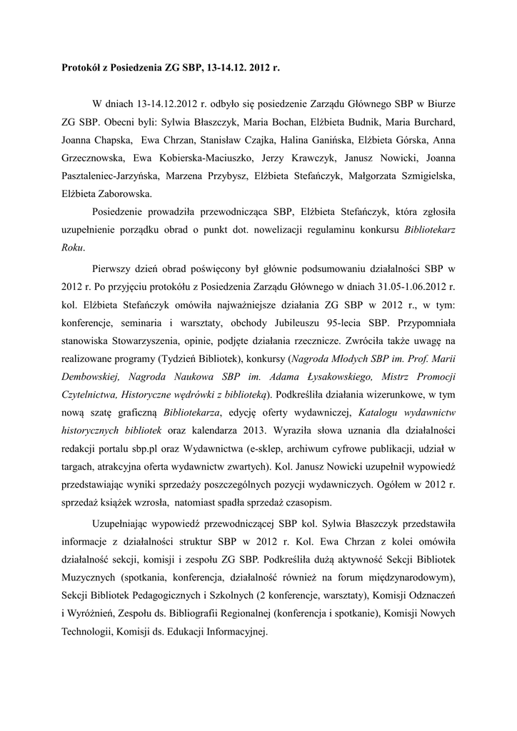 Protokół z Posiedzenia ZG SBP, 13-14.12. 2012 r. W dniach 13-14.12.2012 r. odbyło się posiedzenie Zarządu Głównego SBP w Biurze ZG SBP. Obecni byli: Sylwia Błaszczyk, Maria Bochan, Elżbieta Budnik, Maria Burchard, Joanna Chapska, Ewa Chrzan, Stanisław Czajka, Halina Ganińska, Elżbieta Górska, Anna Grzecznowska, Ewa Kobierska-Maciuszko, Jerzy Krawczyk, Janusz Nowicki, Joanna Pasztaleniec-Jarzyńska, Marzena Przybysz, Elżbieta Stefańczyk, Małgorzata Szmigielska, Elżbieta Zaborowska. Posiedzenie prowadziła przewodnicząca SBP, Elżbieta Stefańczyk, która zgłosiła uzupełnienie porządku obrad o punkt dot. nowelizacji regulaminu konkursu Bibliotekarz Roku. Pierwszy dzień obrad poświęcony był głównie podsumowaniu działalności SBP w 2012 r. Po przyjęciu protokółu z Posiedzenia Zarządu Głównego w dniach 31.05-1.06.2012 r. kol. Elżbieta Stefańczyk omówiła najważniejsze działania ZG SBP w 2012 r., w tym: konferencje, seminaria i warsztaty, obchody Jubileuszu 95-lecia SBP. Przypomniała stanowiska Stowarzyszenia, opinie, podjęte działania rzecznicze. Zwróciła także uwagę na realizowane programy (Tydzień Bibliotek), konkursy (Nagroda Młodych SBP im. Prof. Marii Dembowskiej, Nagroda Naukowa SBP im. Adama Łysakowskiego, Mistrz Promocji Czytelnictwa, Historyczne wędrówki z biblioteką). Podkreśliła działania wizerunkowe, w tym nową szatę graficzną Bibliotekarza, edycję oferty wydawniczej, Katalogu wydawnictw historycznych bibliotek oraz kalendarza 2013. Wyraziła słowa uznania dla działalności redakcji portalu sbp.pl oraz Wydawnictwa (e-sklep, archiwum cyfrowe publikacji, udział w targach, atrakcyjna oferta wydawnictw zwartych). Kol. Janusz Nowicki uzupełnił wypowiedź przedstawiając wyniki sprzedaży poszczególnych pozycji wydawniczych. Ogółem w 2012 r. sprzedaż książek wzrosła, natomiast spadła sprzedaż czasopism. Uzupełniając wypowiedź przewodniczącej SBP kol. Sylwia Błaszczyk przedstawiła informacje z działalności struktur SBP w 2012 r. Kol. Ewa Chrzan z kolei omówiła działalność sekcji, komisji i zespołu ZG SBP. Podkreśliła dużą aktywność Sekcji Bibliotek Muzycznych (spotkania, konferencja, działalność również na forum międzynarodowym), Sekcji Bibliotek Pedagogicznych i Szkolnych (2 konferencje, warsztaty), Komisji Odznaczeń i Wyróżnień, Zespołu ds. Bibliografii Regionalnej (konferencja i spotkanie), Komisji Nowych Technologii, Komisji ds. Edukacji Informacyjnej. Następnie głos zabrał kol. Stanisław Czajka, honorowy przewodniczący SBP, który podkreślił, że pozycje wydawane przez Stowarzyszenie w 2012 r. były na bardzo wysokim poziomie i cieszyły się dużym uznaniem czytelników. Jest to o tyle istotne, że oferta książkowa zrekompensowała stratę ze sprzedaży czasopism. Wyraził niepokój, co do sprzedaży czasopism; zaproponował oddzielną dyskusję na ten temat w innym terminie. Anna Grzecznowska, dyrektor Biura ZG SBP stwierdziła, że spośród warsztatów organizowanych przez Stowarzyszenie dużym powodzeniem cieszyły się warsztaty poświęcone portalom społecznościowym pt. „Twitter nie tylko w bibliotece”. Przestawiła także rozpoczętą w grudniu akcję „Wyobraźnia czyni cuda – wyczaruj z nami magiczną bibliotekę” na rzecz Biblioteki w Szpitalu Dziecięcym przy ul. Niekłańskiej w Warszawie. W kolejnym punkcie porządku obrad kol. Elżbieta Górska przedstawiła zrealizowane w okresie czerwiec-grudzień 2012 r. zadania w ramach Strategii Stowarzyszenia Bibliotekarzy Polskich na lata 2010-2021: - działania rzecznicze dot. projektu ustawy o bibliotekach (prowadzone m. in. w okręgach dolnośląskim, lubuskim, podkarpackim), cykl artykułów w Bibliotekarzu poświęcony poszczególnym zapisom ustawy, konsultacje z Konferencją Dyrektorów Wojewódzkich Bibliotek Publicznych, Konferencją Dyrektorów Bibliotek Akademickich Szkół Polskich, Konferencją Dyrektorów Wojewódzkich Bibliotek Pedagogicznych; uzyskano pozytywne opinie tych trzech środowisk; - badania efektywności bibliotek publicznych i pedagogicznych. Trwały prace nad kwestionariuszem badania satysfakcji użytkowników bibliotek. W ramach promocji prac Zespołu, kierownik zadania – Lidia Derfert-Wolf zaprezentowała wyniki prac na spotkaniu Konferencji Dyrektorów WBP w Gdańsku oraz podczas konferencji z cyklu „Automatyzacja bibliotek publicznych”. Równocześnie trwały prace nad oprogramowaniem komputerowym jako narzędziem do zbierania danych statystycznych i prowadzenia badań porównawczych; - opracowanie systemu akredytacji profesjonalnej SBP – opracowano raport nt. systemu akredytacji w Stanach Zjednoczonych, Wielkiej Brytanii i Australii. Jest przygotowywany podręcznik akredytacji w postaci elektronicznej; - współpraca SBP z instytucjami kształcącymi bibliotekarzy i pracowników informacji; 7 grudnia odbyło się spotkanie przedstawicieli SBP z reprezentantami instytutów bibliotekoznawczych, podczas którego zaprezentowano projekt ustawy o bibliotekach (dr B. Budyńska) oraz prace Zespołu ds. akredytacji profesjonalnej SBP (dr hab. M. Próchnicka). Przedstawione prezentacje spotkały się z pozytywnym odbiorem i uzyskały rekomendację do dalszych działań; - fundraising; dofinansowane jest przez FRSI szkolenie pracownika Biura ZG – Małgorzaty Woźniak, który realizuje akcję „Wyobraźnia czyni cuda – wyczaruj z nami magiczną bibliotekę”; - kreowanie atrakcyjnego wizerunku SBP: program ofert ulg i bonusów – na portalu sbp.pl została przeprowadzona wśród członków Stowarzyszenia ankieta na temat oczekiwań w zakresie programu ulg i bonusów. Wyniki badania ankietowego zostały uwzględnione w pracach Zespołu opracowującego Regulamin przyznawania ulg i bonusów członkom SBP w roku 2013. Elżbieta Górska przedstawiła regulamin oraz projekt legitymacji członkowskiej w formie kart plastikowych z hologramami, a także propozycje etapowego wdra