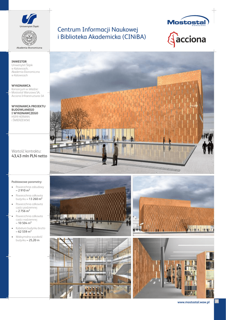 U n i w e r s y t e t Śl ąs k i Centrum Informacji Naukowej i Biblioteka Akademicka (CINiBA) A k a d e m i a E k o n o m i c z n a INWESTOR Uniwersytet Śląski w Katowicach, Akademia Ekonomiczna w Katowicach WYKONAWCA Konsorcjum w składzie: Mostostal Warszawa SA, Acciona Infraestructuras SA WYKONAWCA PROJEKTU BUDOWLANEGO I WYKONAWCZEGO HS99 HERMAN i ŚMIERZEWSKI Wartość kontraktu: 43,43 mln PLN netto Podstawowe parametry: • Powierzchnia zabudowy – 2 910 m2 • Powierzchnia całkowita budynku – 13 260 m2 • Powierzchnia całkowita części podziemnej – 2 756 m2 • Powierzchnia całkowita części nadziemnej – 10 504 m2 • Kubatura budynku brutto – 62 559 m3 • Maksymalna wysokość budynku – 25,20 m www.mostostal.waw.pl 01 U n i w e r s y t e t Śl ąs k i Centrum Informacji Naukowej i Biblioteka Akademicka (CINiBA) A k a d e m i a E k o n o m i c z n a Centrum Informacji Naukowej i Biblioteka Akademicka to wspólny projekt Uniwersytetu Śląskiego i Akademii Ekonomicznej w Katowicach. Budowany obiekt spełniać będzie standardy XXI wieku i pozwoli na poprawę jakości kształcenia poprzez zwiększenie potencjału badawczego oraz dostępności fachowej literatury naukowej w regionie. Wzmocni również rolę obu uczelni w międzynarodowych relacjach akademickich. Centrum Informacji Naukowej i Biblioteka Akademicka będzie tzw. biblioteką hybrydową, gdzie równolegle udostępniane będą wszystkie typy dokumentów, niezależnie od nośnika na jakim się znajdują: książki, czasopisma, bazy danych, teksty elektroniczne, materiały audiowizualne, multimedialne oraz zbiory dostosowane do specjalnych grup użytkowników (np. osób niepełnosprawnych). Wszystko dzięki dostarczeniu nowoczesnych narzędzi niezbędnych do badania polskiego i światowego piśmiennictwa naukowego. Ponadto, Centrum będzie przeznaczone również dla ogółu społeczeństwa pełniąc funkcję salonu intelektualnego miasta i regionu, gdzie przewidziano miejsce na tzw. „niebiblioteczne” funkcje, jakie spełniać będzie między innymi sala konferencyjna i aneks wystawowy. Gmach nowej biblioteki składać się będzie z dwóch prostokątnych brył – większej, 3 kondygnacyjnej, o wymiarach 63,75 m na 46,25 m oraz nadbudowanej na niej mniejszej, również 3 piętrowej, o rozmiarach 48,75 m na 16,25 m. Na parterze znajdzie się holl główny, do którego przylegać będą czytelnie i wypożyczalnie, sala konferencyjna, sala dydaktyczna, kawiarnia i pomieszczenia towarzyszące. Dwa piętra przeznaczone zostaną na księgozbiory, czytelnie główne i specjalistyczne oraz pomieszczenia dla bibliotekarzy i pracowników zaplecza administracyjnego. W mniejszej części budynku zaplanowano pomieszczenia dla pracowników działu gromadzenia i opracowania zbiorów oraz sale zbiorów nietypowych i zbiorów chronionych. Mostostal Warszawa SA należy do ścisłej elity polskich przedsiębiorstw przemysłowych i ma za sobą 65 lat bogatej tradycji. Swoją działalność prowadzi we wszystkich kluczowych segmentach rynku budowlanego w kraju i Europie. Występując w roli generalnego wykonawcy inwestycji realizujemy wszelkiego rodzaju obiekty z zakresu budownictwa inżynierskiego, ogólnego, przemysłowego, ochrony środowiska, energetyki oraz infrastruktury drogowej. W naszym działaniu łączymy etos i wieloletnią tradycję polskiej myśli inżynierskiej z profesjonalną organizacją i szerokim wykorzystaniem najnowocześniejszych technologii. Portfolio wykonanych inwestycji obejmuje osiedla mieszkaniowe, budynki biurowe i użyteczności publicznej. Spółka może pochwalić się wieloma referencjami w zakresie generalnego wykonawstwa obiektów wielkokubaturowych: stadionów i hal sportowych, centrów handlowych, kompleksów magazynowych oraz hal przemysłowych. Mostostal Warszawa SA realizuje też liczne projekty w sferze szkolnictwa, kultury i sportu. Budujemy obiekty uczelniane dla uniwersytetów w Poznaniu, Toruniu, Opolu oraz dla Akademii Medycznej we Wrocławiu. Stawiamy budynki dla Śląskiego Międzyuczelnianego Centrum Edukacji i Badań Interdyscyplinarnych w Chorzowie, a także rozbudowujemy bazę dydaktyczną łódzkiej szkoły filmowej. Jesteśmy wykonawcami siedziby Filharmonii Warmińsko-Mazurskiej w Olsztynie oraz Narodowego Forum Muzyki we Wrocławiu. Na zlecenie samorządów oraz uczelni wyższych uczestniczymy w rozbudowie akademickich oraz gminnych i miejskich obiektów sportowych. Acciona SA, to główny udziałowiec Mostostalu Warszawa SA i partner w realizacji budowy Centrum Informacji Naukowej i Biblioteki Akademickiej. Hiszpańska spółka, jest notowana na madryckiej giełdzie i działa w 60 krajach na 6 kontynentach – w Europie, obu Amerykach, Azji, Afryce i Australii. 02 Mostostal Warszawa S.A., ul. Konstruktorska 11a, 02-673 Warszawa tel.: + 48 22 54 85 000, fax: + 48 22 54 85 666 e-mail: [email protected] www.mostostal.waw.pl www.ciniba.us.edu.pl www.ciniba.ae.katowice.pl